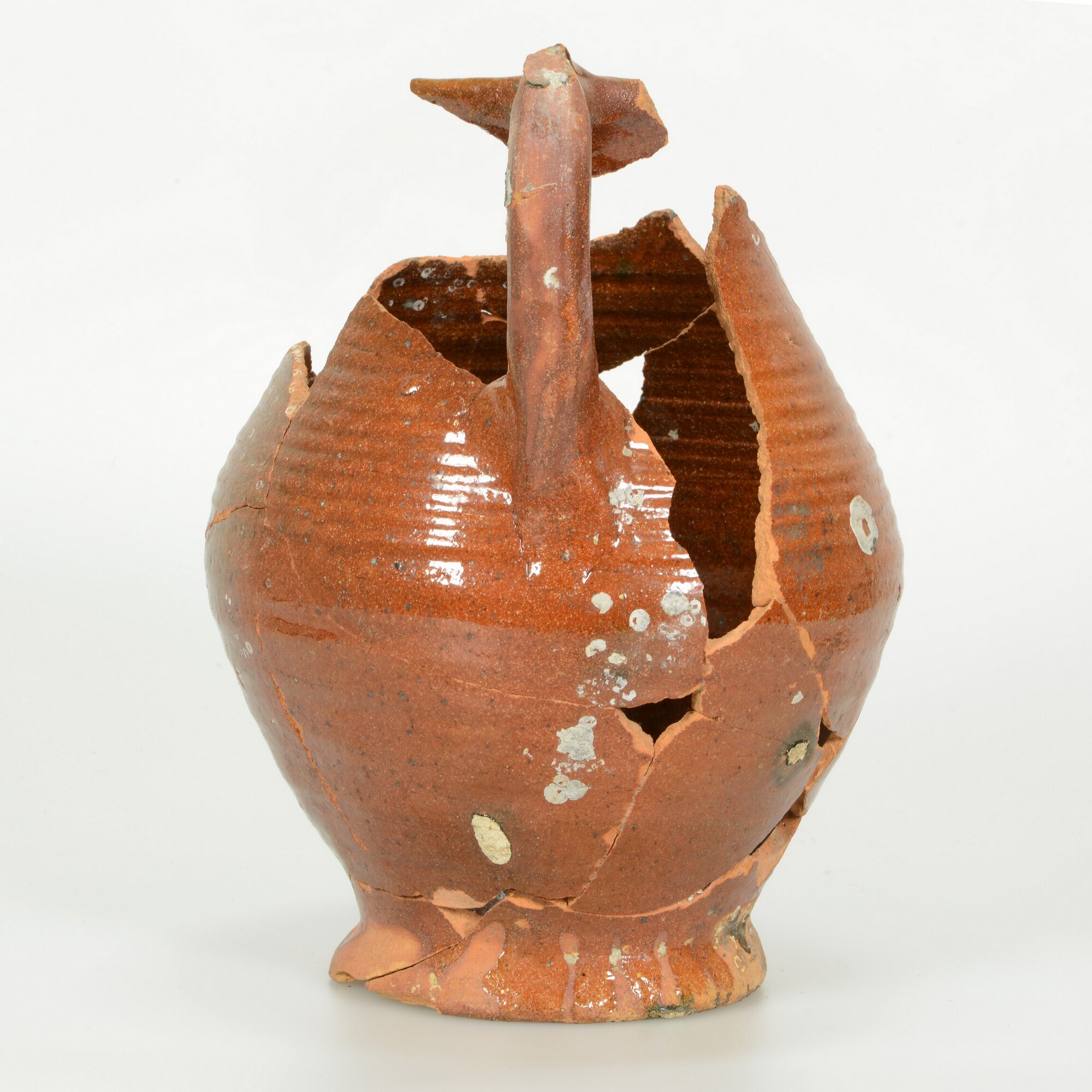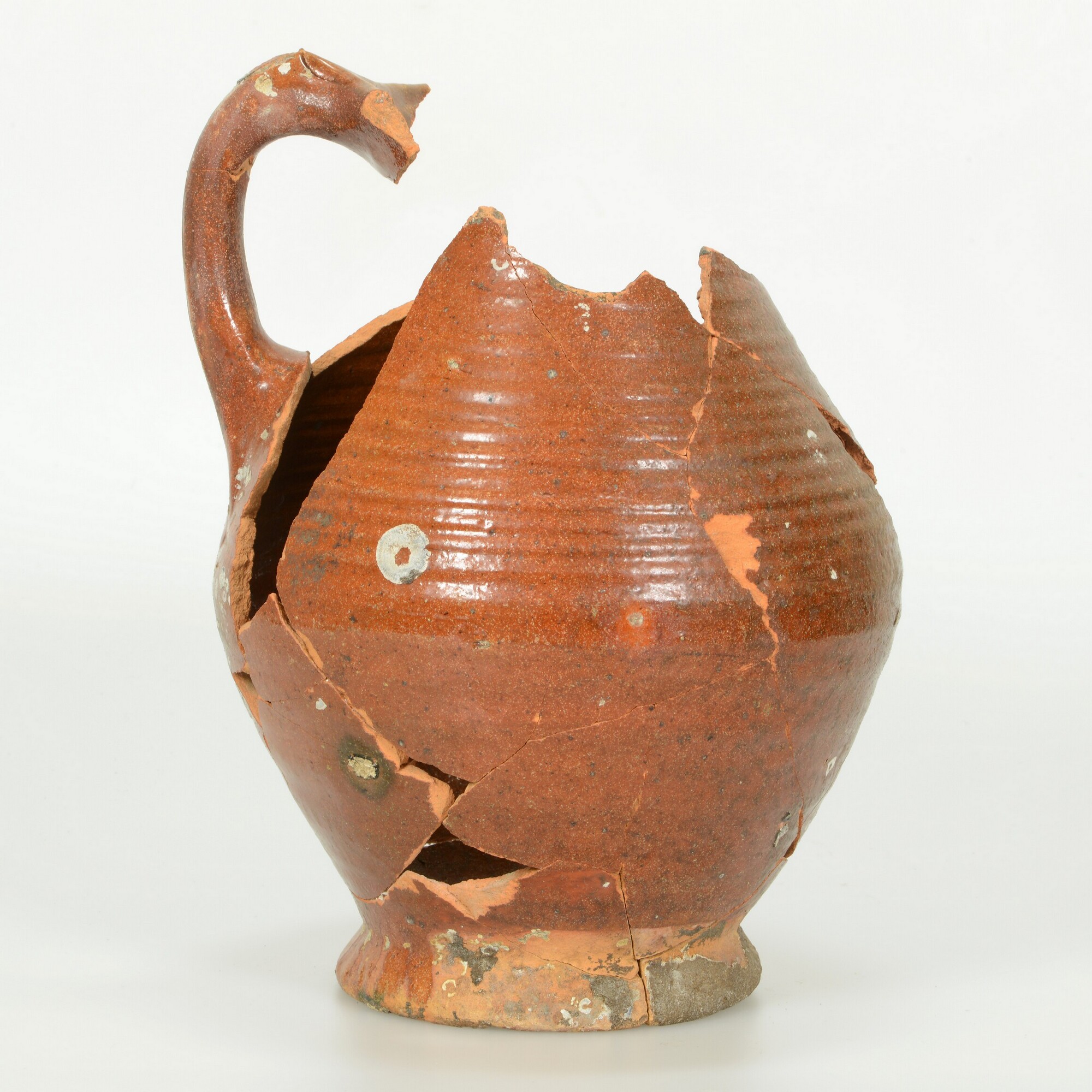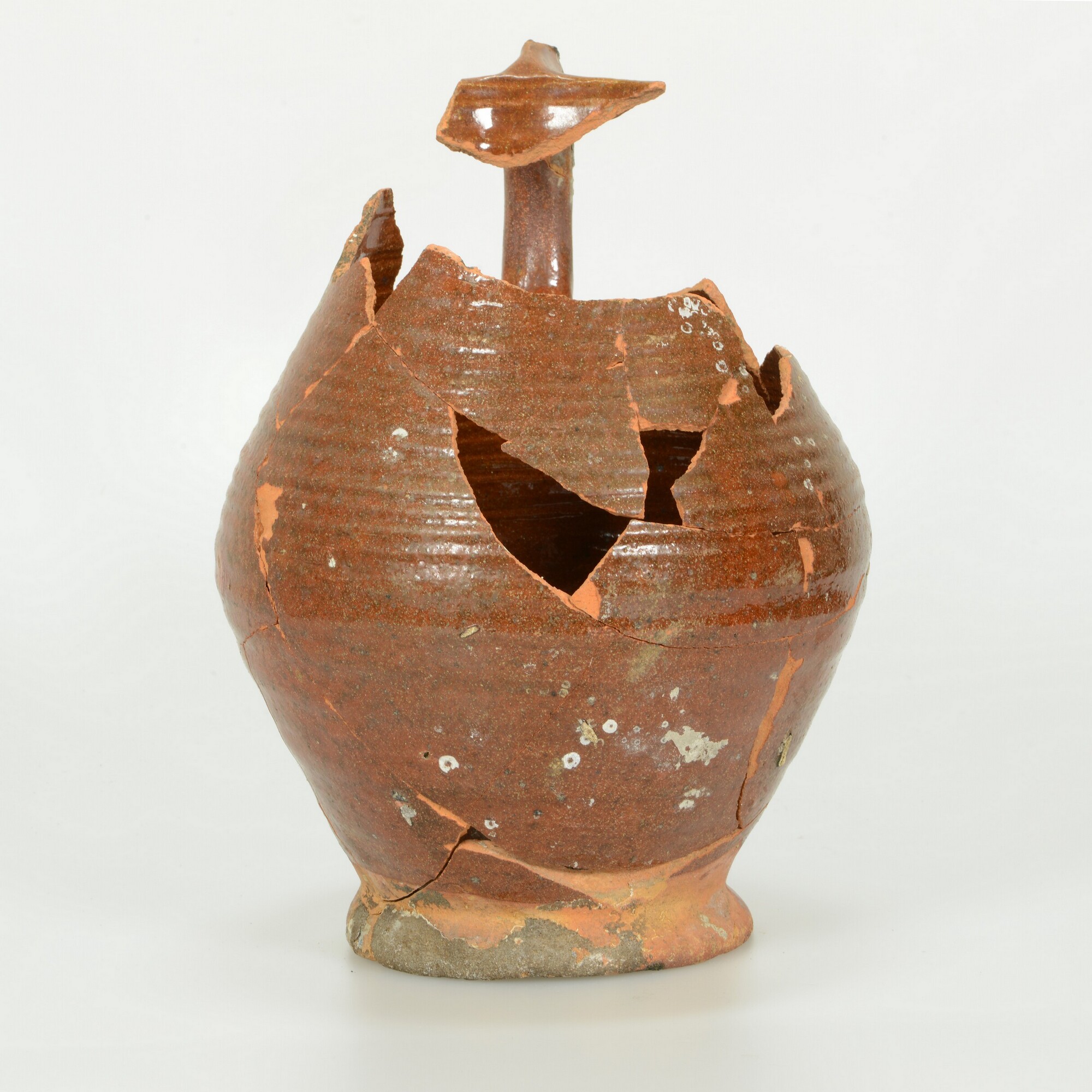 Kan; r-kan-57; kan met afgeronde buikknik en rechte rand, op standring; roodbakkend aardewerk; loodglazuur; ingeknepen worstoor; herkomst: Nederland