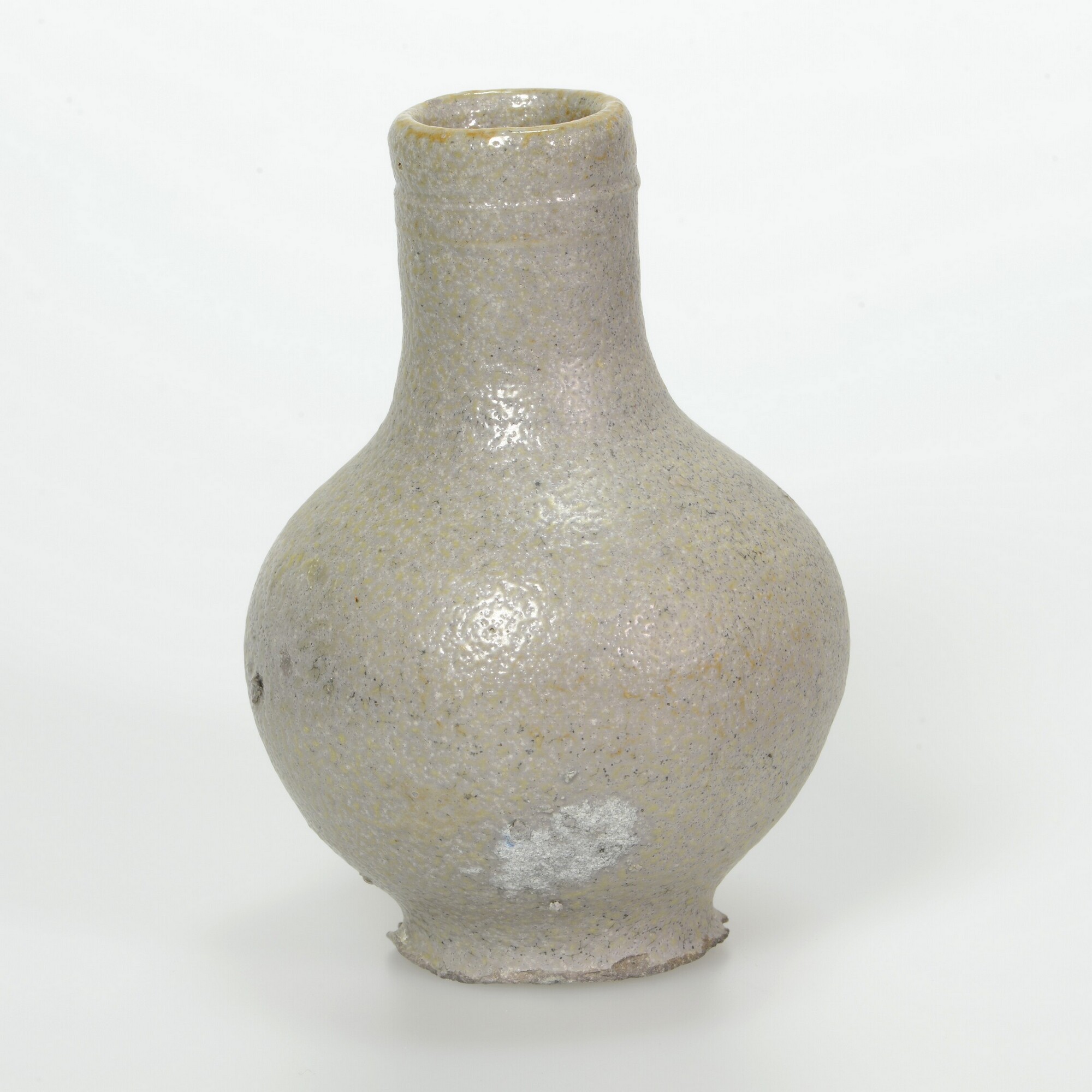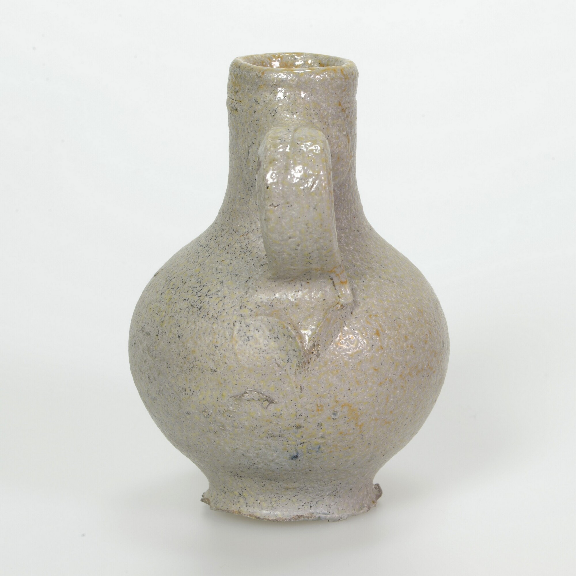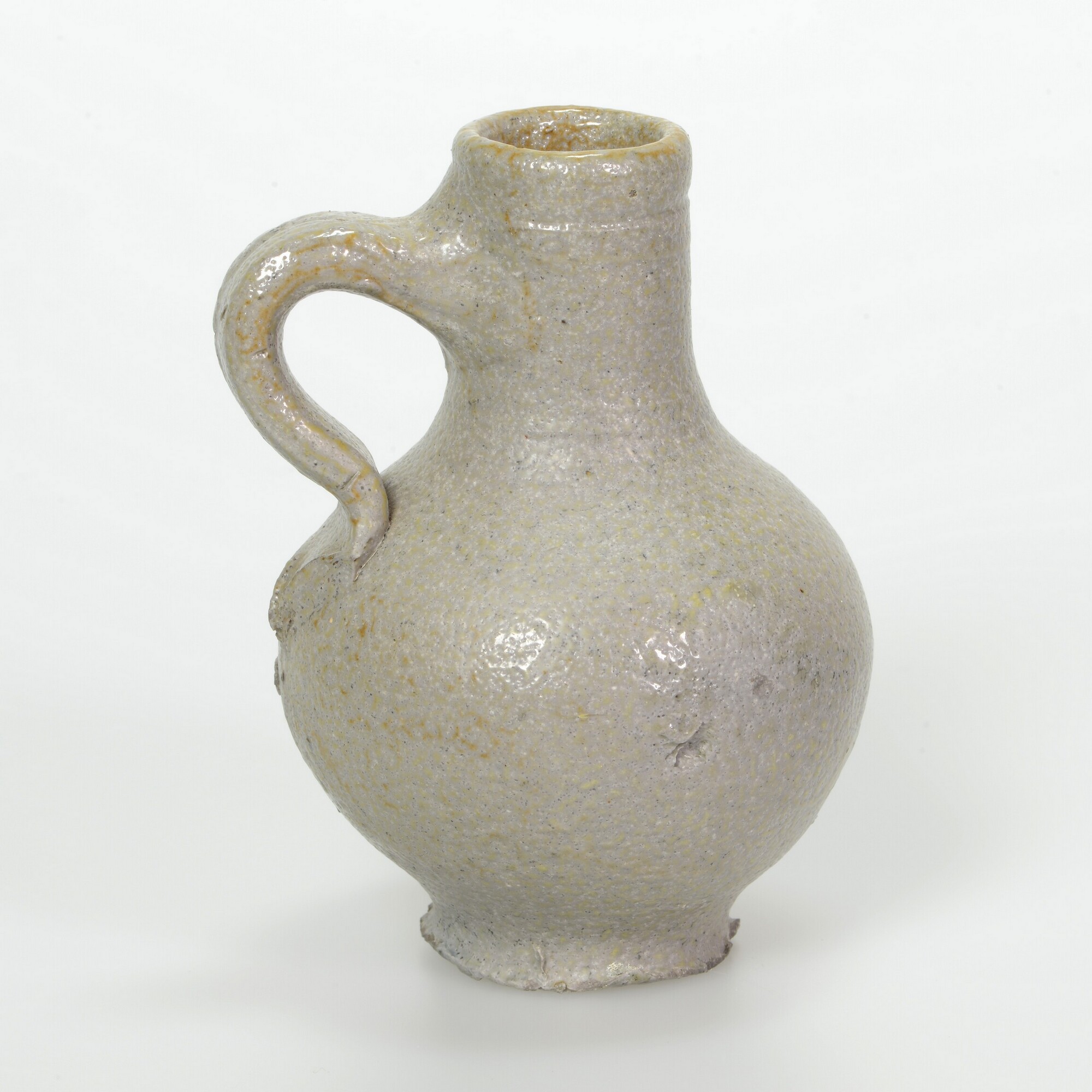Kan, oliekruik; s2-kan-44; bolle kan met hoge cilindrische hals, groef onderlangs de rechte rand, op standvlak; bandoor met staart; steengoed met zoutglazuur; herkomst: Frechen