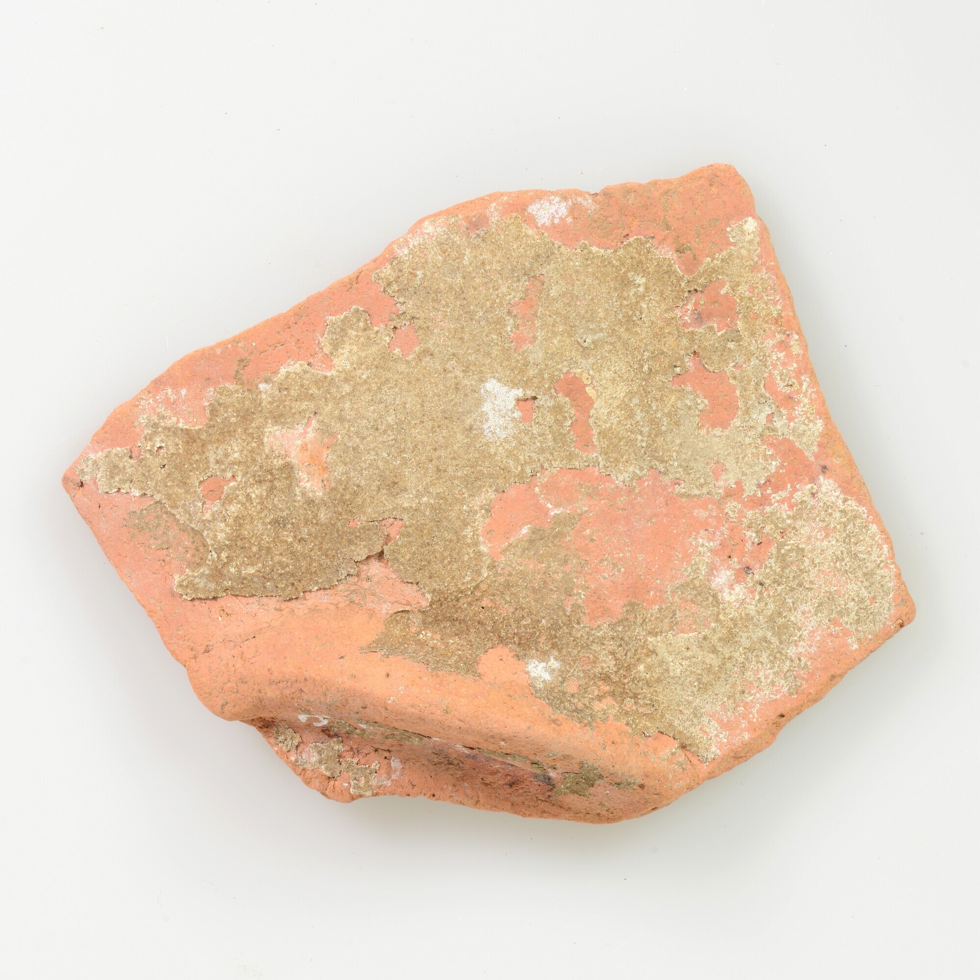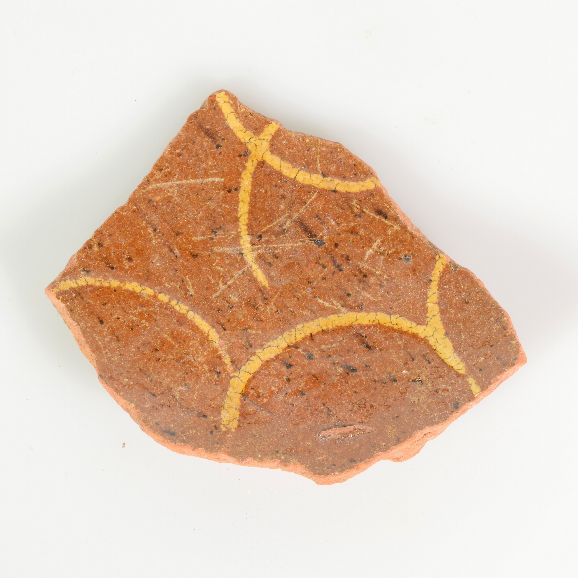 Bord/schotel; r-bor-1 of r-bor-6; bodemfragment; roodbakkend aardewerk; inwendig loodglazuur; versierd met slibboogjes; oorspronkelijk drie lobvoeten (1 bewaard); herkomst: West-Nederland