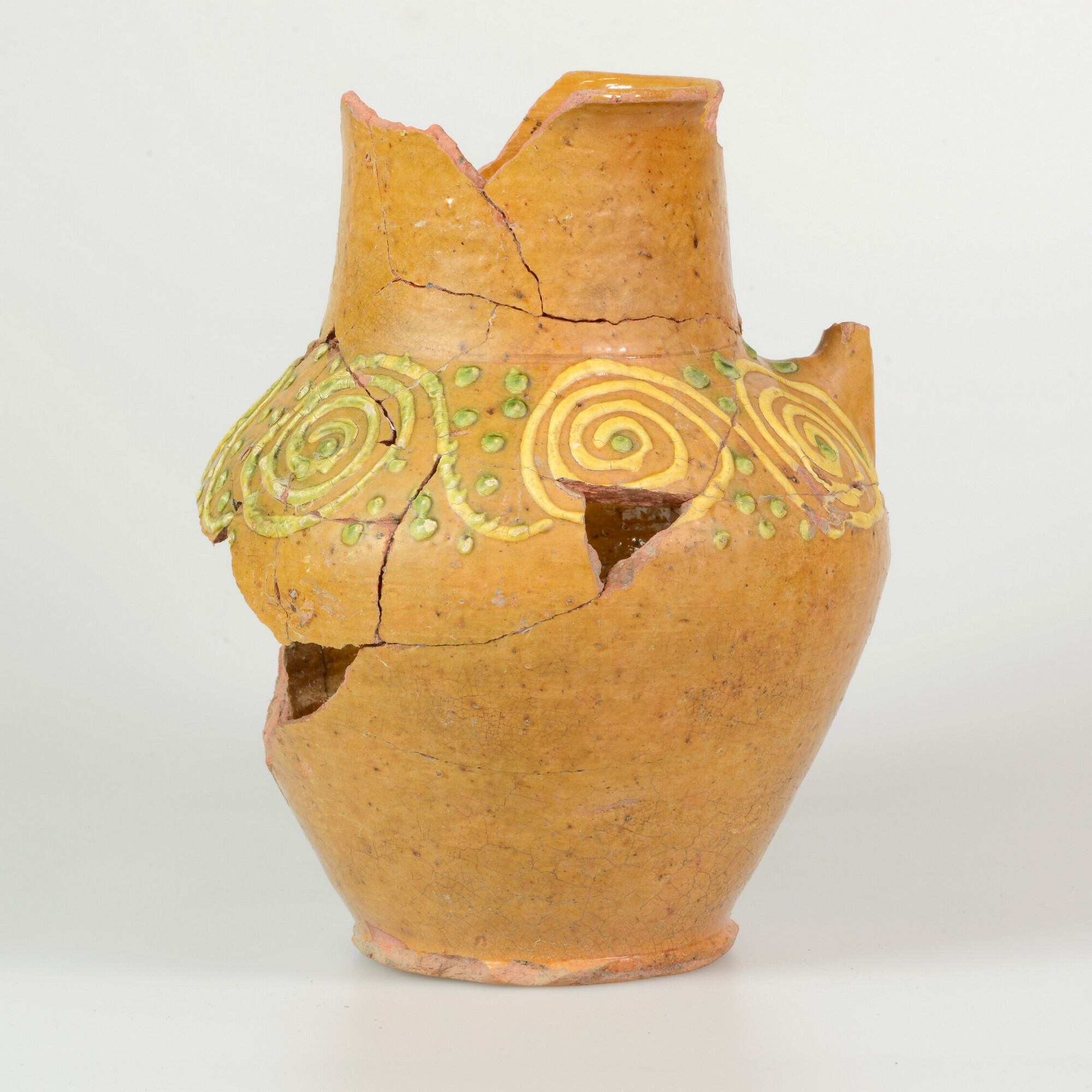Kan; r-kan-; kan met hoge rechte hals en iets uitstaande rand; roodbakkend aardewerk; in- en uitwendig loodglazuur; standvlak; verticaal oor; op de schouder gele en groene ringeloorversiering van spiralen en punten