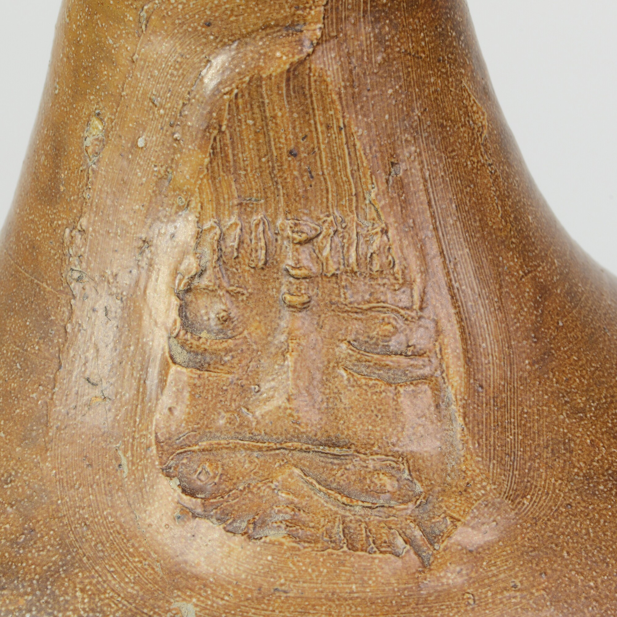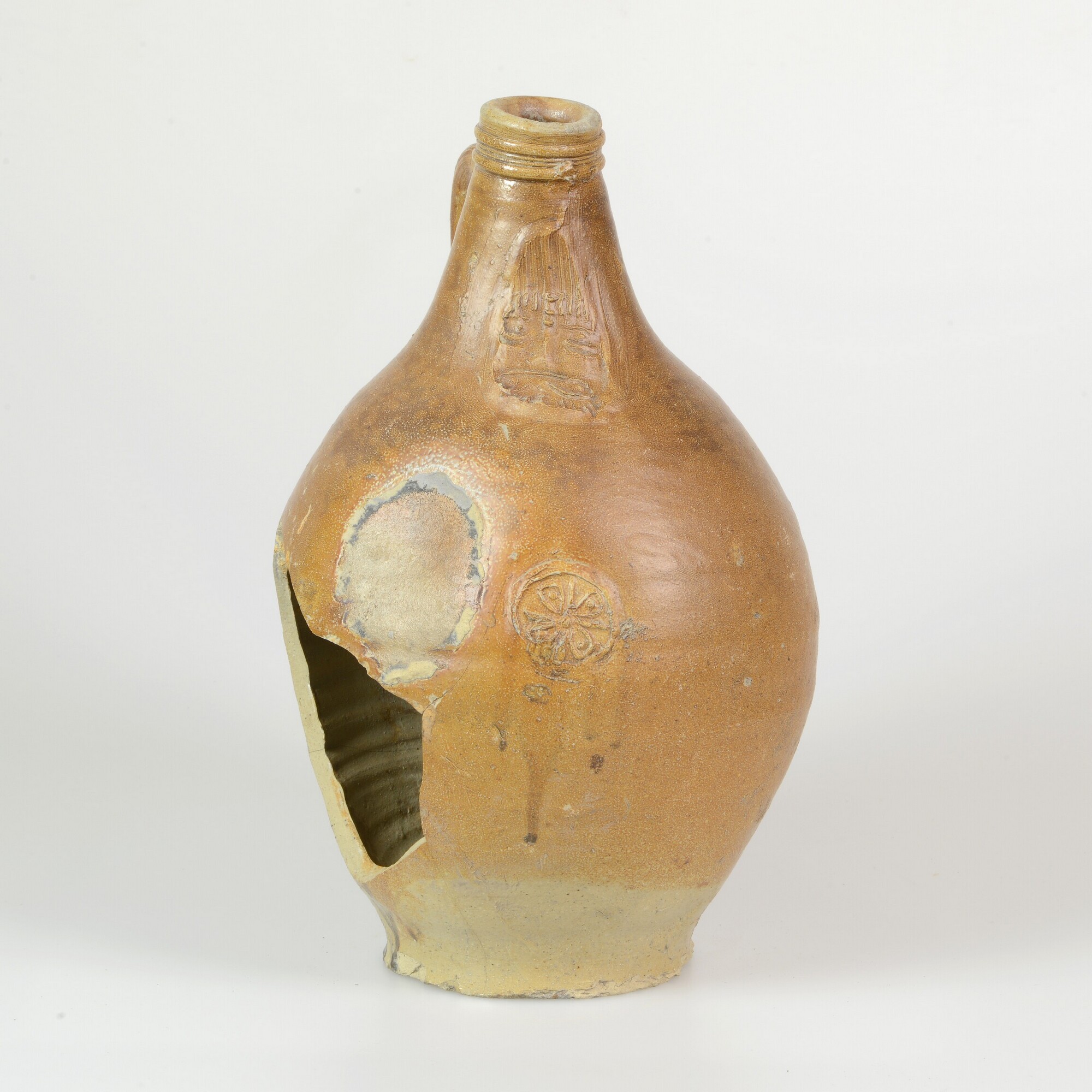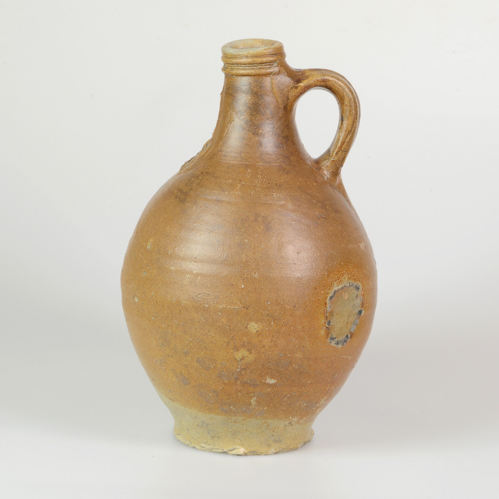 Baardmankruik; kan; s2-kan-32; bolle kan met schouder overgaand in hoge hals met geribbelde kraagrand; steengoed met zoutglazuur, ijzerengobe; baardman op hals, rozet op de buik; standvlak; een verticaal worstoor; enkele beschadigde en ingedeukte plekken op de wand, waar mogelijk een ander object tegenaan heeft gestaan?