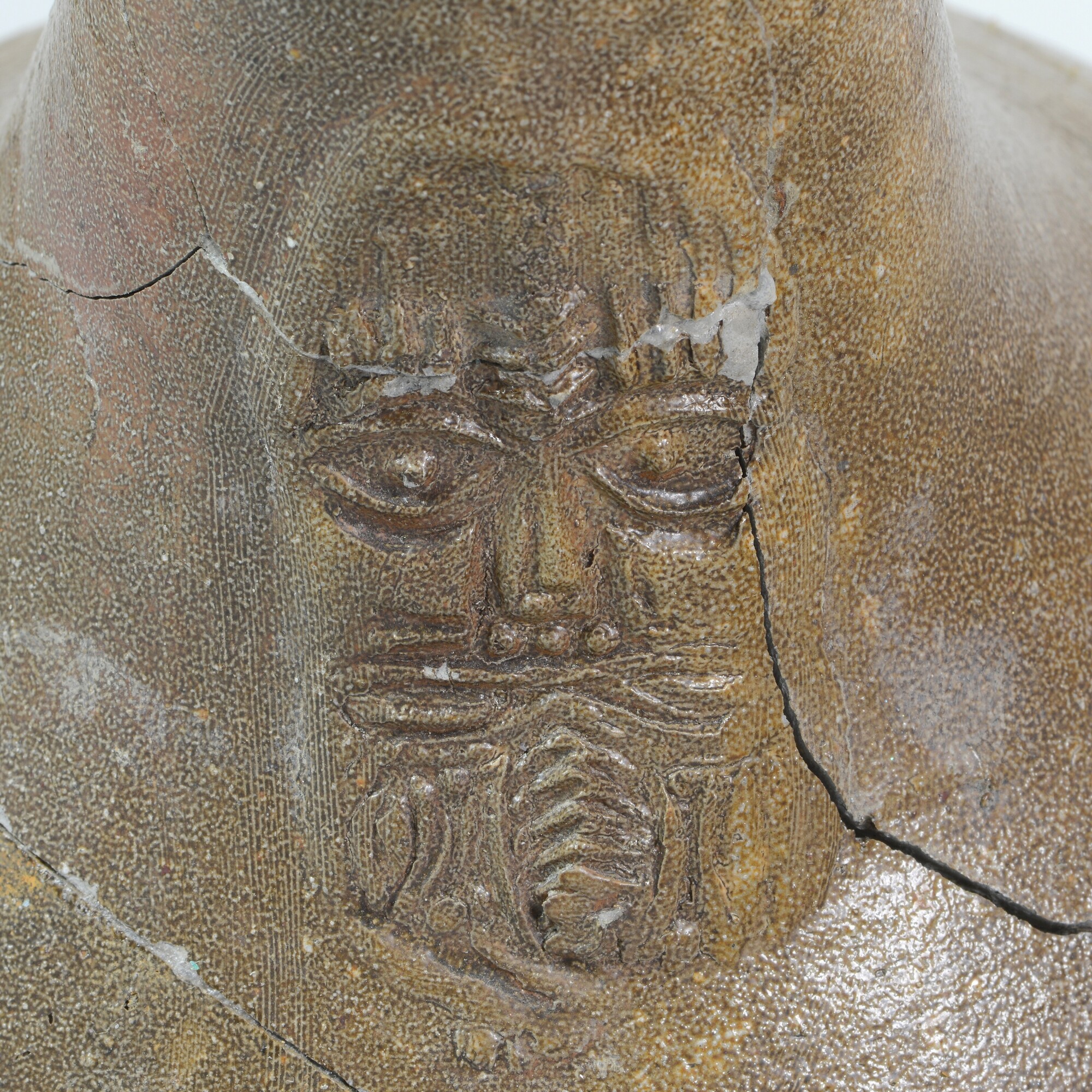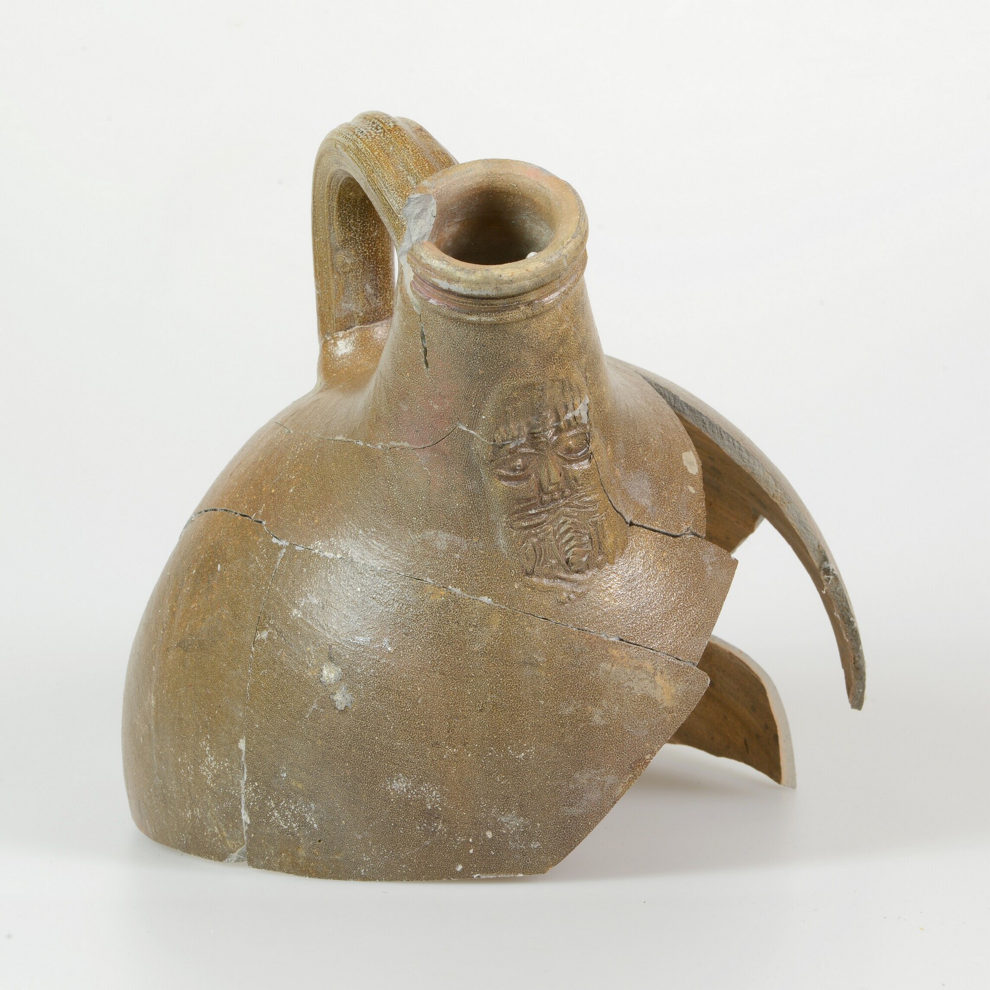 Baardmankruik; kan; s2-kan-32; bolle kan met schouder overgaand in hoge hals met geribbelde kraagrand; steengoed met zoutglazuur, ijzerengobe; baardman op hals; een verticaal worstoor; een beschadigde en ingedeukte plek op de wand, waar mogelijk een ander object tegenaan heeft gestaan?