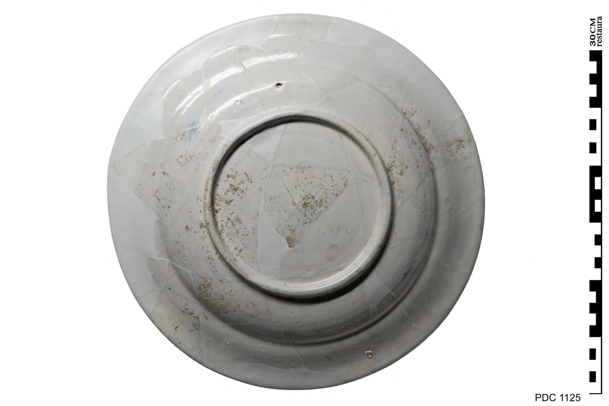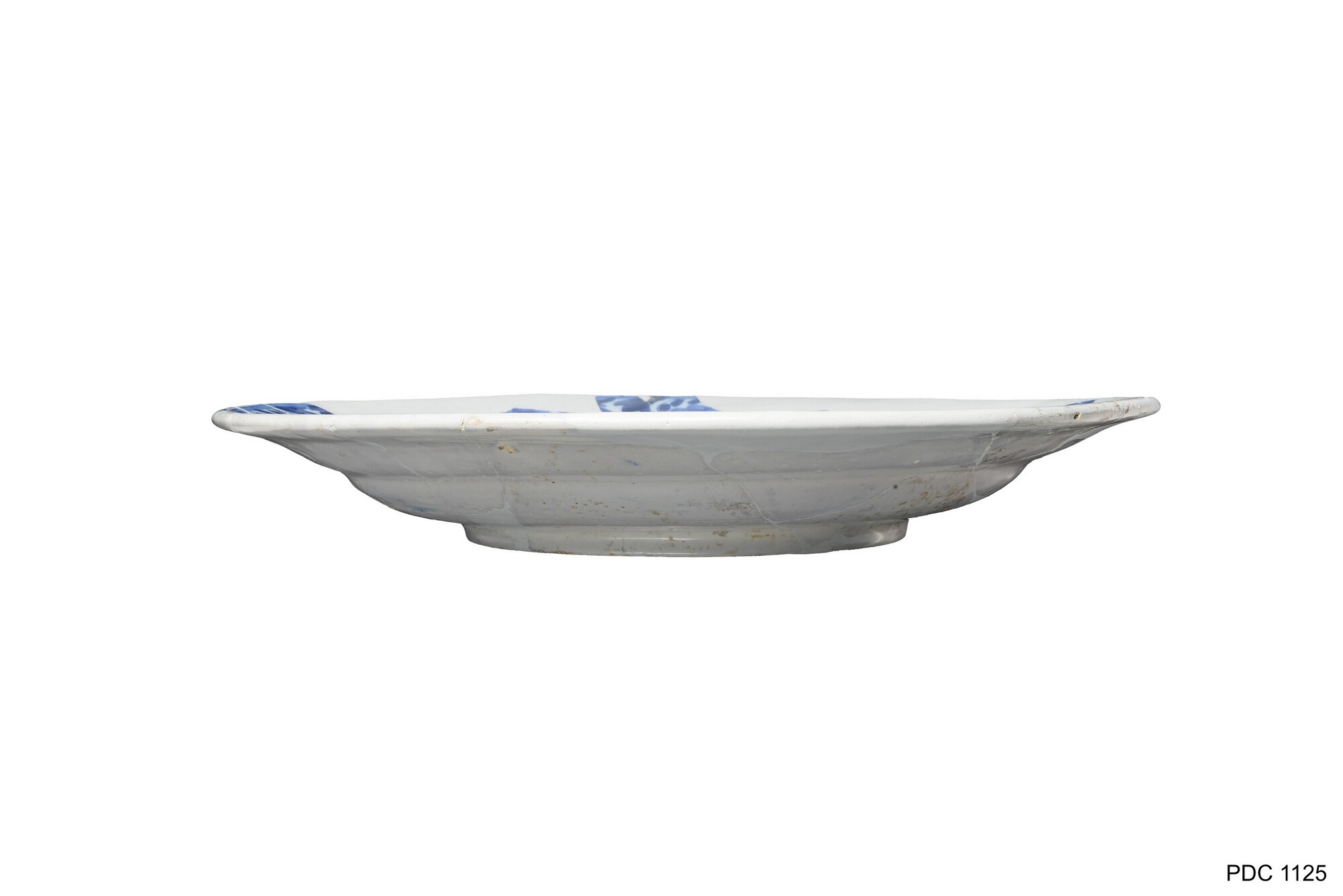 Bord; f-bor-1; bord met knik spiegel-vlag, standring; faience; tinglazuur; blauwe beschildering; spiegel: Christus hangt aan het kruis, Maria en Johannes rouwen aan weerszijden van hem, boven op het kruis een rechthoekige cartouche met INKDI (Jezus van Nazareth Koning der Joden); vlag: gekrulde bladertakken met bloemen; herkomst: vermoedelijk Haarlem