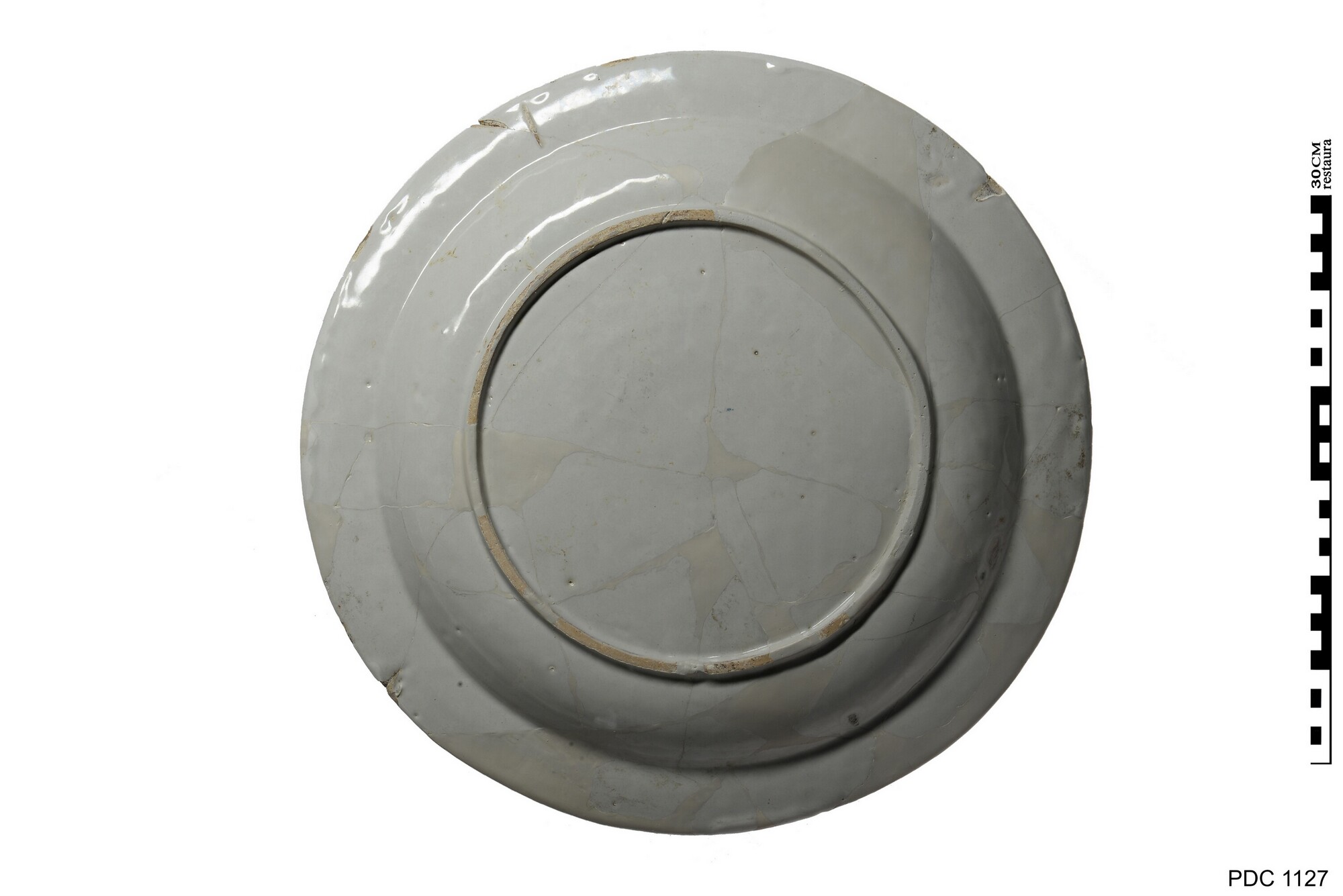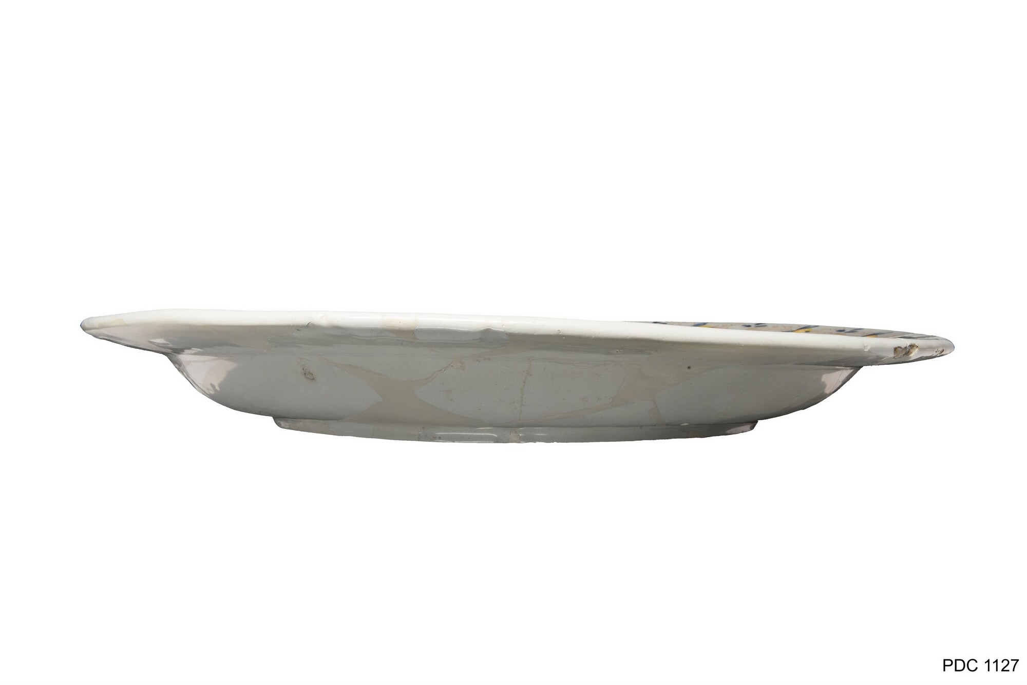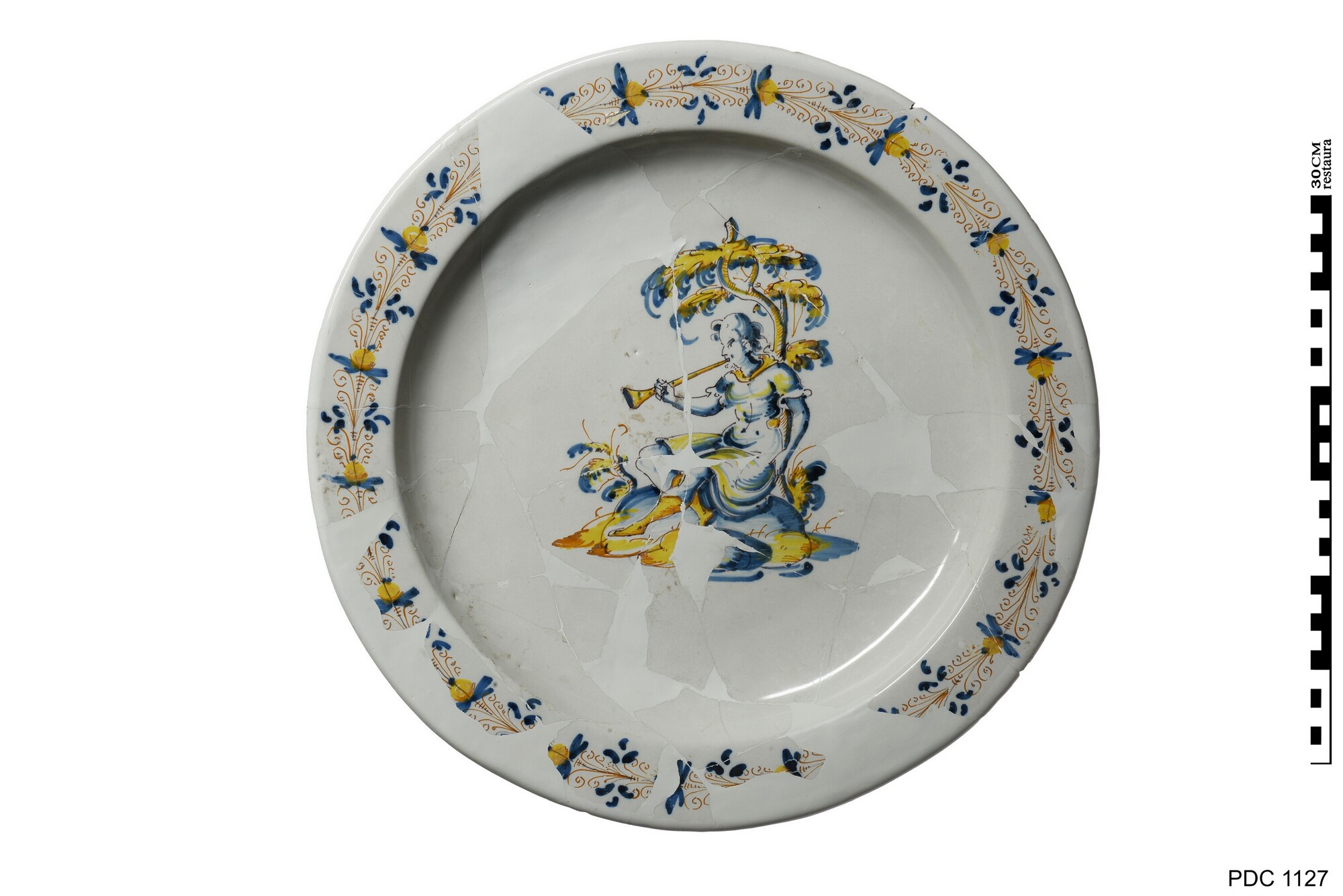 Bord; i-bor-1; bord met naar buiten geknikte vlag, standring; Italiaanse faience (compendiario); tinglazuur; polychrome beschildering, spiegel: man met schalmei; vlag: aigretterand; herkomst: Ligurië, Italië
