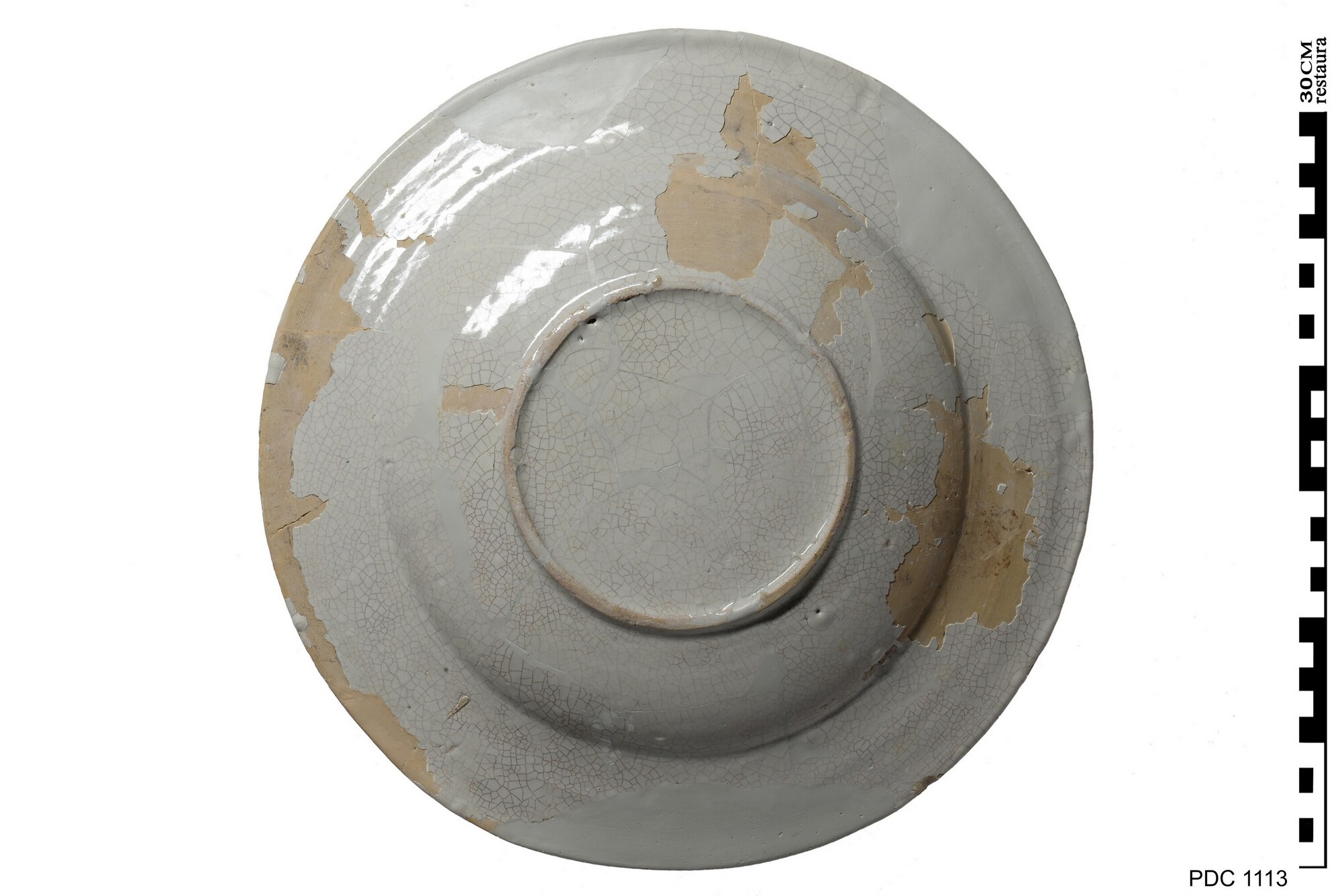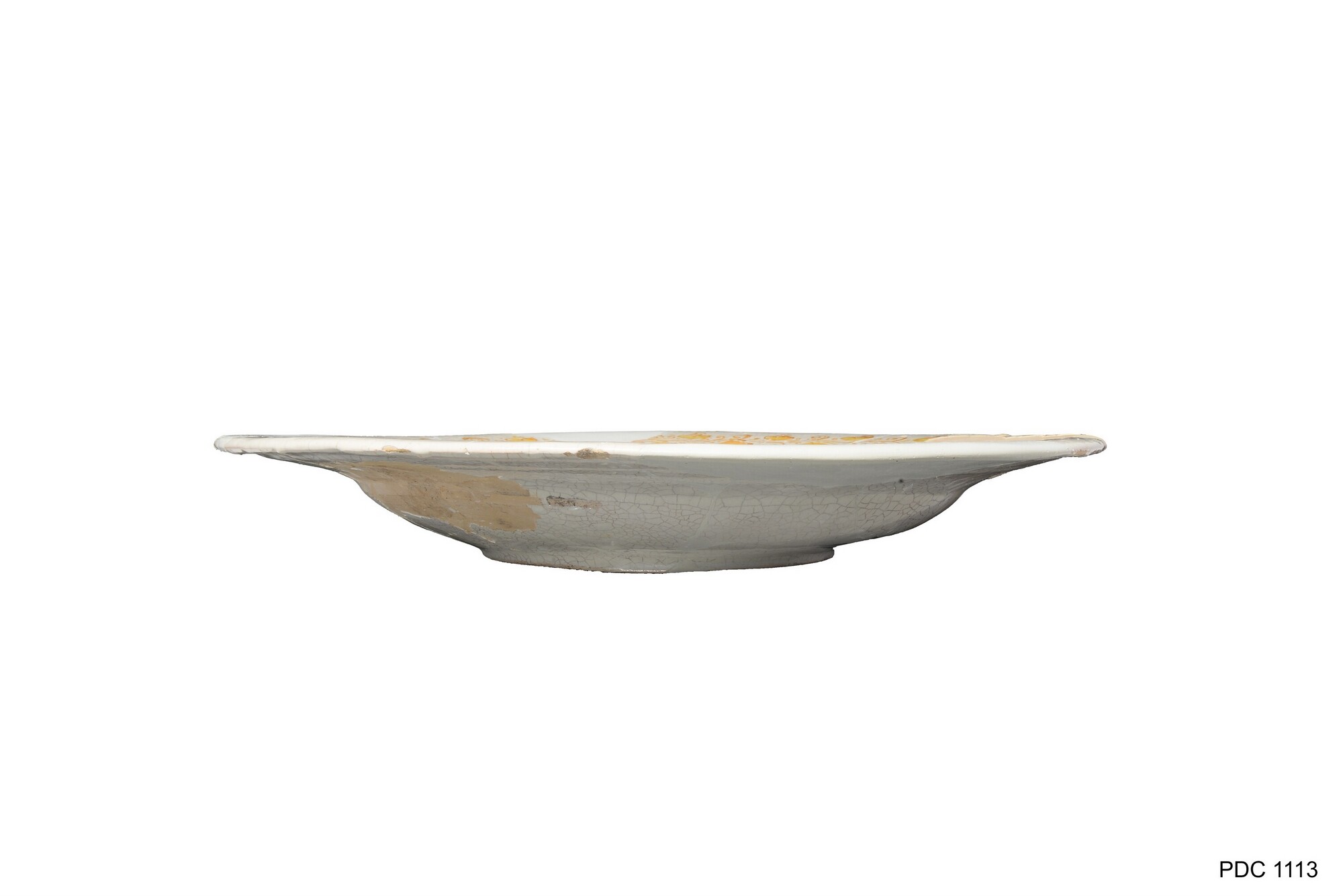 Bord; i-bor-1; Italiaanse faience; roze aardewerk met tinglazuur; bord met platte spiegel en naar buiten geknikte vlag, standring; compendario-decor: spiegel: Franciscus van Assisi ontvangt de stigmata, vlag: aigretterand in oker en geel; herkomst: Zuid-Italië, omgeving Napels