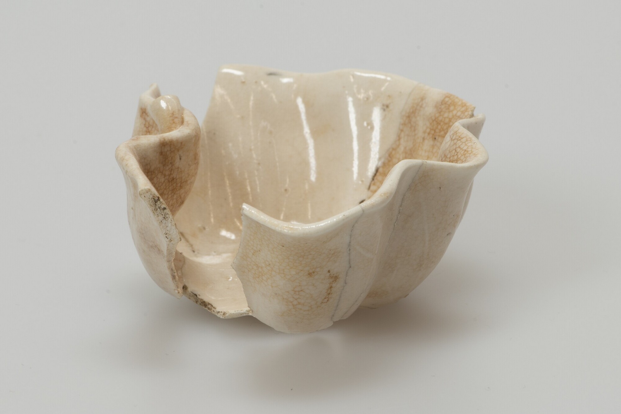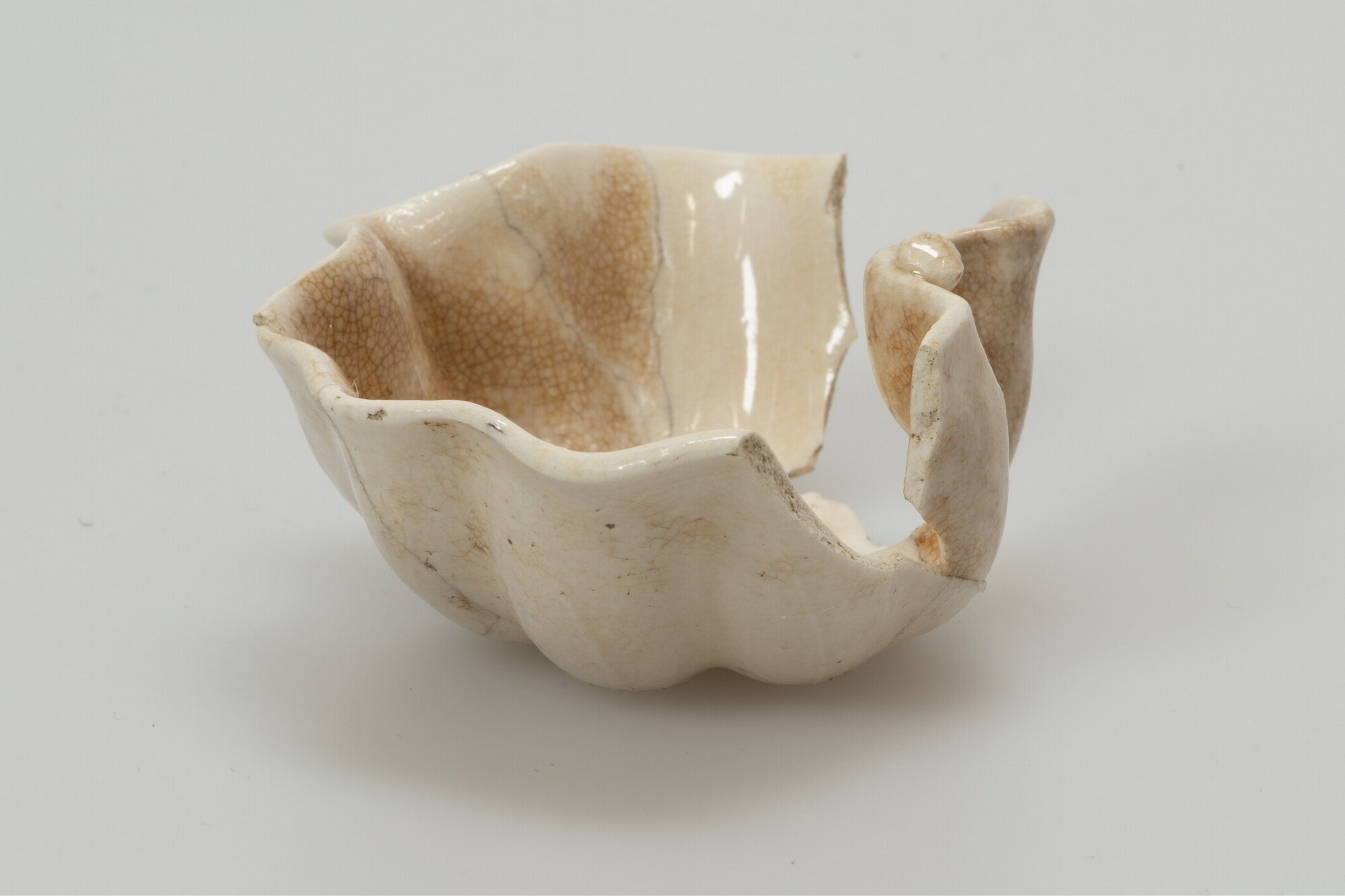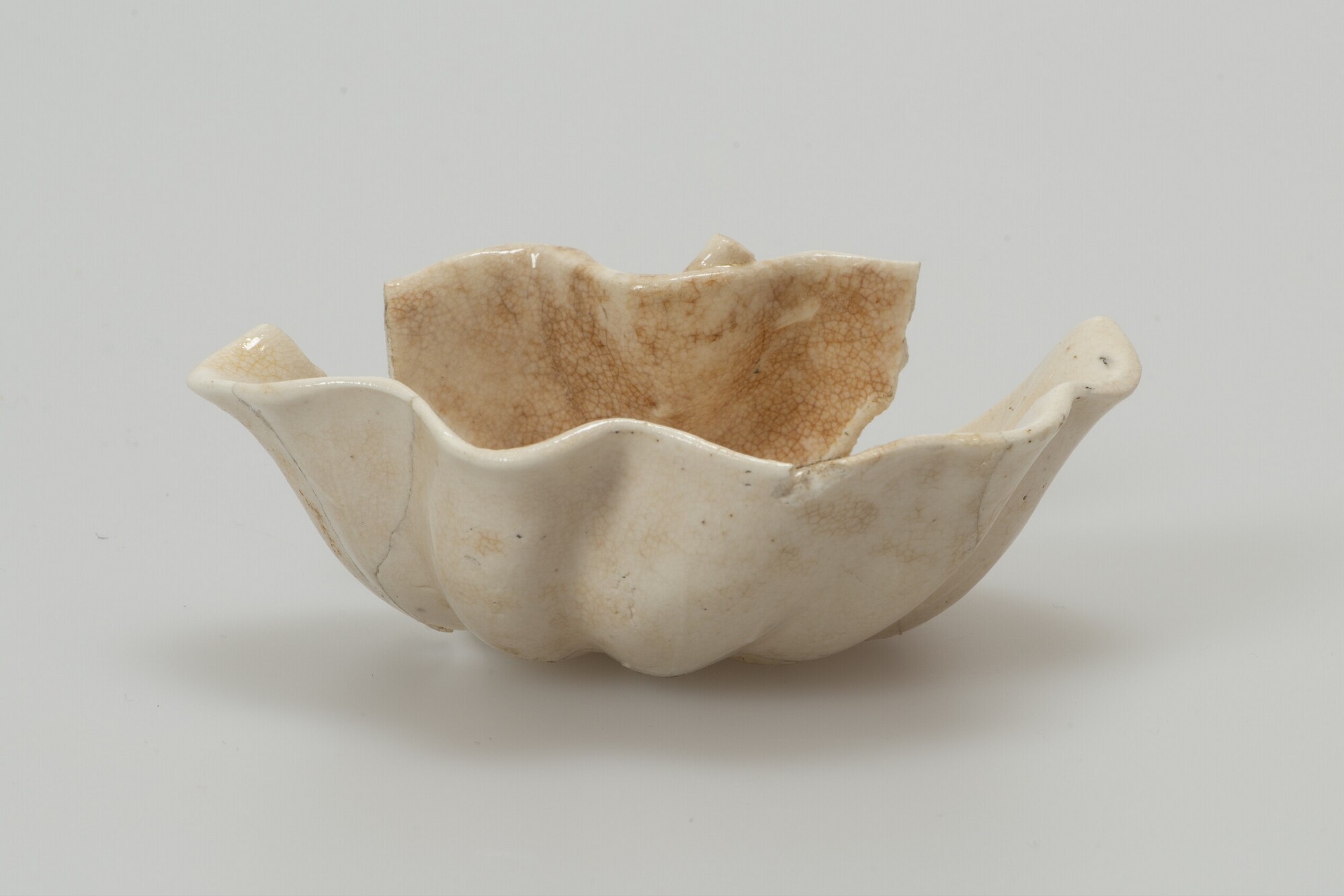 Penseelkom; Aziatisch porselein (Blanc de Chine); geplooide kom met steeltje (lotusbloem) en op de bodem een geboetseerde krab; herkomst: Dehua, China