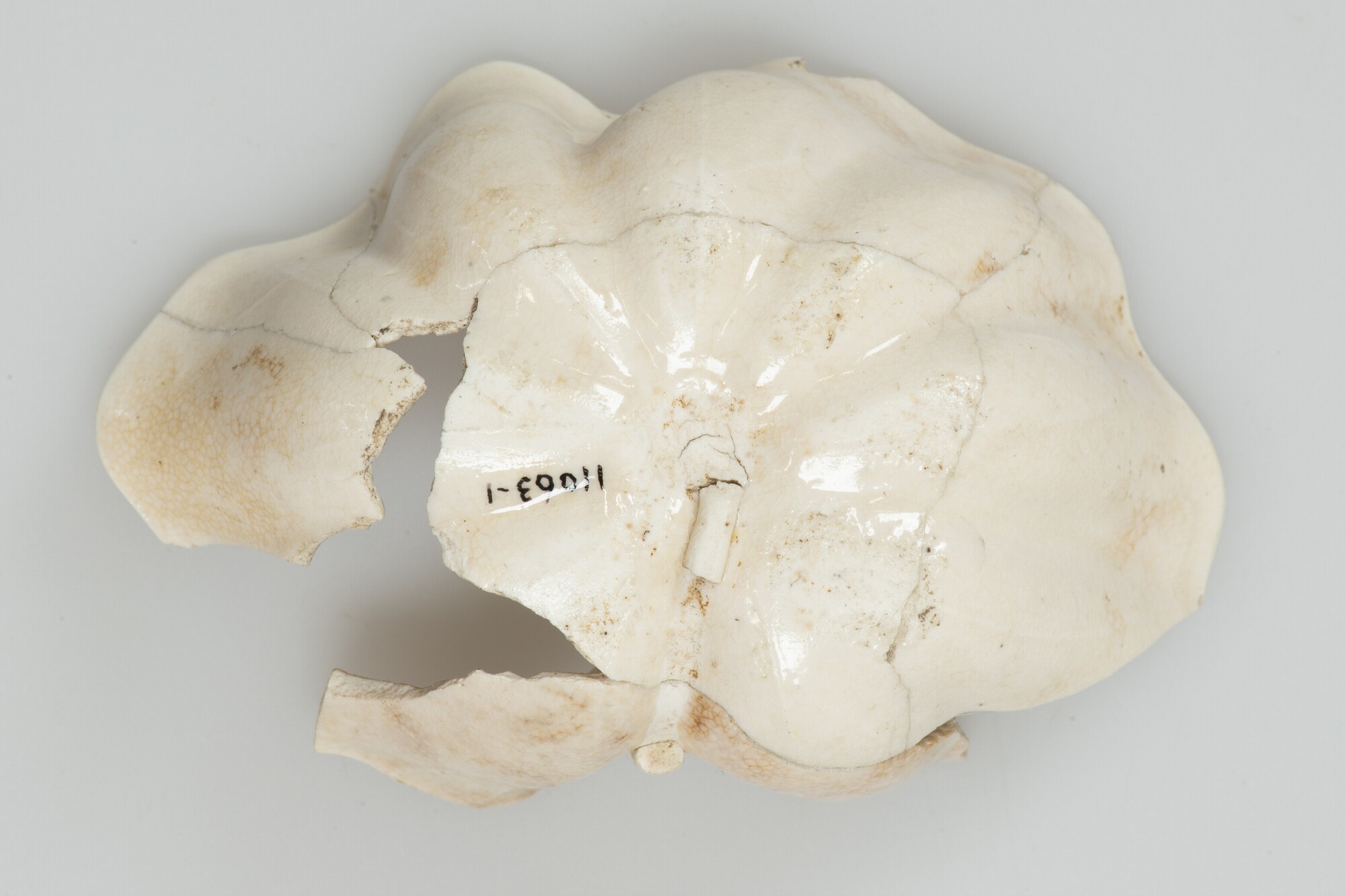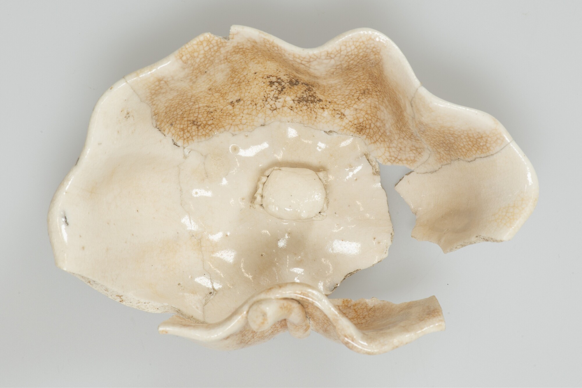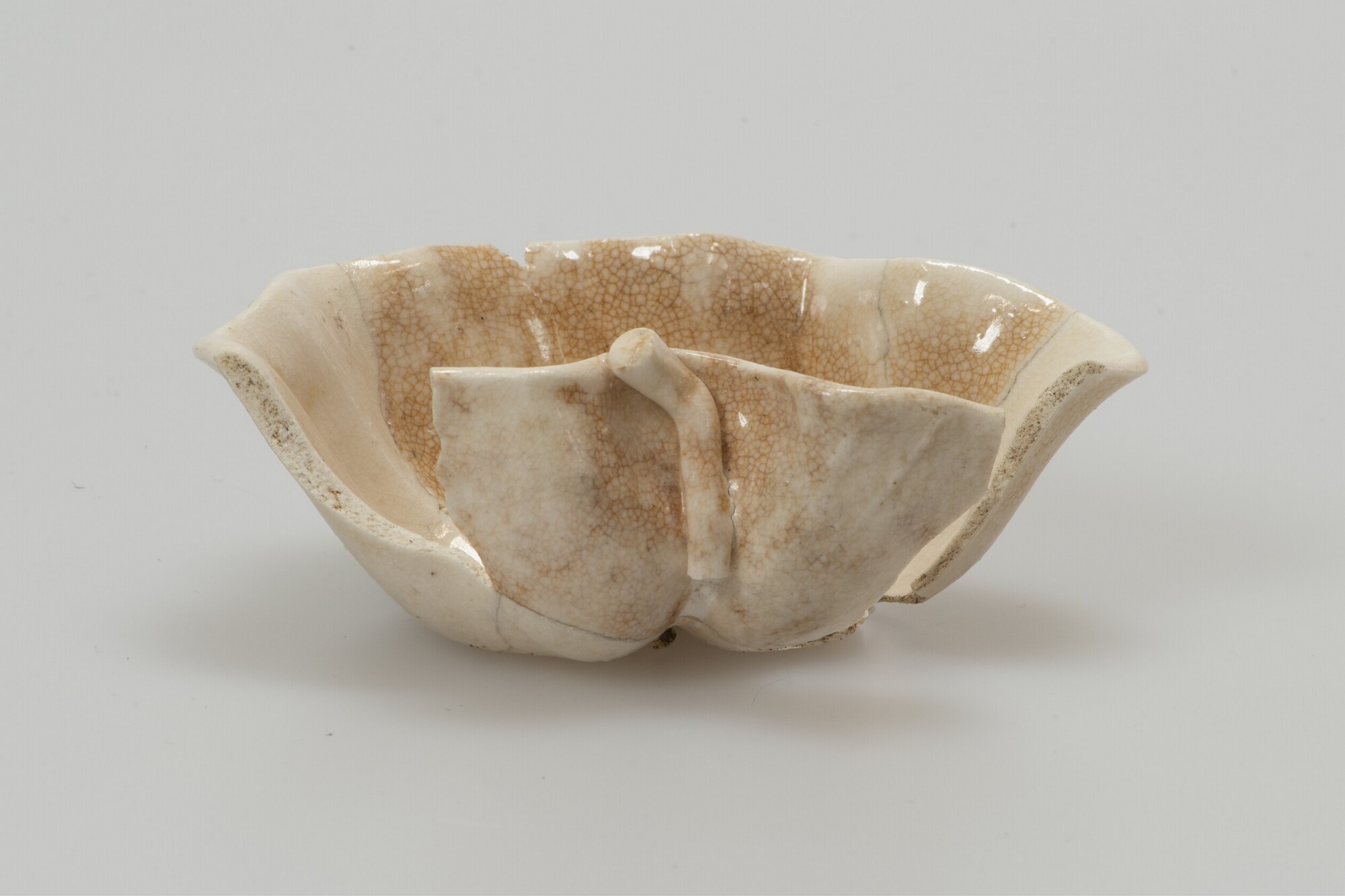 Penseelkom; Aziatisch porselein (Blanc de Chine); geplooide kom met steeltje (lotusbloem) en op de bodem een geboetseerde krab; herkomst: Dehua, China