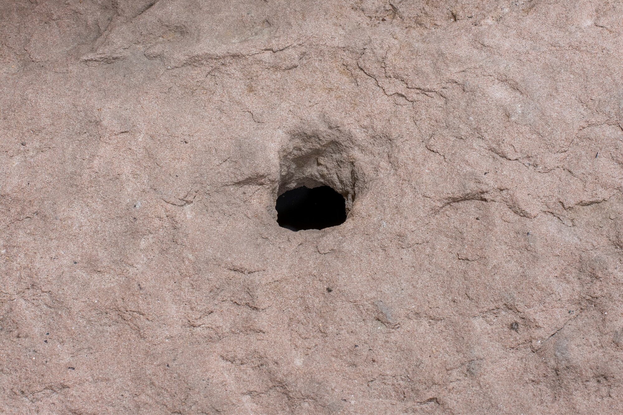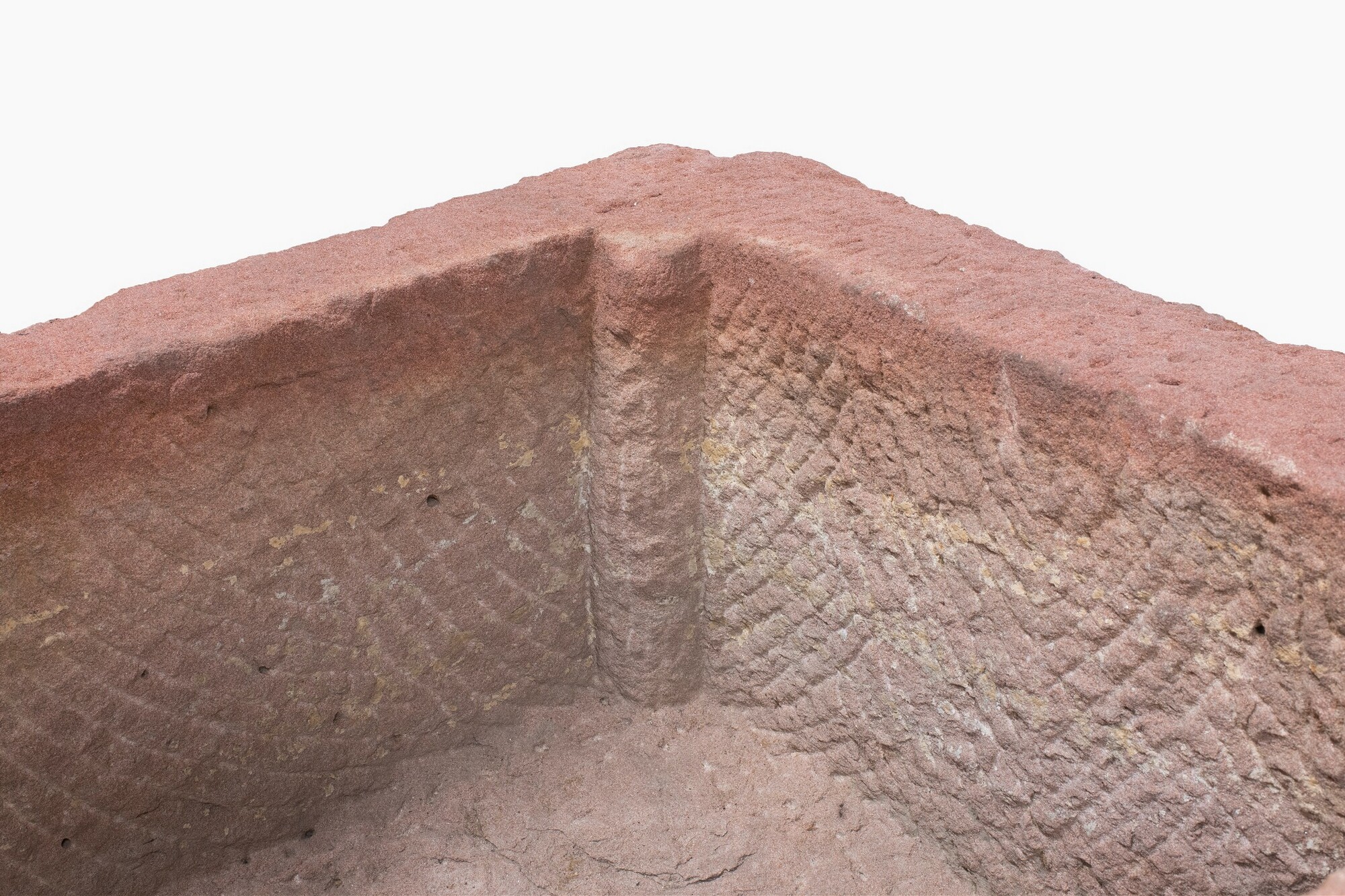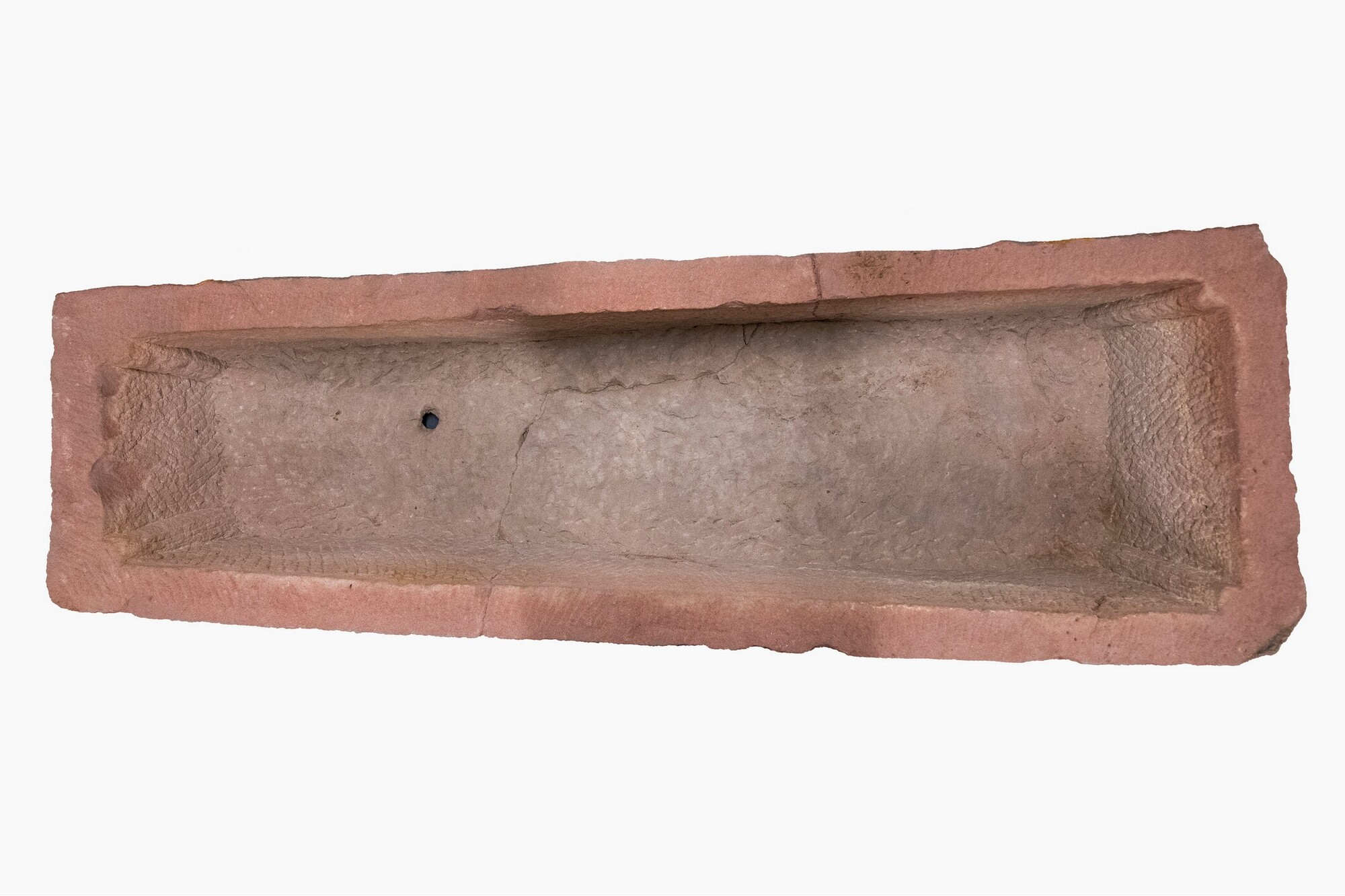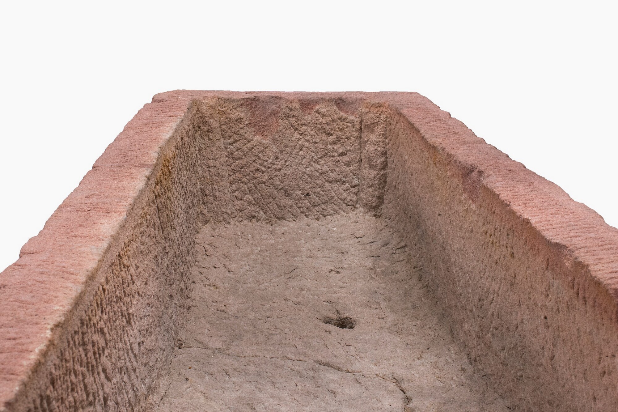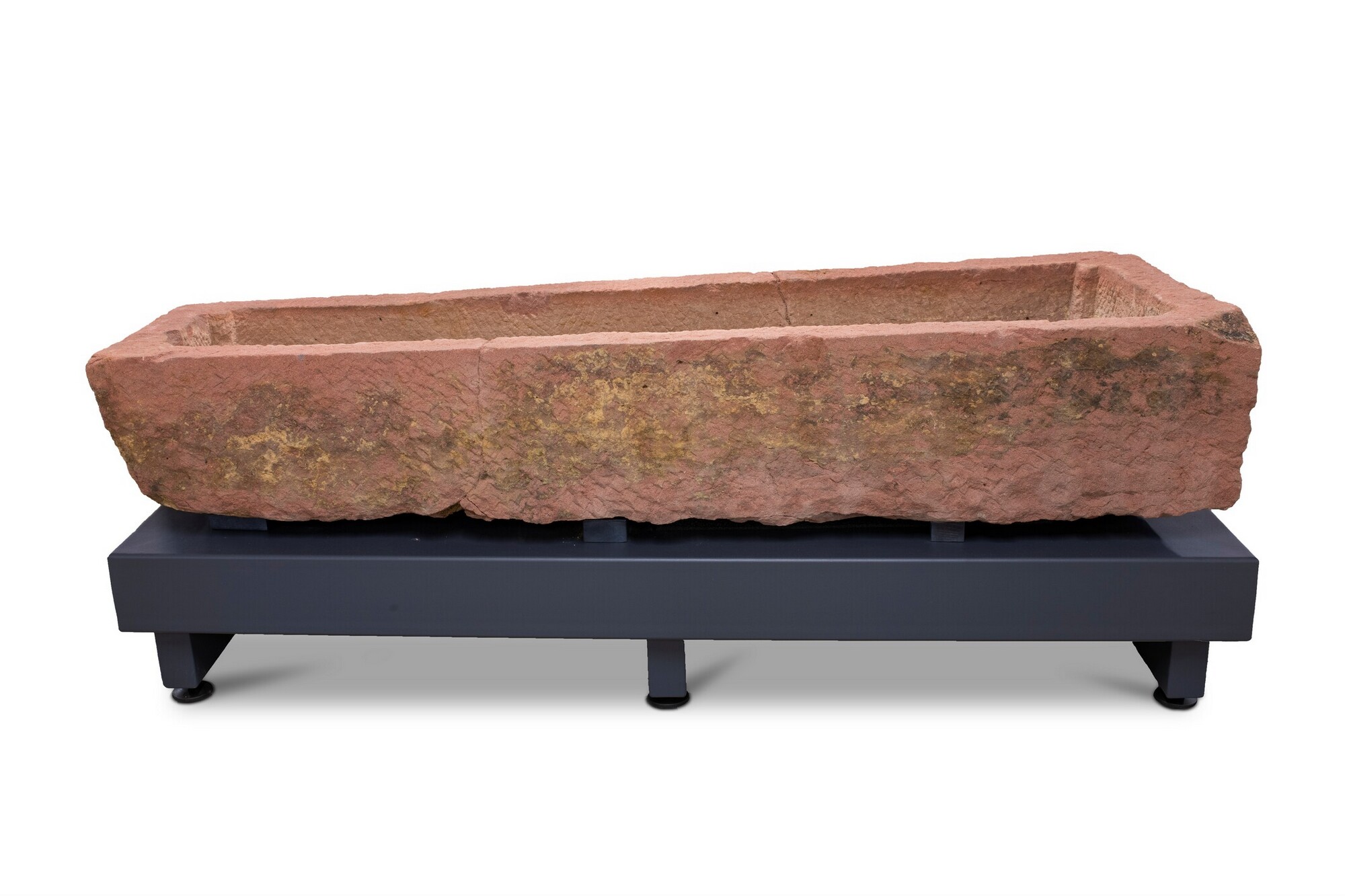 Sarcofaag; trapeziumvormig. De buitenzijde en de bodem aan de binnenzijde zijn ruw bekapt. De wanden zijn aan de binnenzijde versierd met groeven in een patroon van parallelle bogen. Ook op de rand zijn groeven aangebracht. Binnenin de kist zijn in de hoeken zuilen uitgehakt met daarop verticale groeven. Het deksel ontbreekt. Bevestigd op een stalen ...
