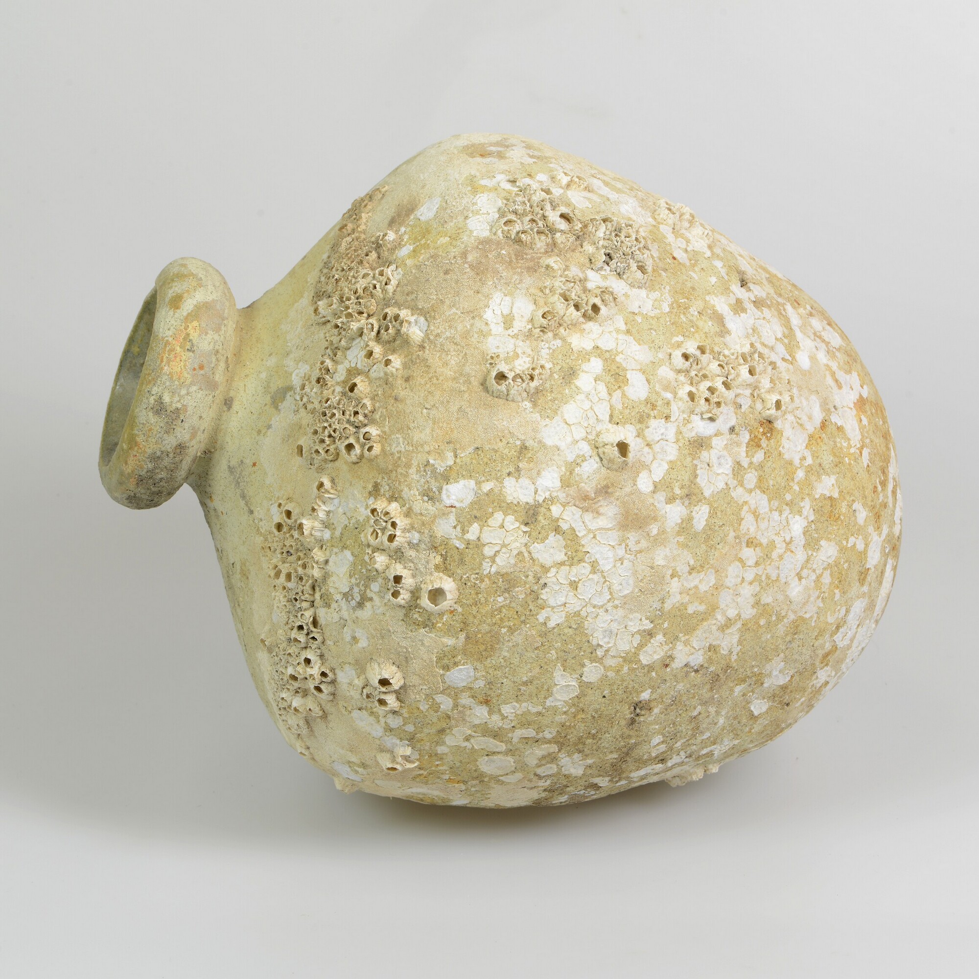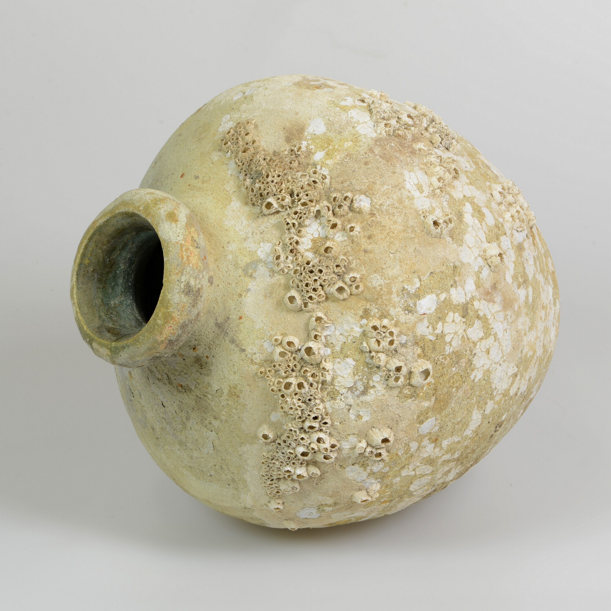 Amfoor; ib-amf-2; bolle amfoor met verdikte, afgeronde rand en bolle bodem; Iberisch witbakkend aardewerk; inwendig loodglazuur met koperoxide; resten van zeepokken; herkomst: Sevilla, Spanje