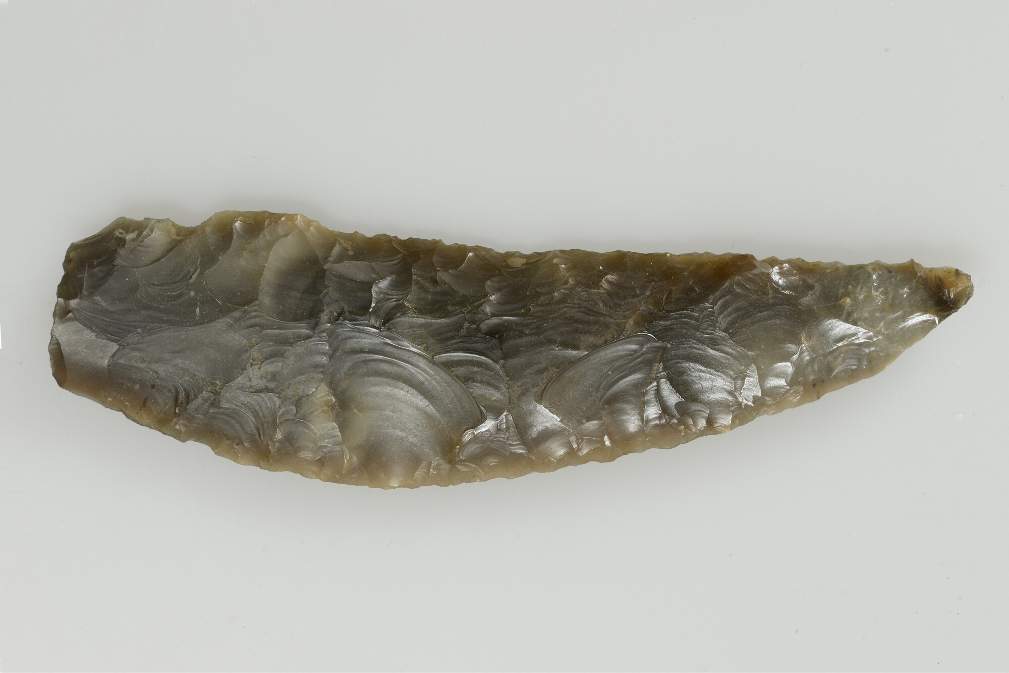 Deze licht gebogen sikkel is gemaakt van Plattenflint, een vuursteen afkomstig van het eiland Helgoland. Het blad heeft een bolle snede en een rechte tot licht holle rugzijde. Het puntige uiteinde en de duidelijke gebruikssporen wijzen erop dat het werktuig werd gebruikt voor grondbewerking, mogelijk om graszoden te snijden.