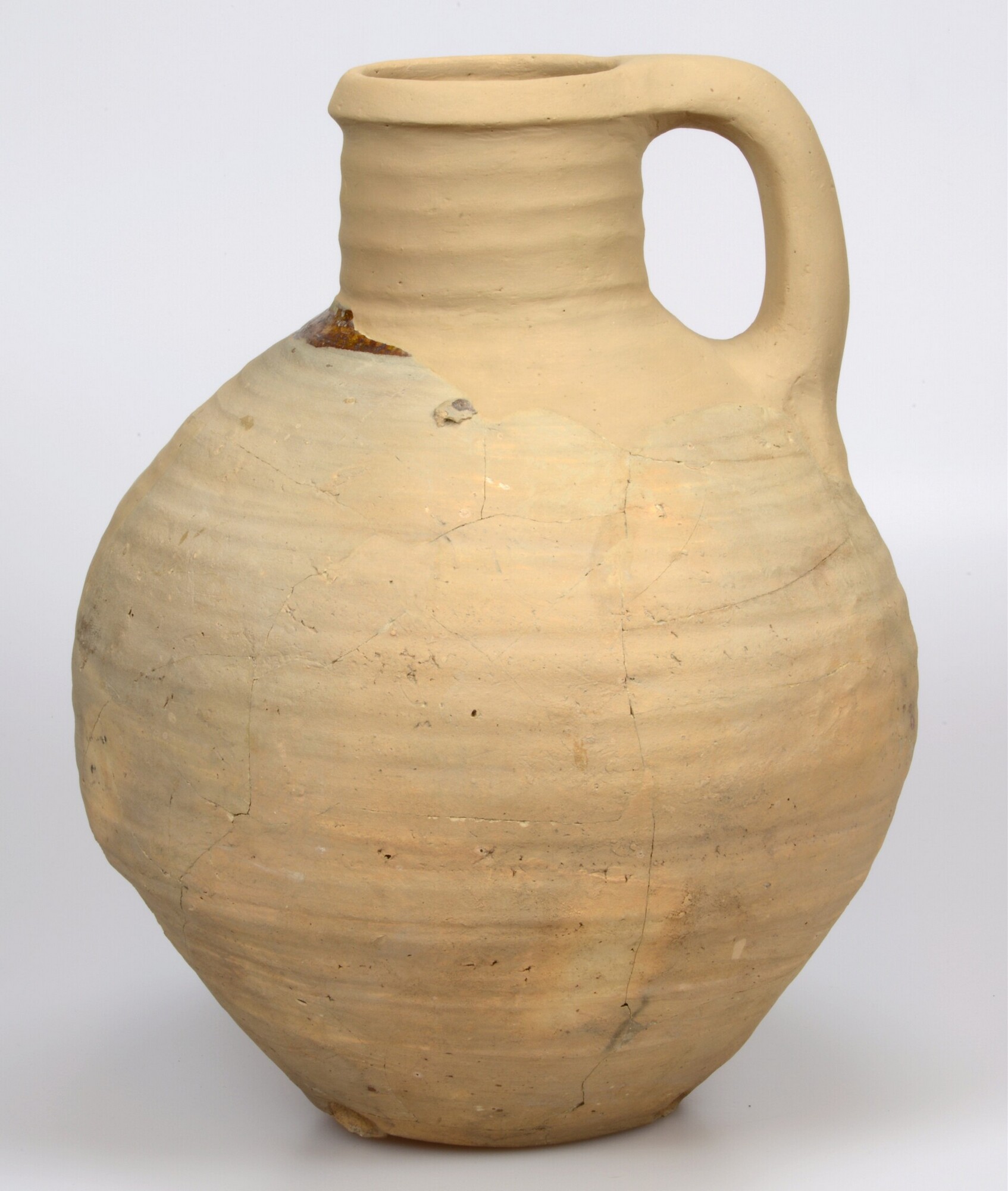 Kan; wm-kan-3; bolle kan met cilindrische hals met ribbel en een verdikte rand, lensvormige bodem met drie standlobben, verticaal linttoor (gerestaureerd); Maaslands witbakkend aardewerk; spaarzaam loodglazuur op schouder; herkomst: Andenne, Maasland