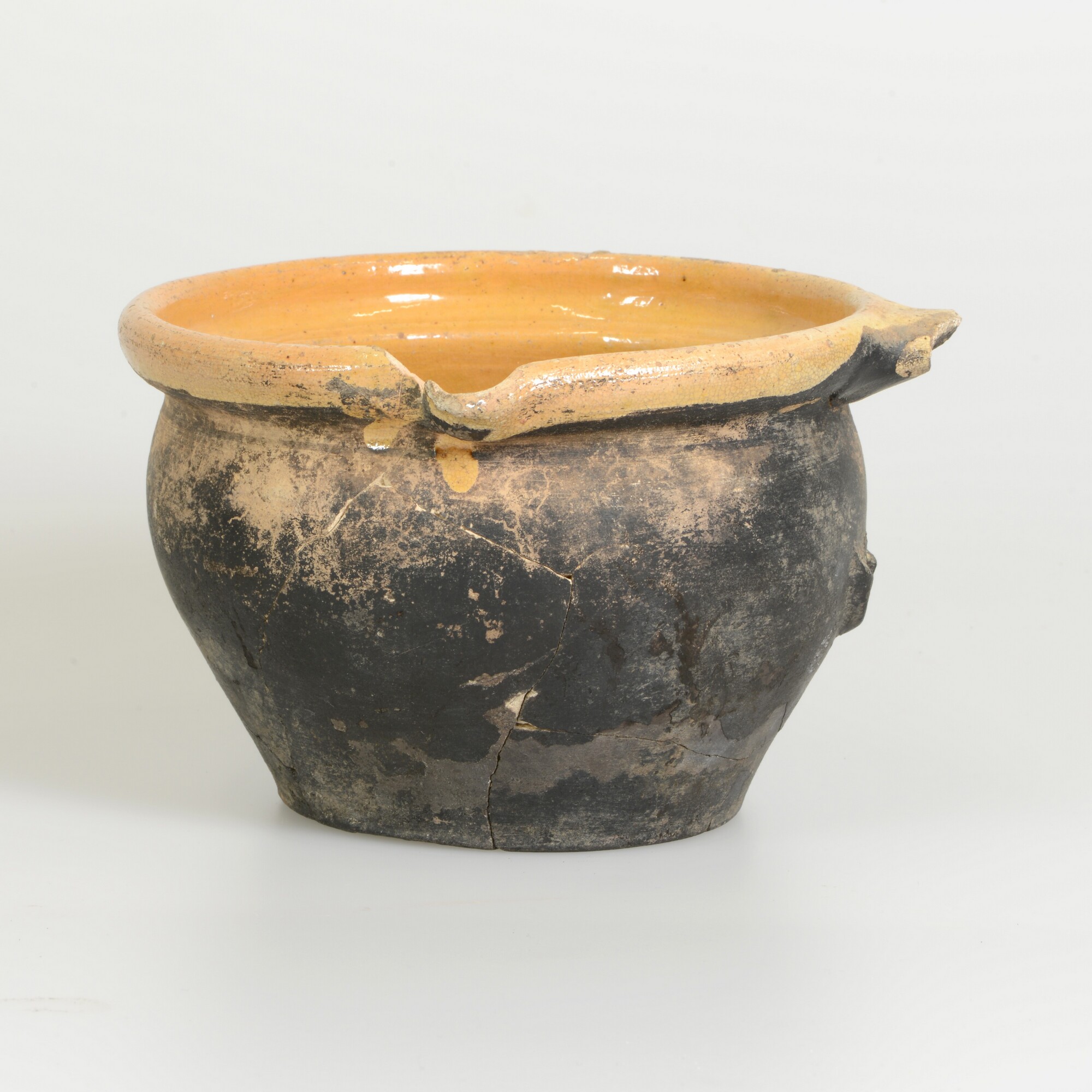 Kachelpan; w-kap-1; kachelpan met naar buiten geknikte holle rand met dekselgeul, standvlak, verticaal lintoor (ontbreekt), schenklip; witbakkend aardewerk (Frankfurter waar); inwendig loodglazuur; uitwendig beroet; herkomst: Nederland