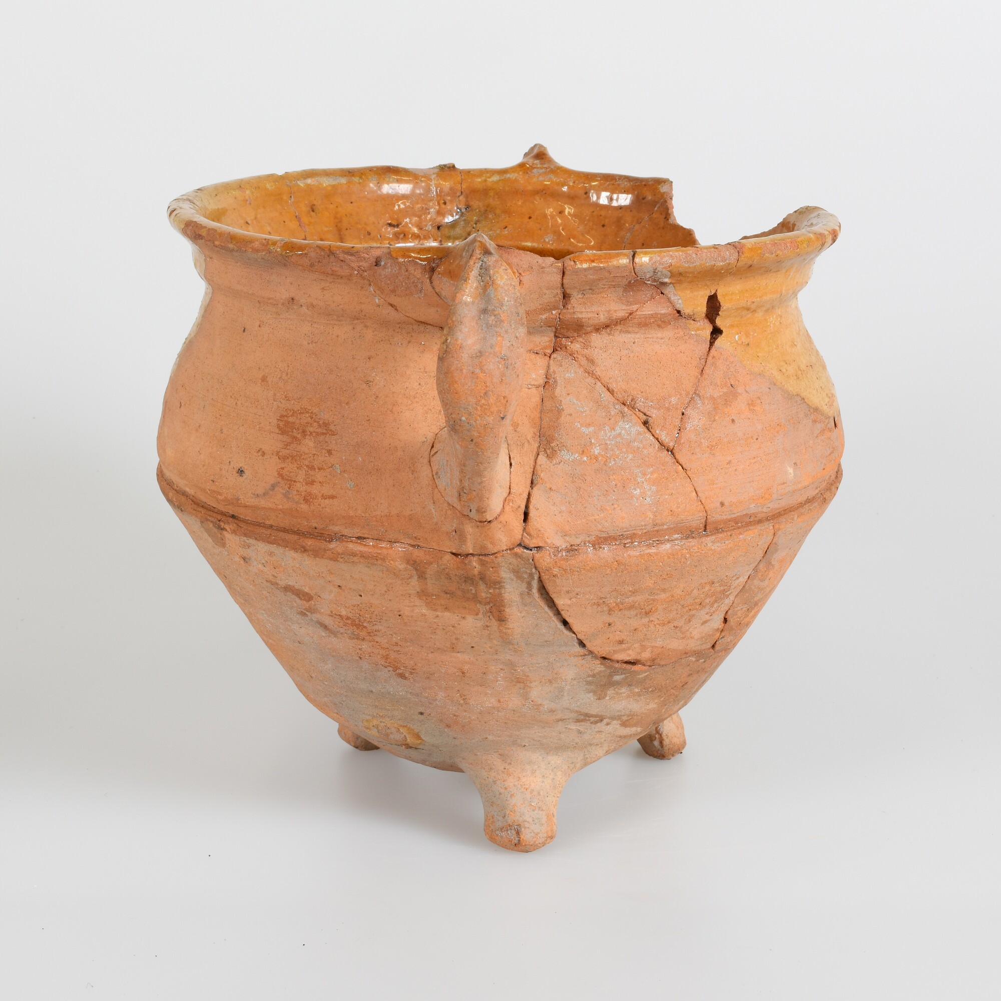 Grape; r-gra-54; grape met afgeronde buikknik, geribbelde kraagrand met dekselgeul; roodbakkend aardewerk; binnenzijde loodglazuur, buitenzijde glazuurvlekken; twee verticaal geknepen worstoren; driepoot