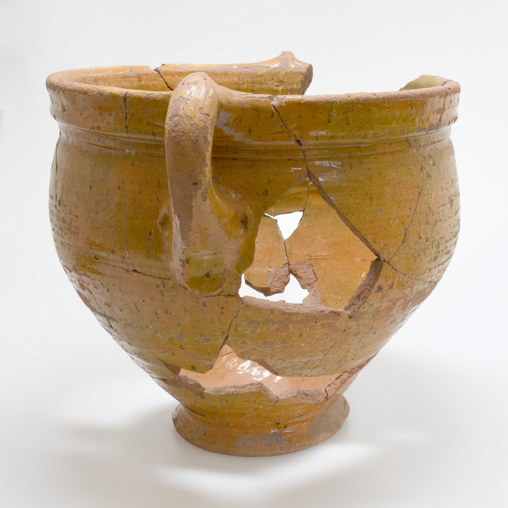 Pot; r-pot-2; wijde peervormige pot met brede kraagrand; roodbakkend aardewerk; binnen- en buitenzijde loodglazuur; vlekken koperoxide; twee verticaal geknepen worstoren; standring