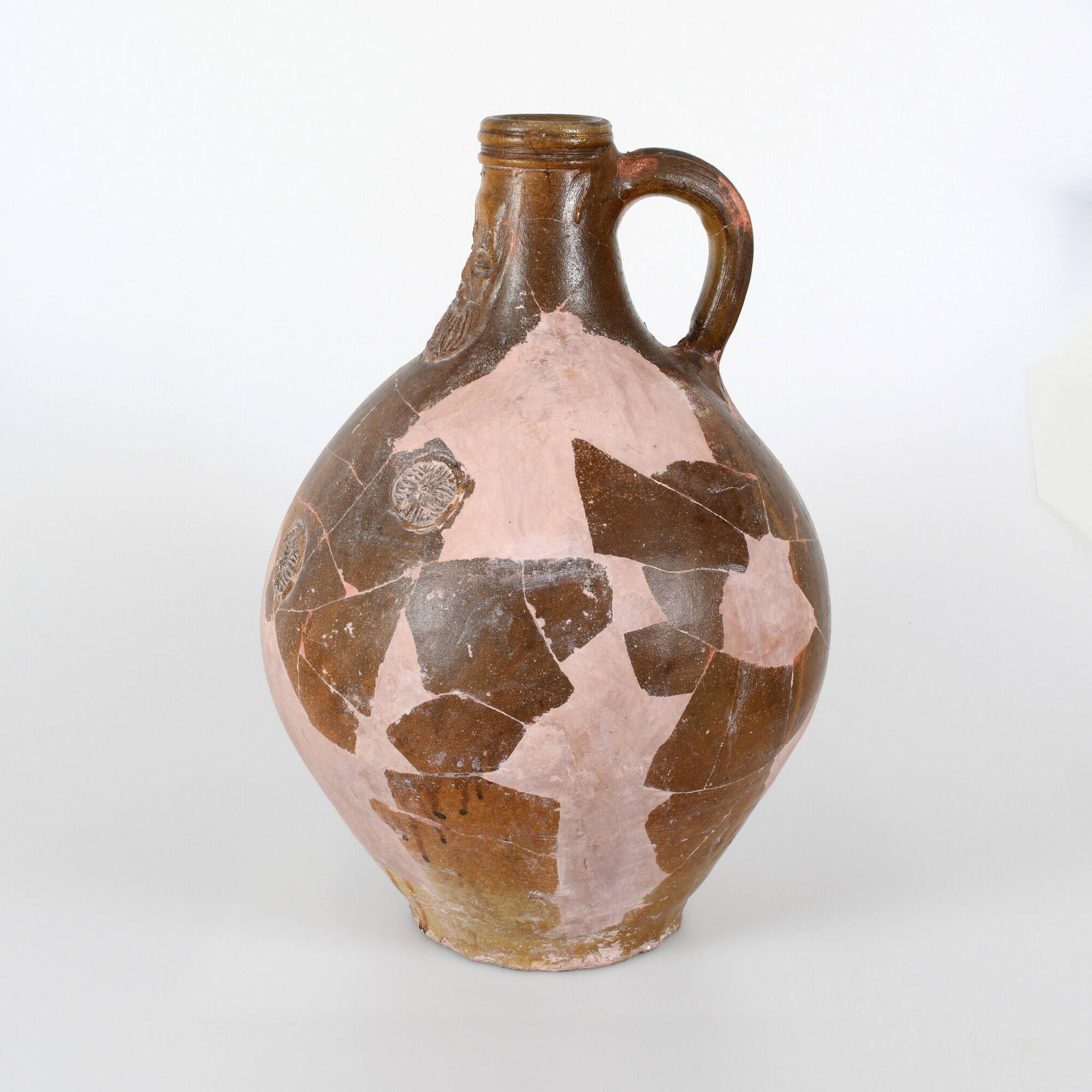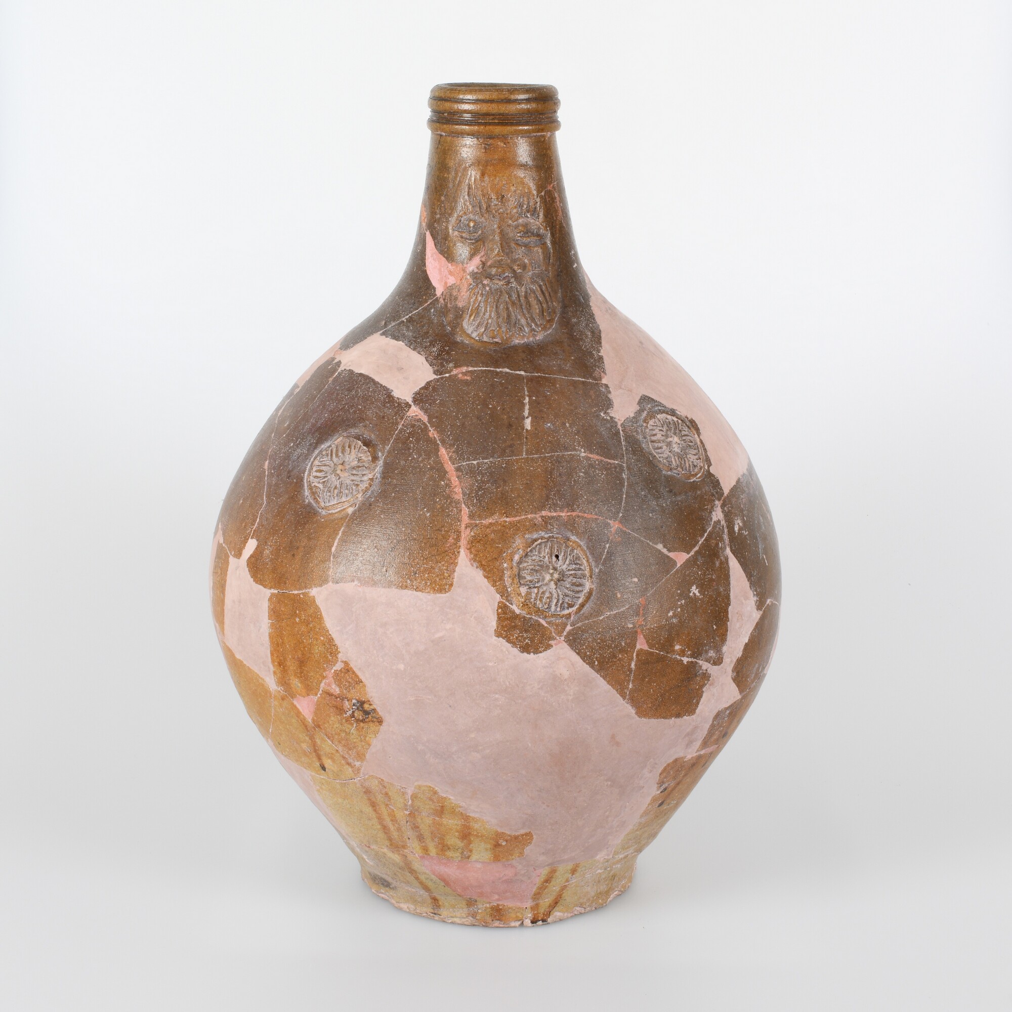 Baardmankruik; s2-kan-32; bolle kan met schouder overgaand in hoge hals met geribbelde kraagrand; steengoed; uitwendig zoutglazuur met ijzerengobe; baardman op hals; drie rozetten op de buik; standvlak; één verticaal worstoor; herkomst: Stadtlohn / Vreden, Duitsland