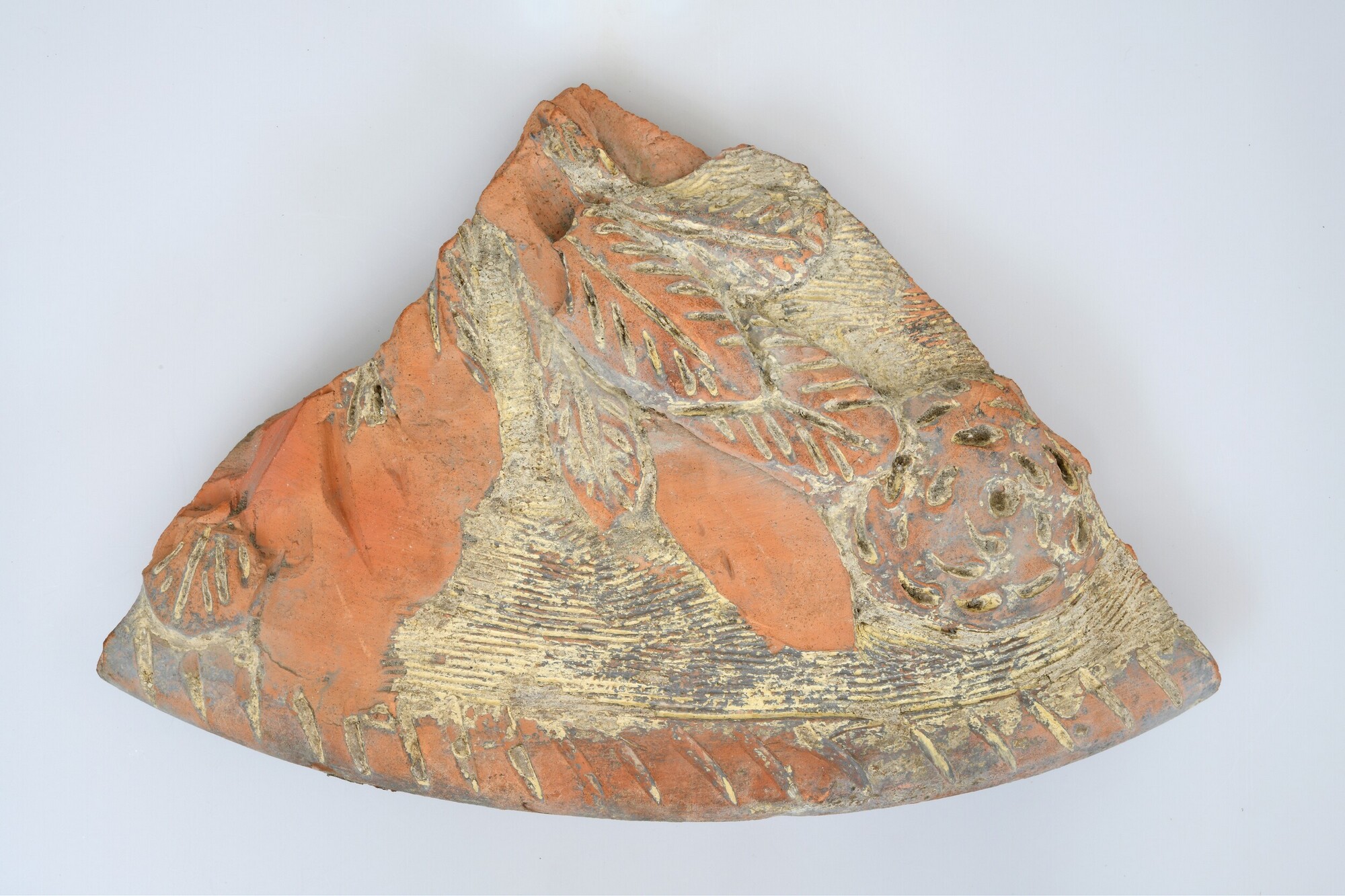 Deksel tuinvaas?; r-dek-; ingekraste versiering rand en wand; appliques van bloemen en bladeren; loodwit op oppervlakte buitenkant