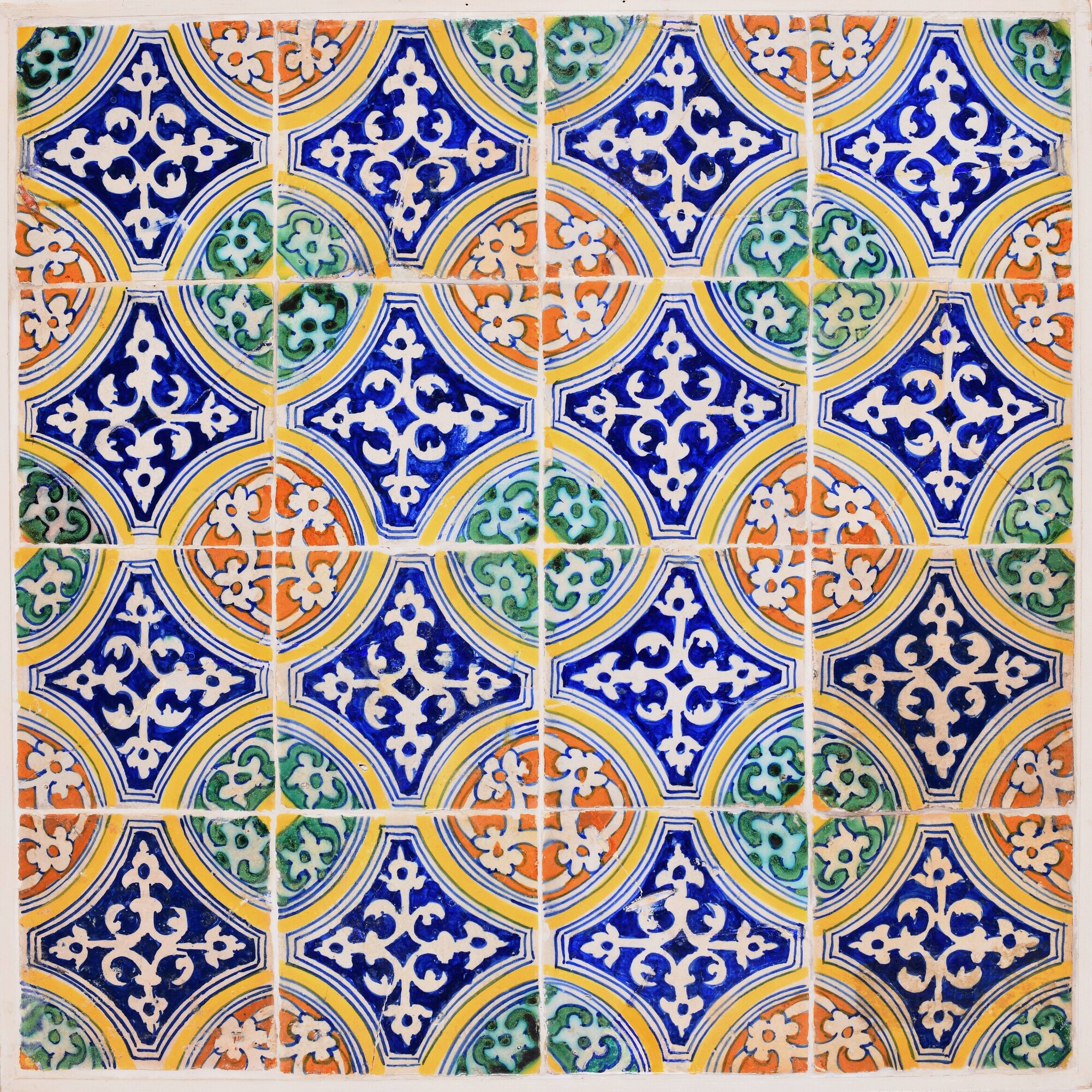 Tegeltableau; 16 wandtegels; polychrome beschildering: palmettenkruis in gebogen kwadraat; herkomst: West-Nederland; in houten lijst met twee ophangoogjes; vondstdatum: 1964