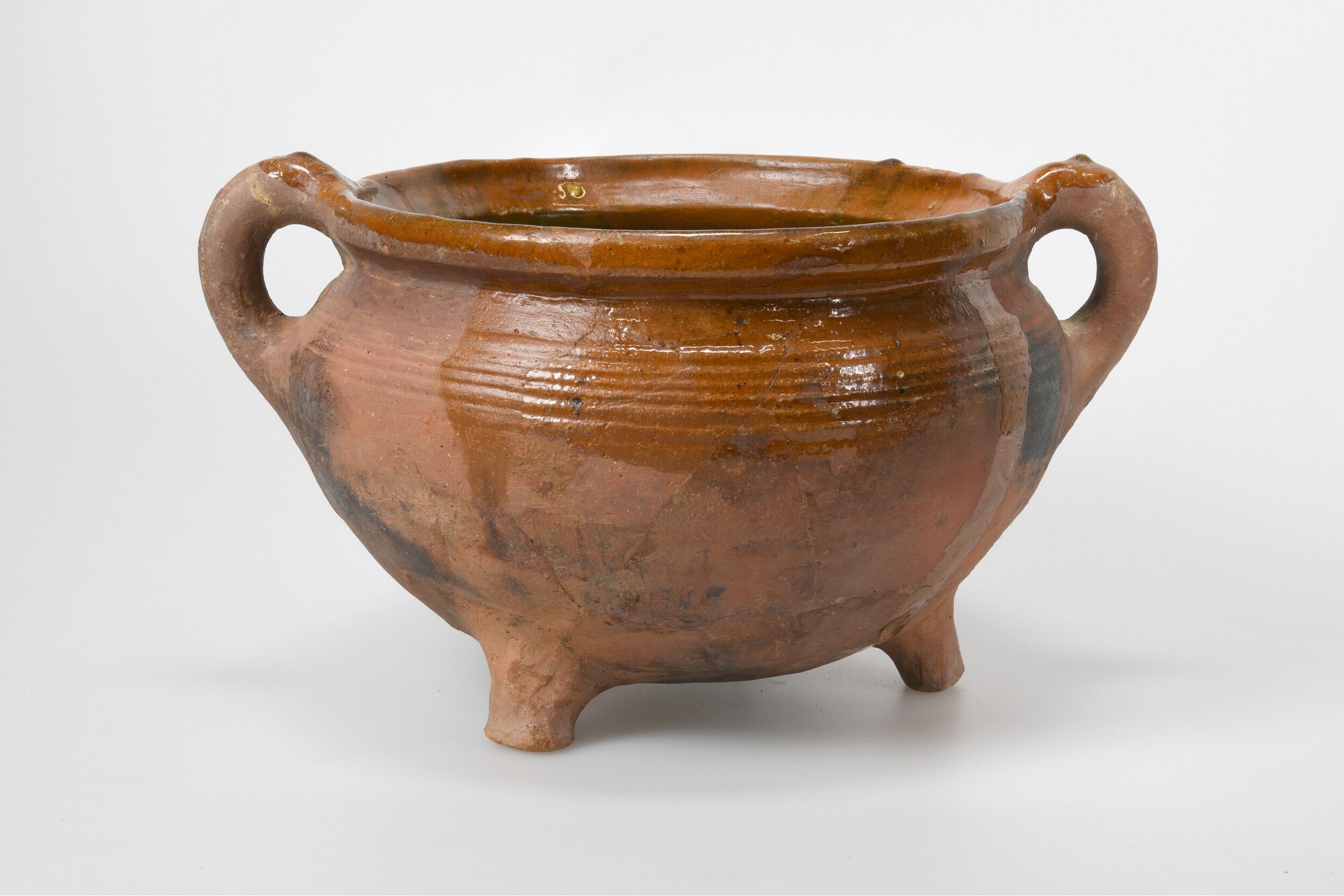 Grape; r-gra-133; roodbakkend; loodglazuur, binnenzijde en buitenzijde geglazuurd, 'koperoxide''; driepoot; twee verticale worstoren