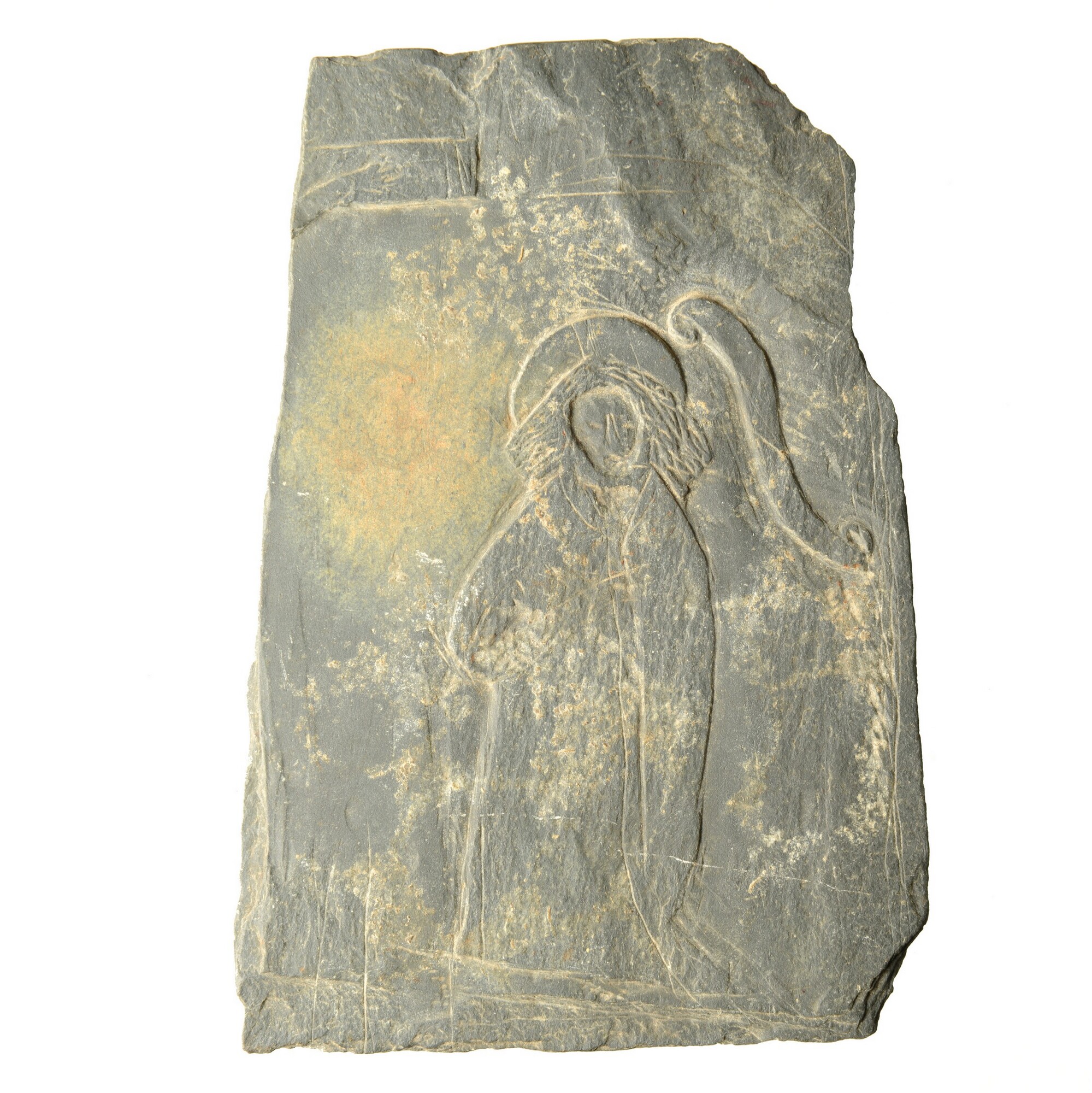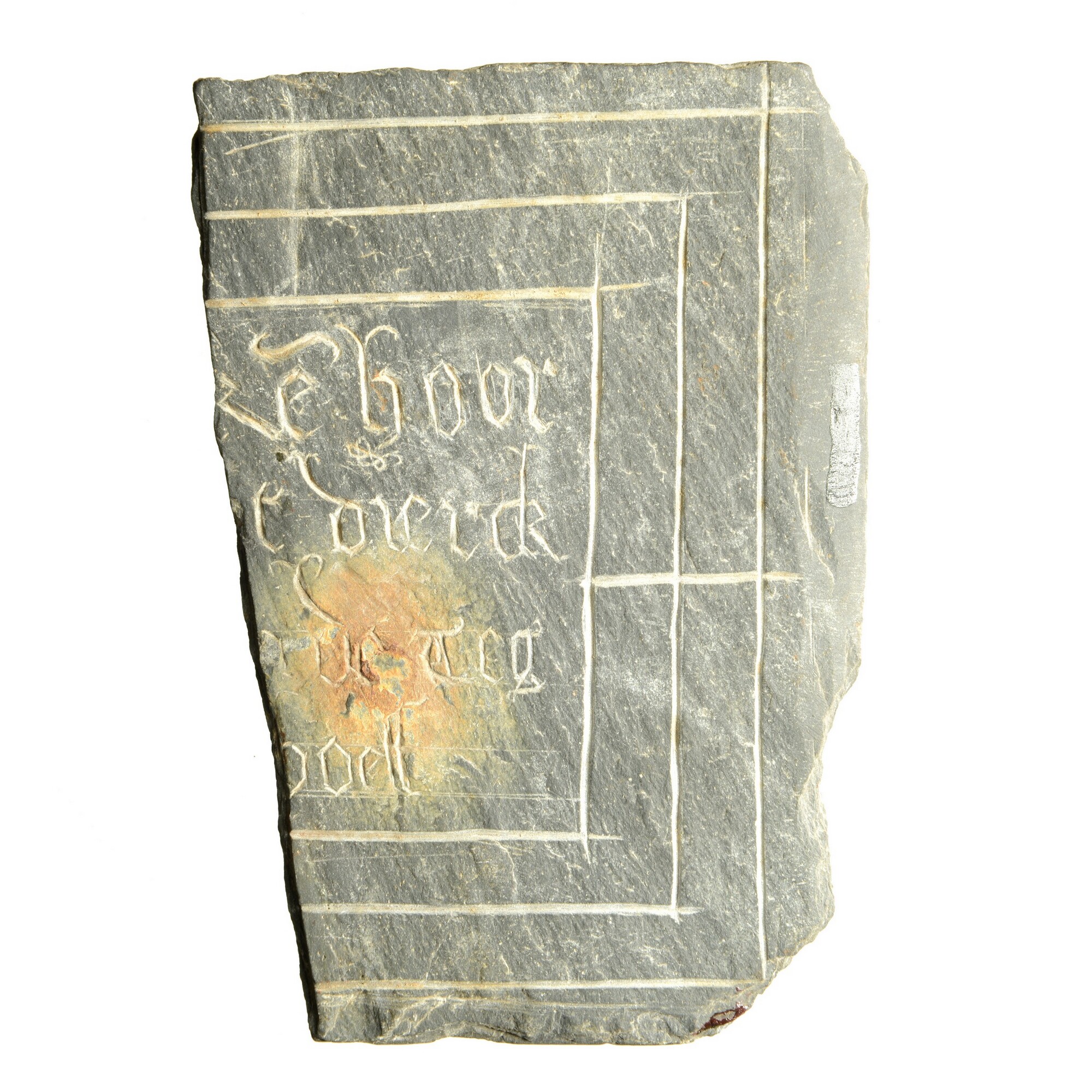 Daklei; voorzijde: ingekraste tekst in de belijning van een molenspel:...REN VOOR; ...E DIE ICK; ...AVE TEG; ...GOET (?); achterzijde: kruisiging Christus (hand en fragment kruis) met Johannes (aan de rechterzijde) in bas-reliëf