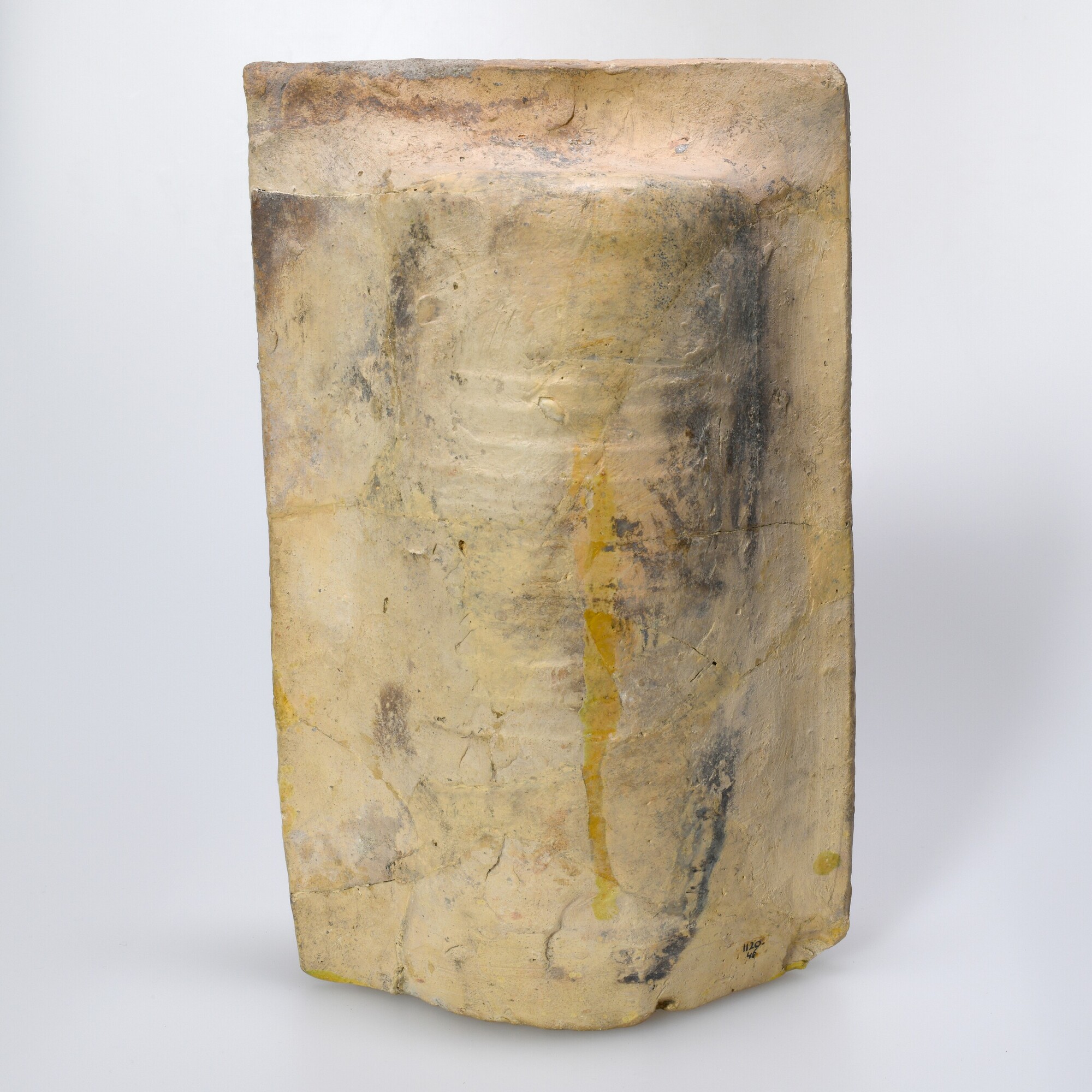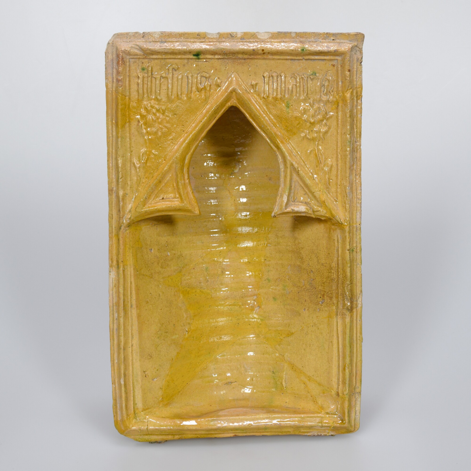 Kacheltegel type cilindertegel; witbakkend aardewerk. Voorzijde: drielobbig Gotisch venster met aan weerzijde een naar het midden gebogen bloem waarboven JESUS. (en) .MARIA., loodglazuur met spatten koperoxide. Achterzijde: ongeglazuurd met glazuurspatten en roetsporen. Witbakkend aardewerk. Productieplaats: Rijnland, Keulen.