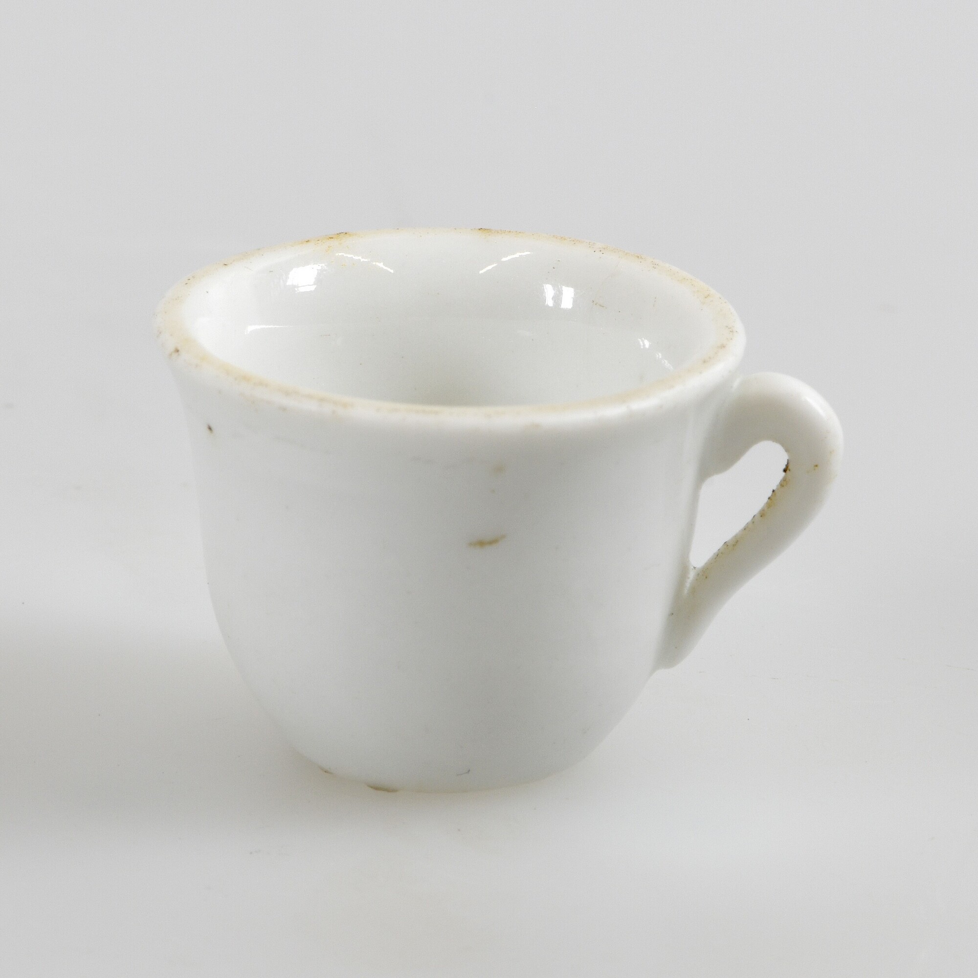 Kop; speelgoed / miniatuur theekopje / poppengoed; ep-kop-7; steilwandige kop met uitstaande wand en rechte rand, standring, verticaal vormoor; Europees porselein; veldspaatglazuur; herkomst: Duitsland