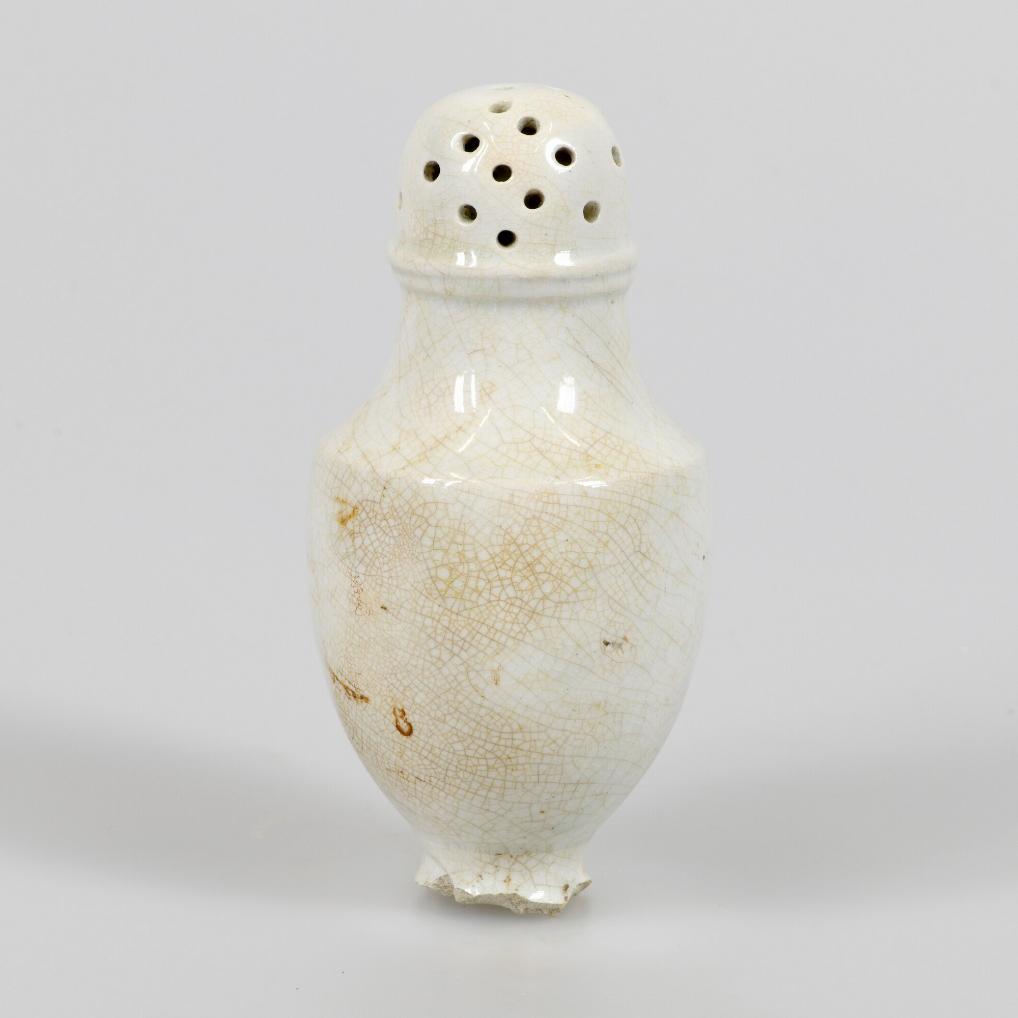 Strooier; iw-soi-1; balustervormige strooibus met doorboorde cilindrische bovenzijde en vulopening aan de onderzijde, standvoet (ontbreekt); industrieel wit aardewerk (whiteware / witgoed); loodglazuur; herkomst: Maastricht?