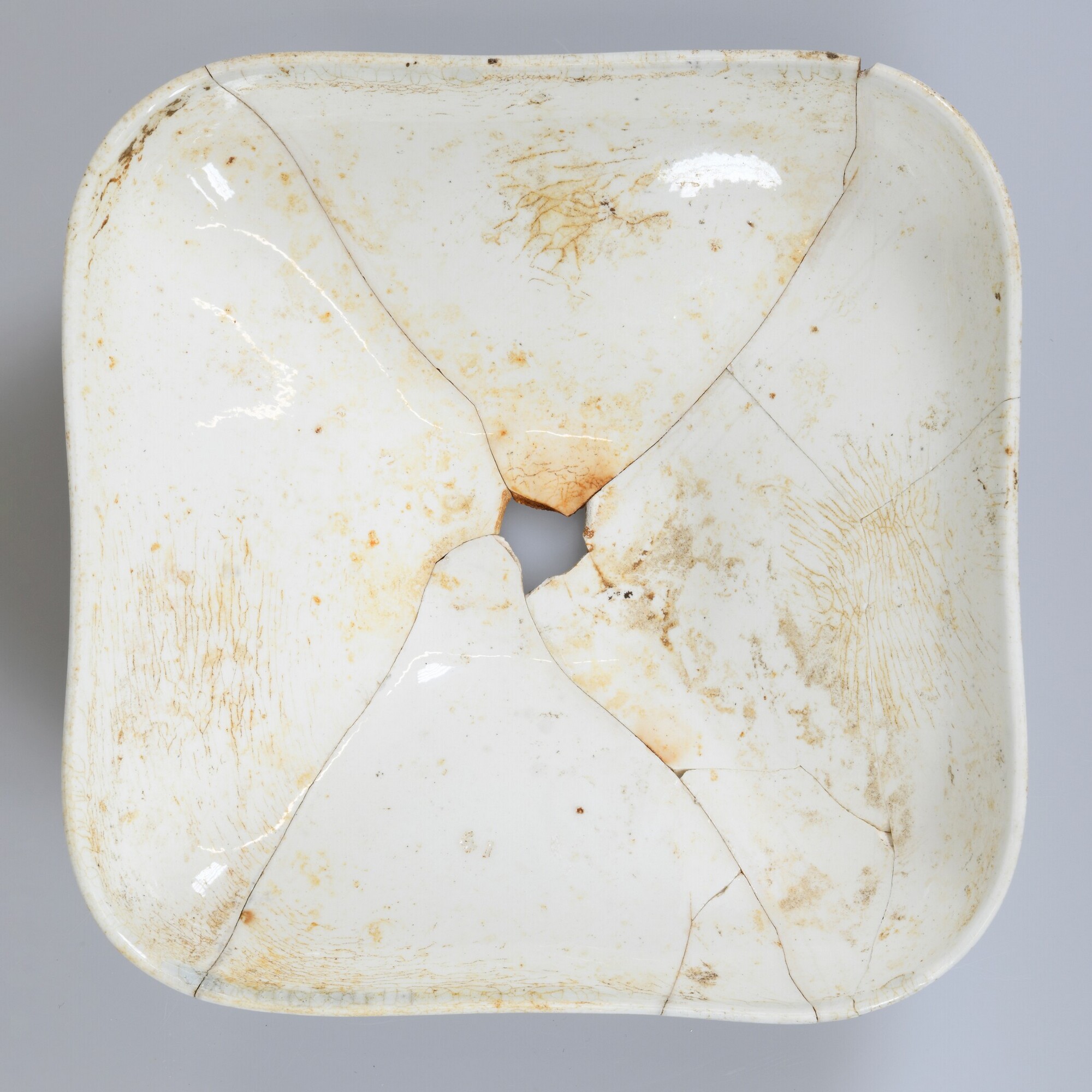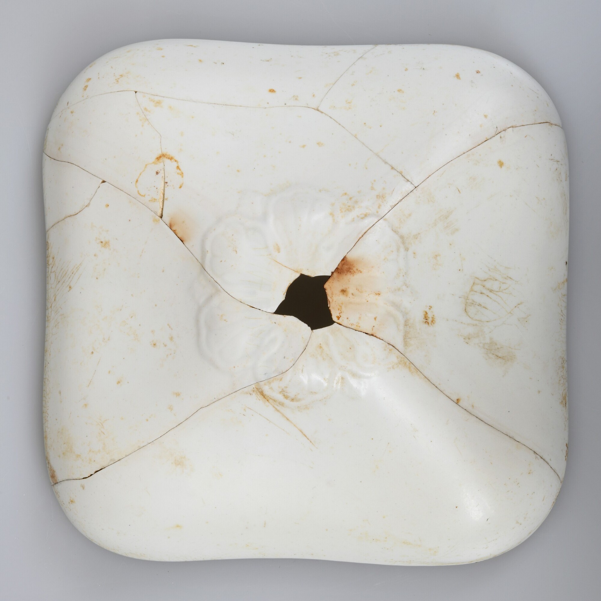 Deksel; iw-dek-2; vierkant afgerond deksel met geknikte rechte rand en knop (ontbreekt) (terrine deksel); industrieel wit aardewerk, witgoed; loodglazuur; reliëf bloem rondom knop