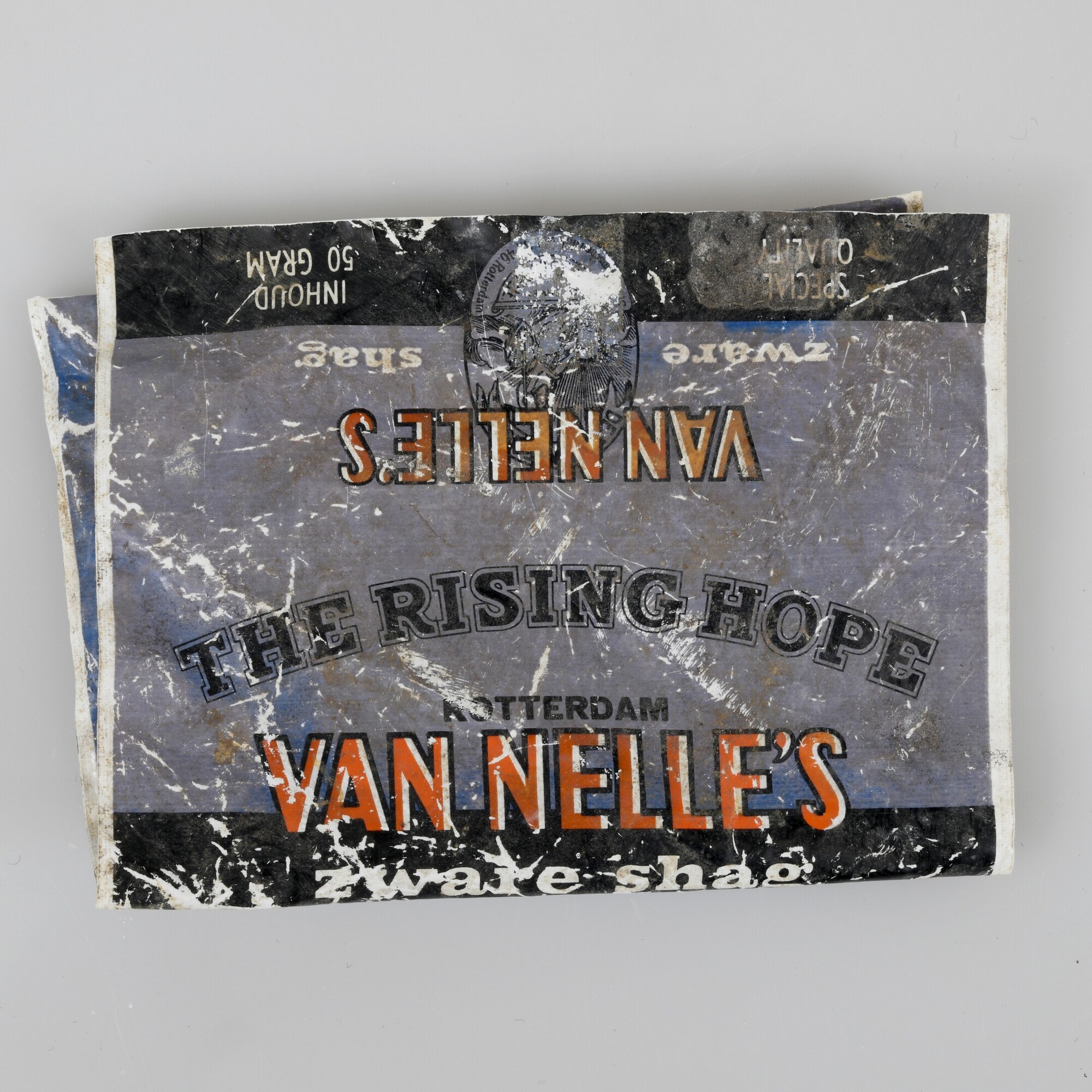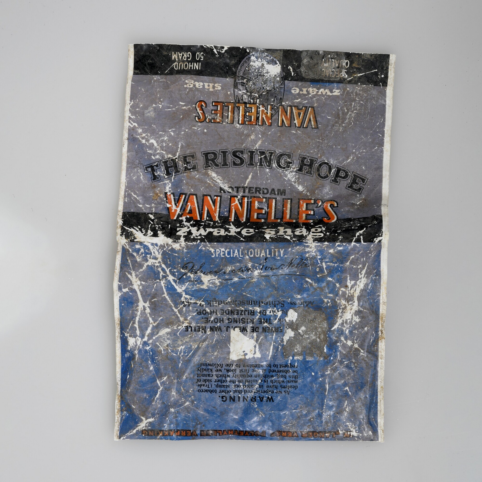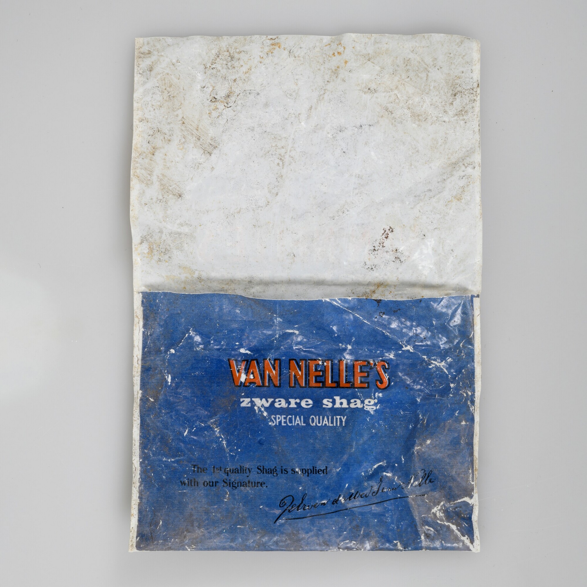 Pakje Van Nelle’s zware shag; wit plastic vel, bedrukt met blauw, zwart en oranje, deels gevouwen en geseald tot een zak. Voorzijde: "VAN NELLE'S / zware shag / SPECIAL QUALITY", "The 1st quality Shag is supplied / with our Signature. / DeErvendeWedJvanNelle [schrijfletters]". Achterzijde: "IN "LANGER VERS" POLYETHYLEEN VERPAKKING", "WARNING / As we experienced that ...