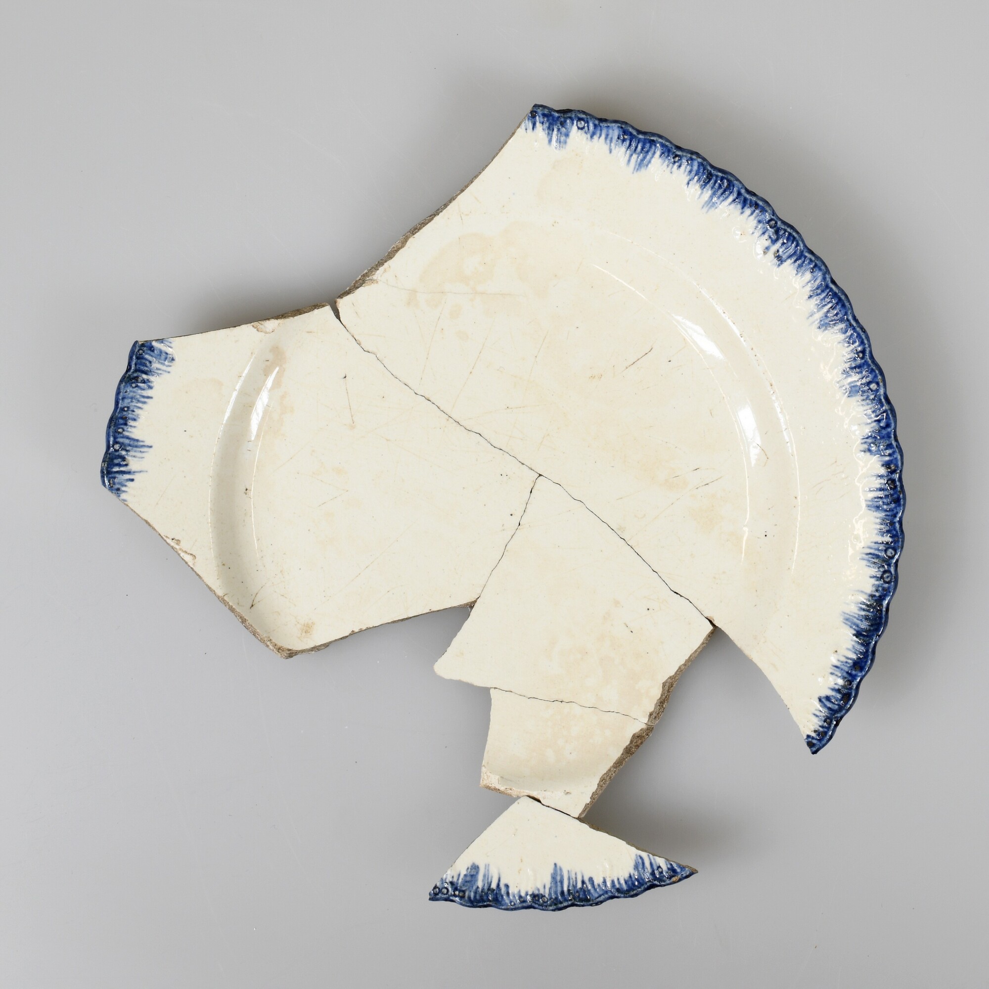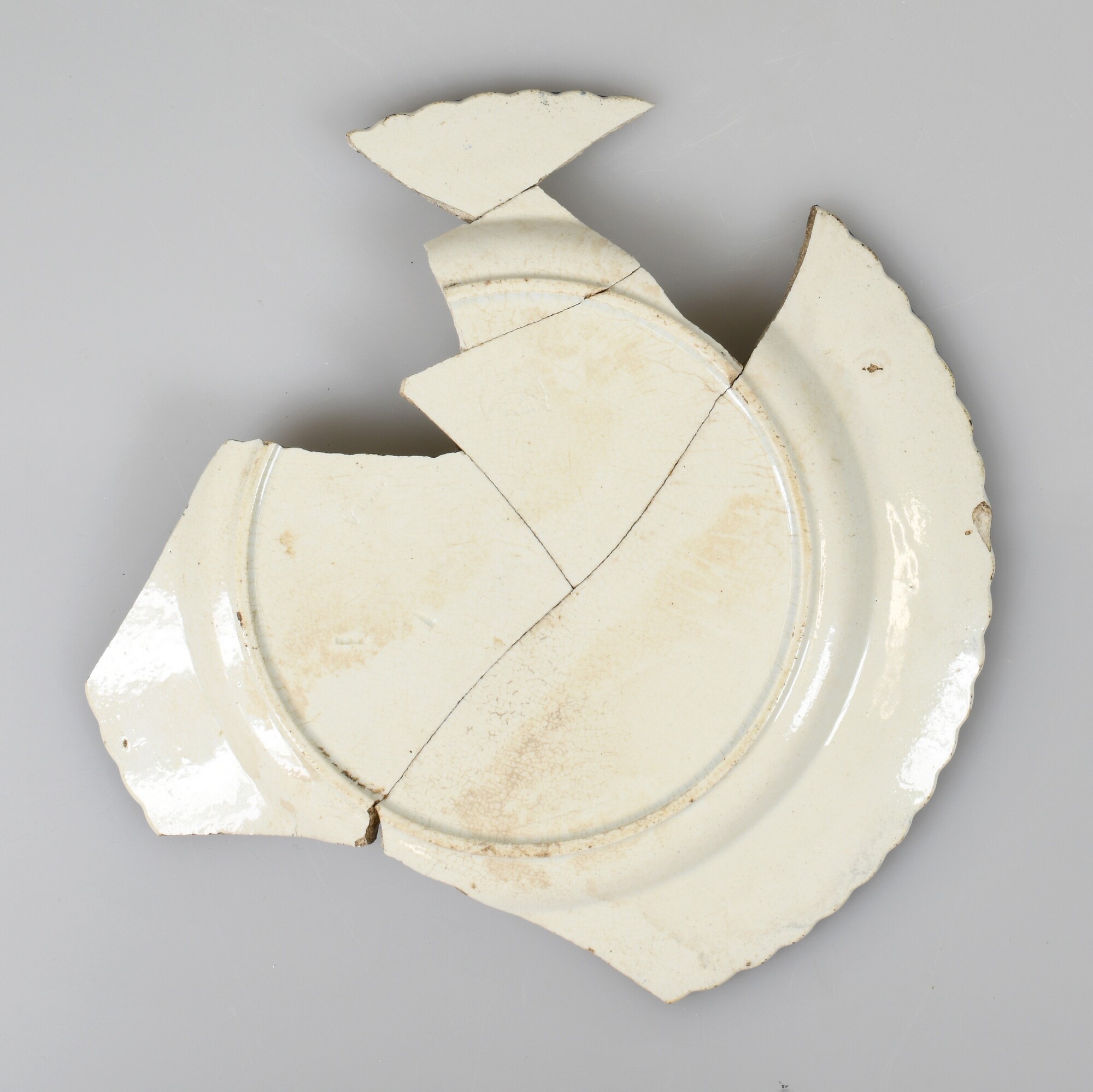 Bord; iw-bor-11; ondiep bord, vlag met reliëfversiering, knik van spiegel naar vlag, standring; industrieel wit aardewerk, witgoed; loodglazuur; blauwe "shell edge" rand; herkomst: Maastricht, G. Lambert