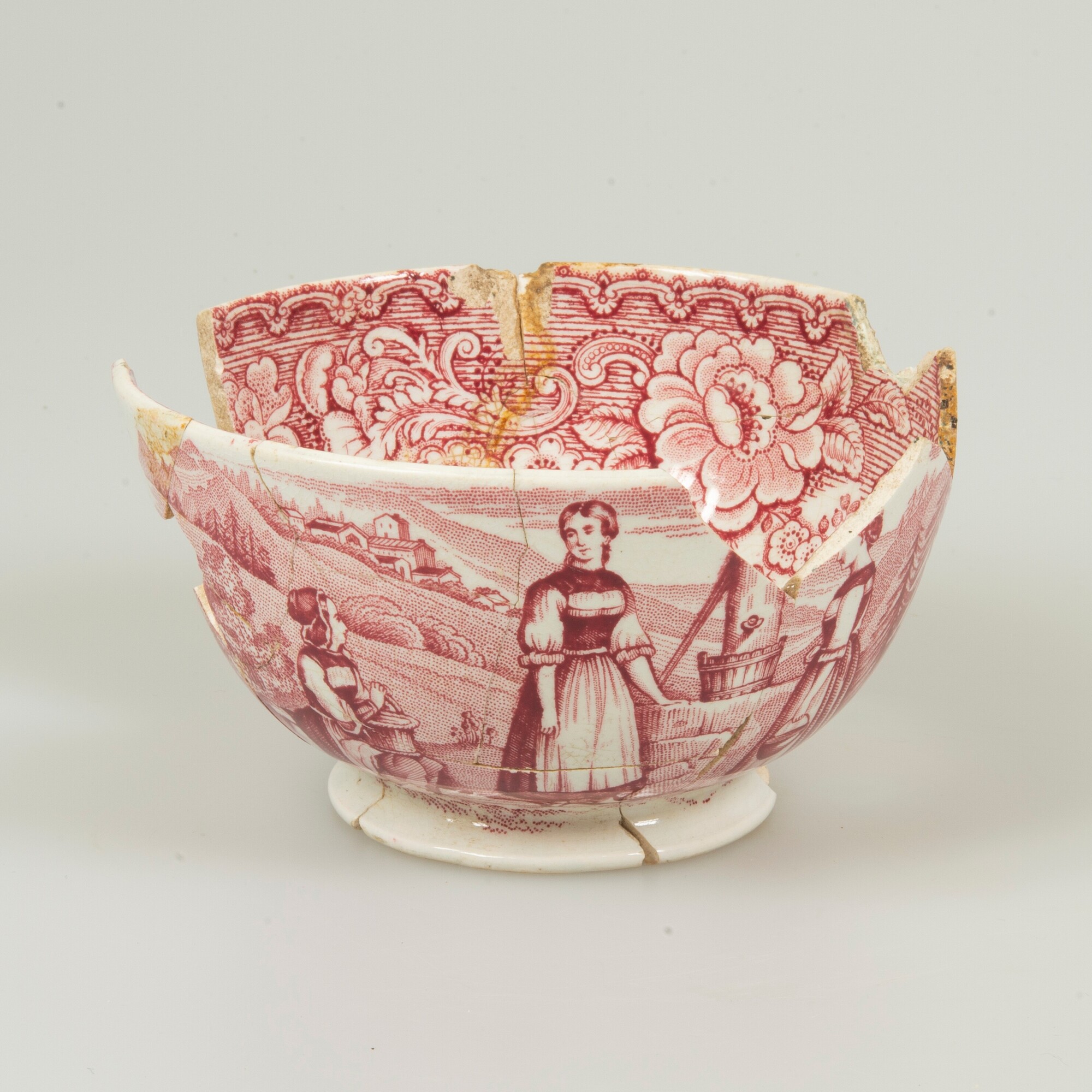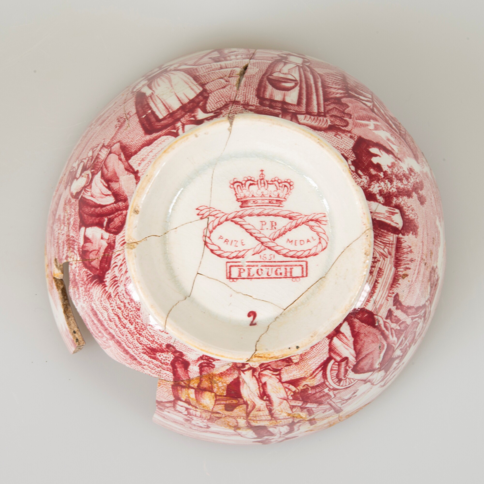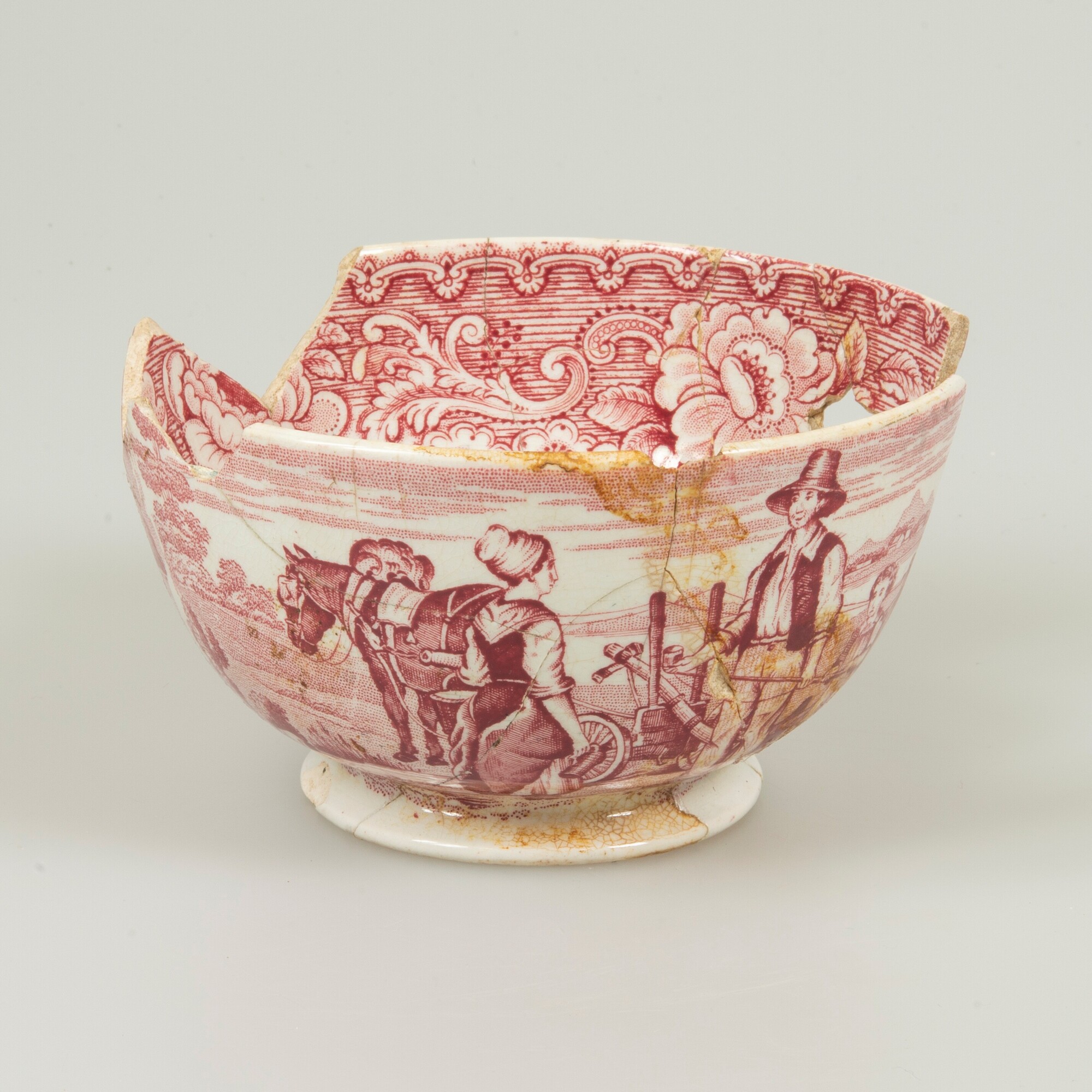 Kop; iw-kop-2; bolle kop met rechte rand, breed uitstaande standring; industrieel wit aardewerk, witgoed; loodglazuur; rood drukdecor "Plough", boerenfamilie met ploeg en bij een waterput; binnenzijde: drukdecor bloemen; herkomst: Maastricht, P. Regout