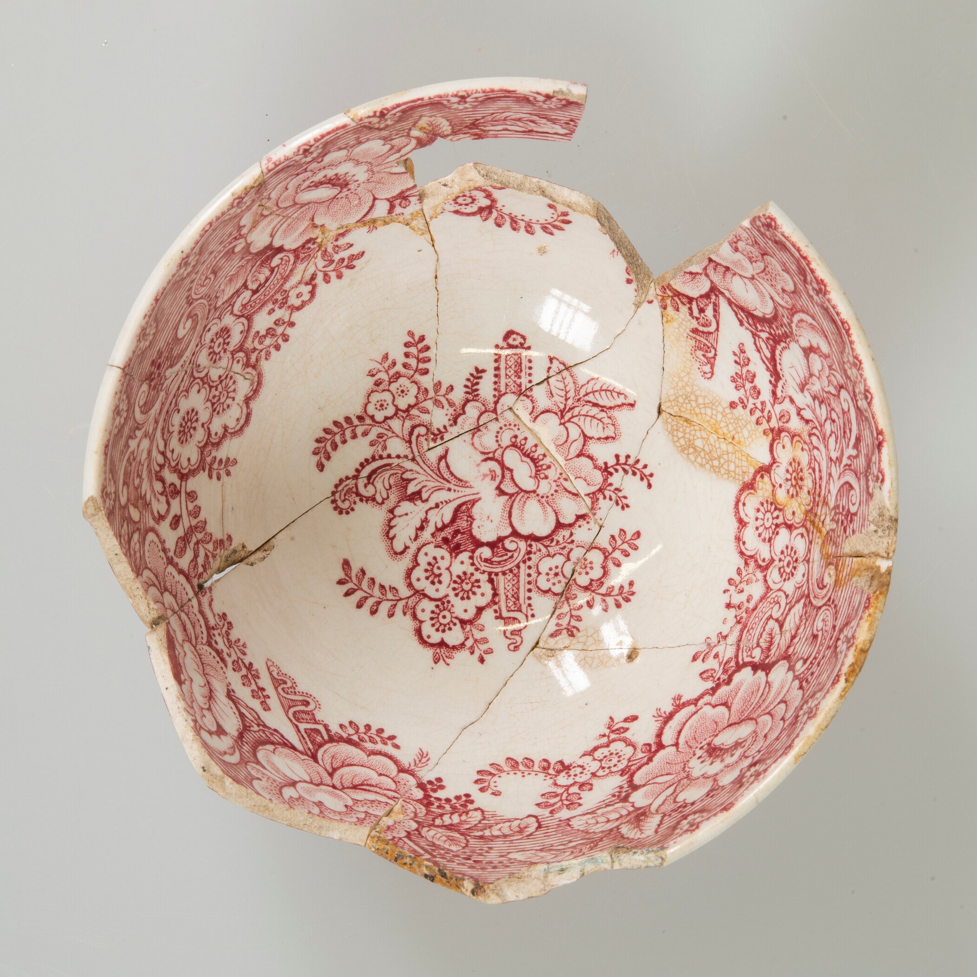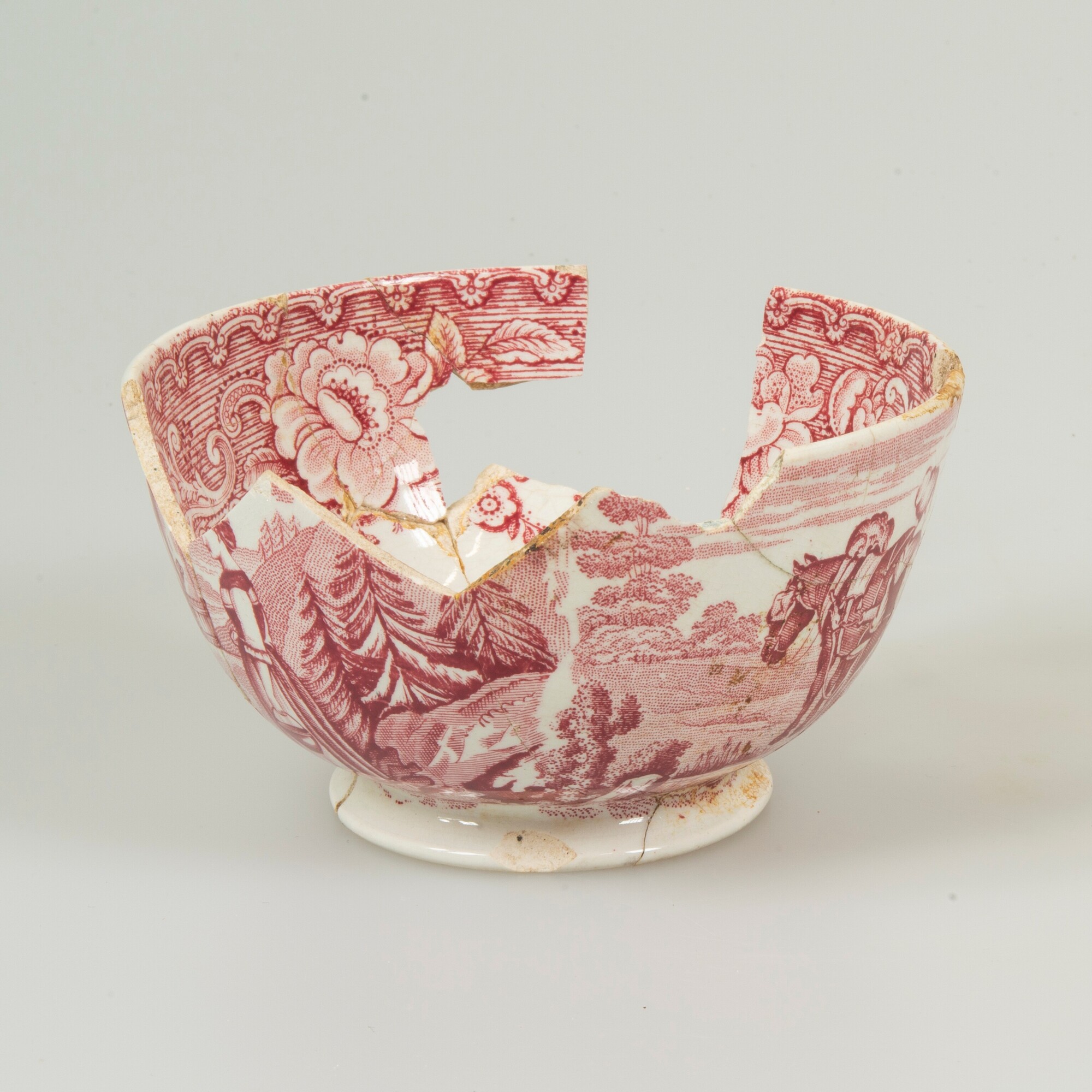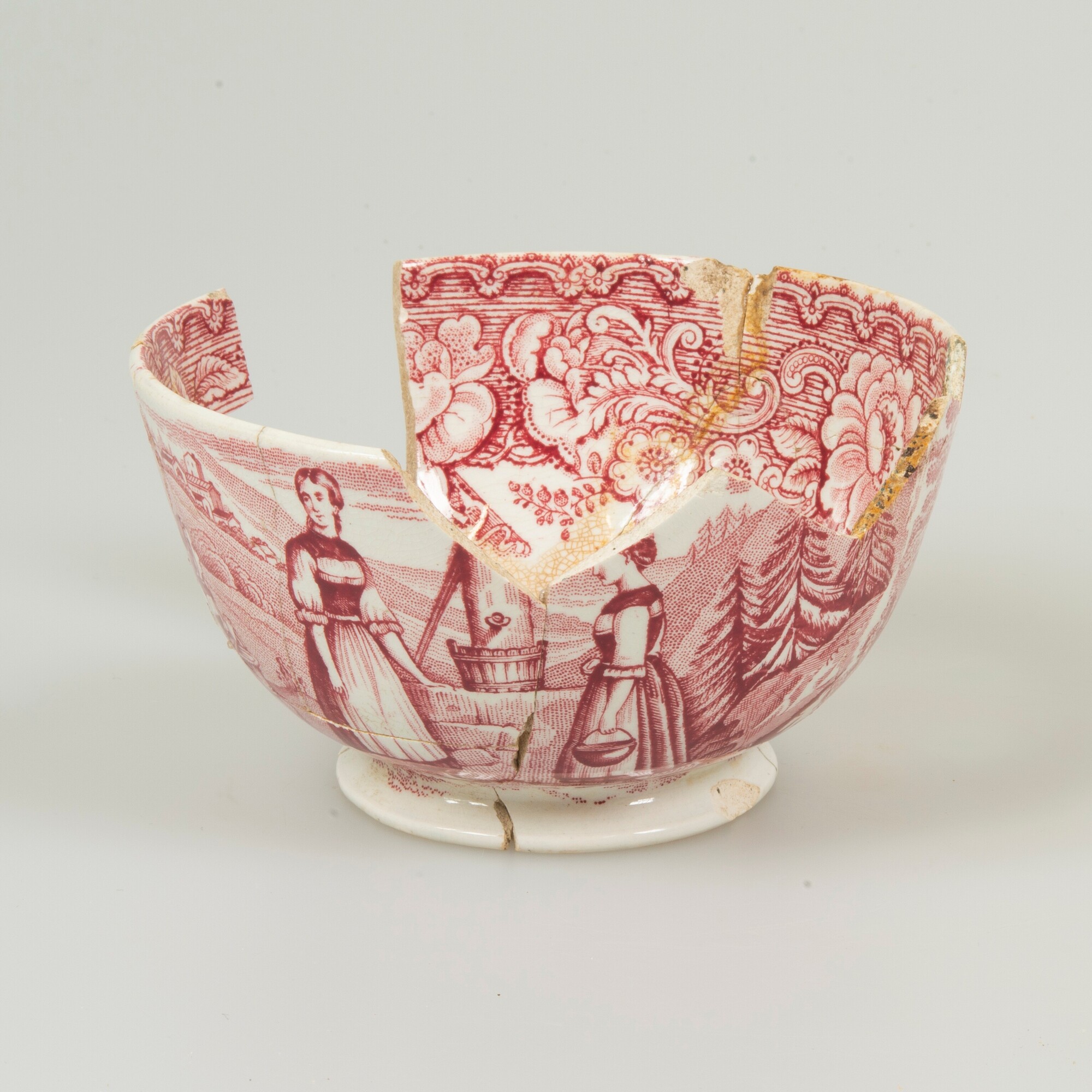Kop; iw-kop-2; bolle kop met rechte rand, breed uitstaande standring; industrieel wit aardewerk, witgoed; loodglazuur; rood drukdecor "Plough", boerenfamilie met ploeg en bij een waterput; binnenzijde: drukdecor bloemen; herkomst: Maastricht, P. Regout