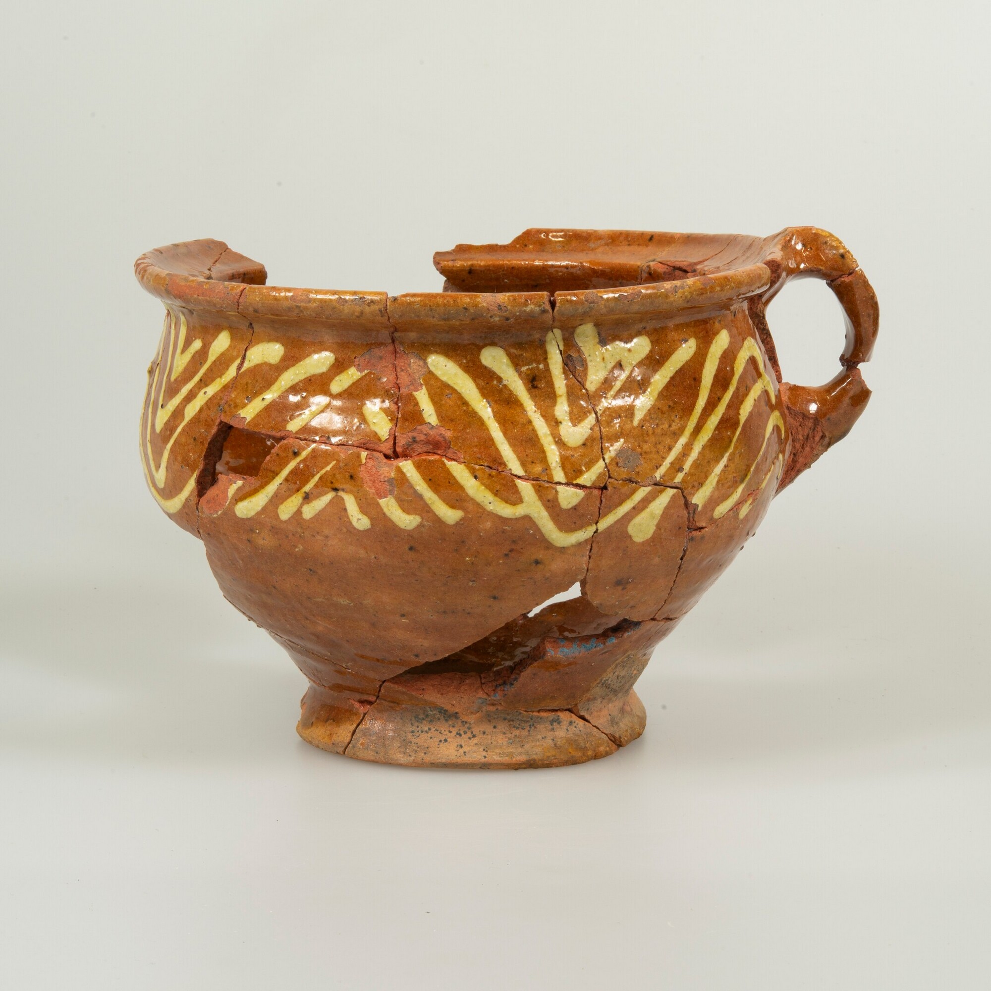 Pispot; r-pis-16; bolle pispot met hoge schouder en geknikte rechte rand, standring; roodbakkend aardewerk; loodglazuur; slibversiering van gestileerde tulpen op de schouder; verticaal geknepen oor; herkomst: Friesland