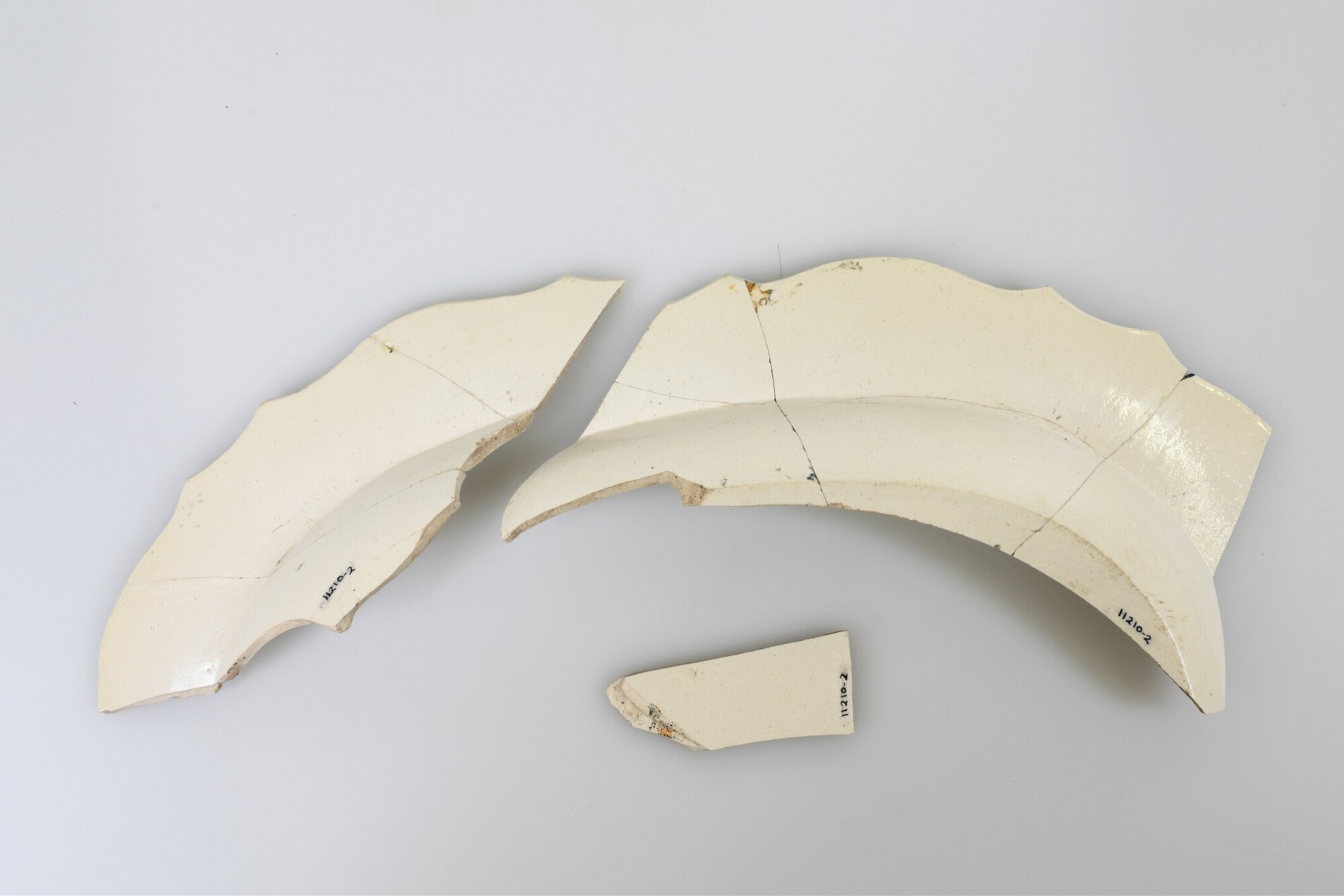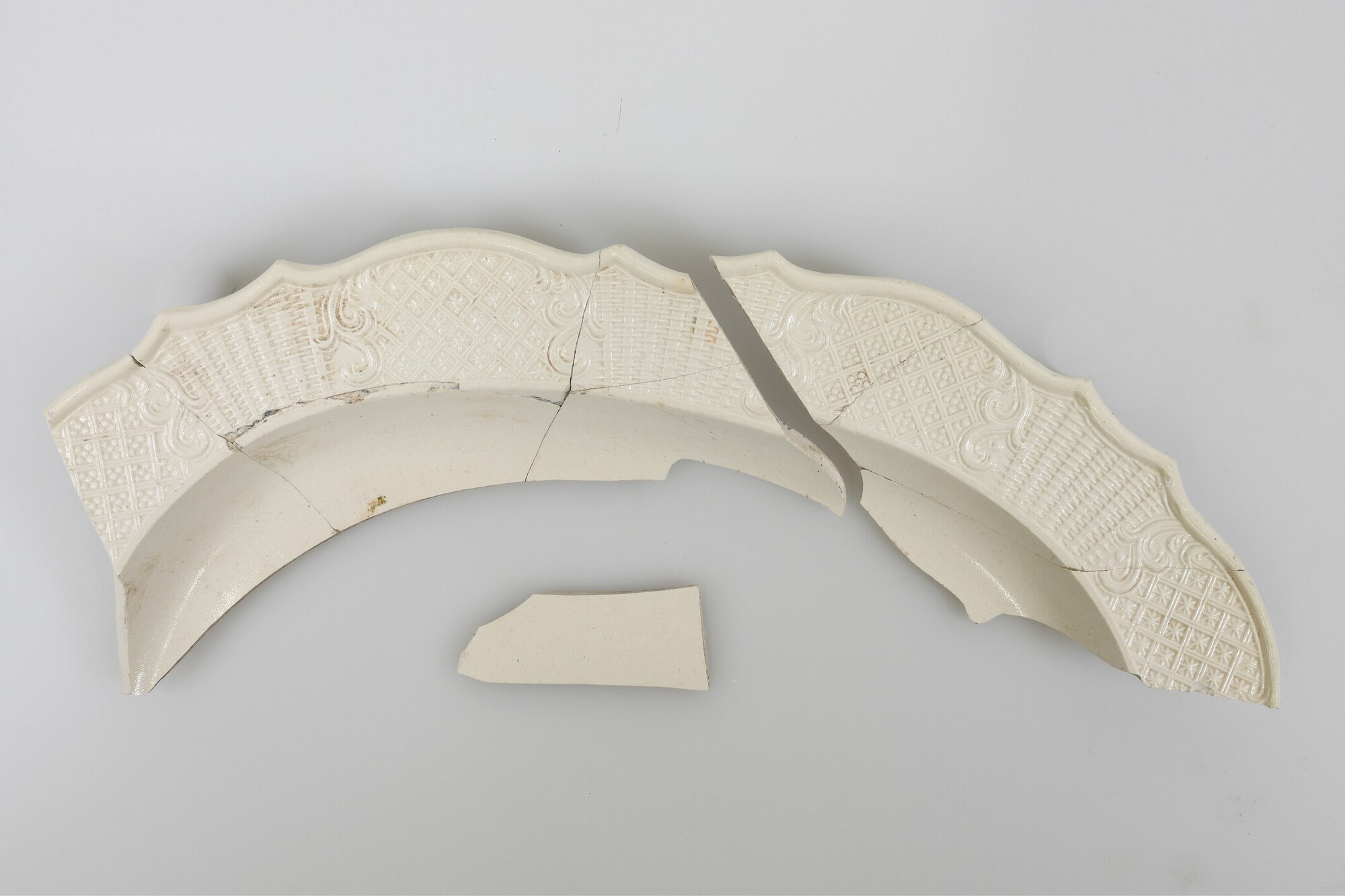 Schaal; s3-sch-1; schaal met naar buiten geknikte platte vlag met reliëfversiering; industrieel steengoed; zoutglazuur; white salt-glazed stoneware; reliëf basketweave rand, afgewisseld met servetwerk en roccailles; standvlak; herkomst: Engeland
