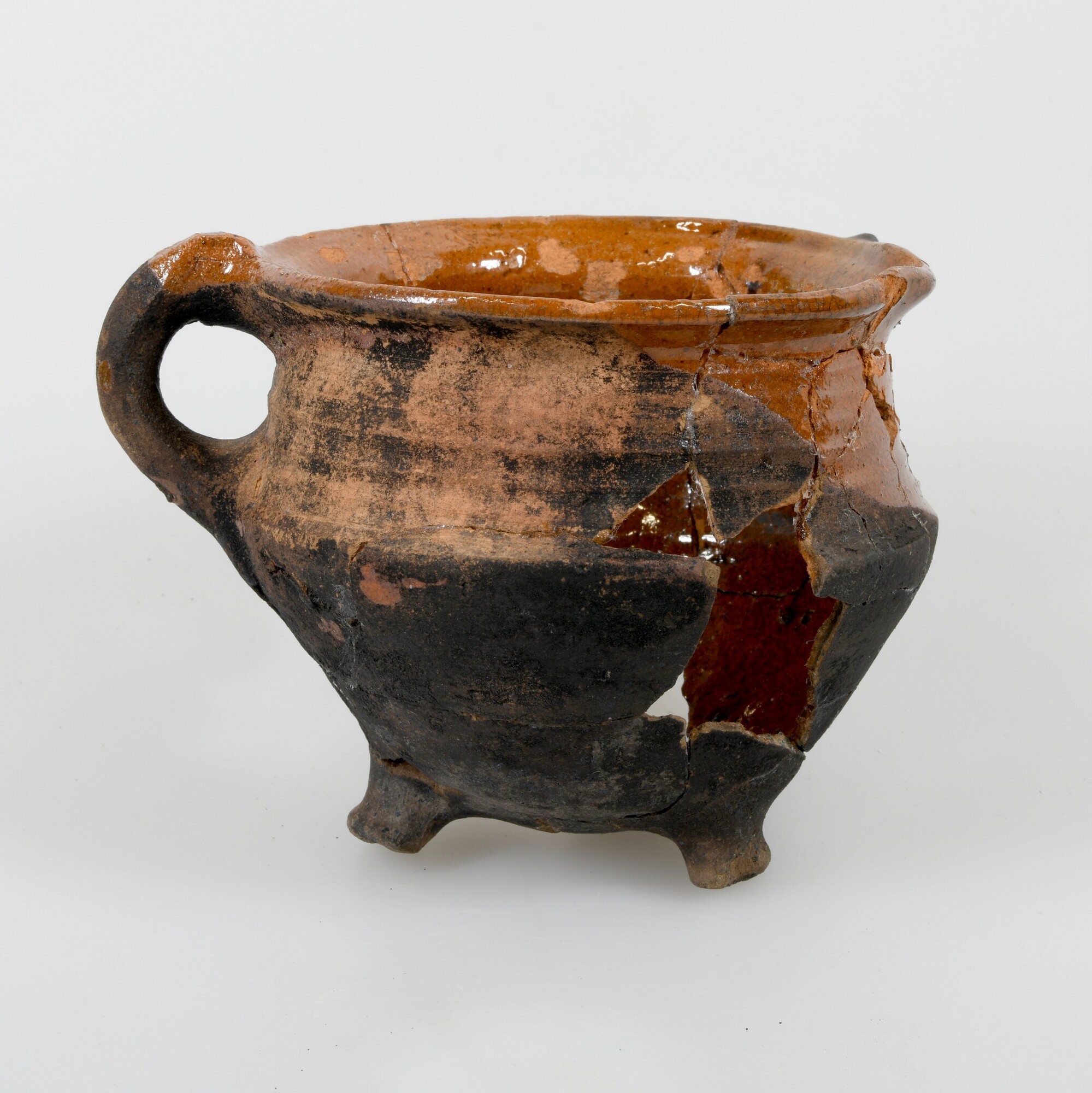 Grape; r-gra-33; grape met scherpe buikknik en iets uitgebogen rand; roodbakkend aardewerk; inwendig loodglazuur; drie poten (een ontbreekt); geknepen worstoor; schenklip; uitwendig beroet