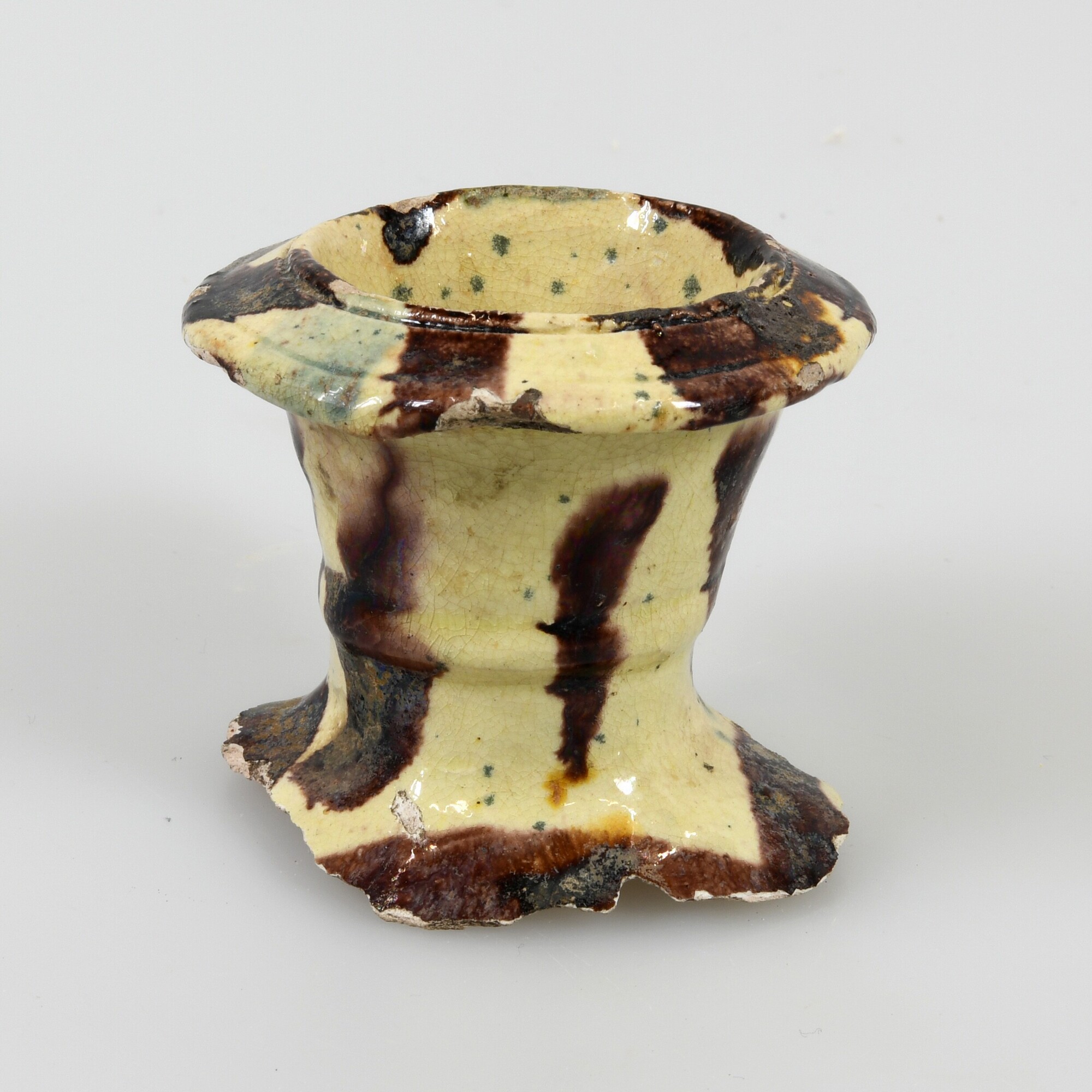 Vaas; fragment hals van een altaarvaas of tulpenvaas; wf-vaa-; Frans witbakkend aardewerk; loodglazuur; bruine en blauwgroene vlekken; herkomst: Saintonge