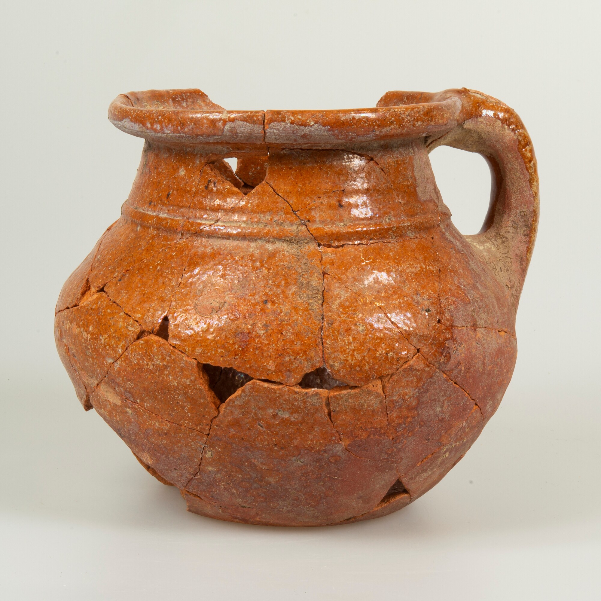 Pispot; r-pis-1; bolle pispot met buik vloeiend overgaand in hals, uitgebogen rand met dekselgeul, holle bodem; roodbakkend aardewerk; loodglazuur; worstoor