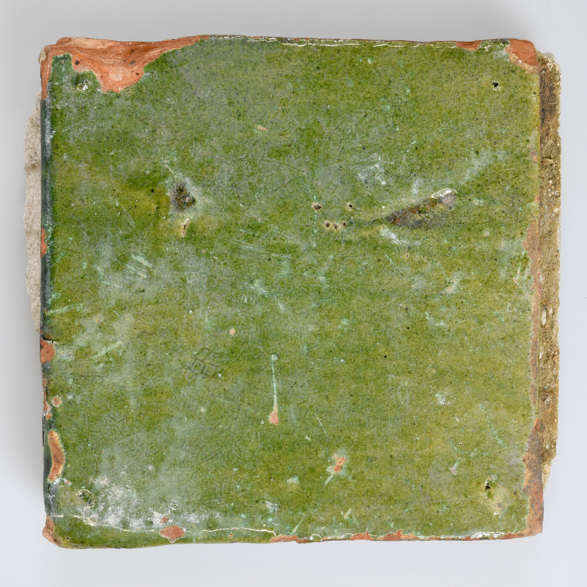 Plavuis; roodbakkend aardewerk; bovenzijde witte kleisliblaag met loodglazuur en koperoxide; mortel aan de onderzijde; herkomst: Nederlanden