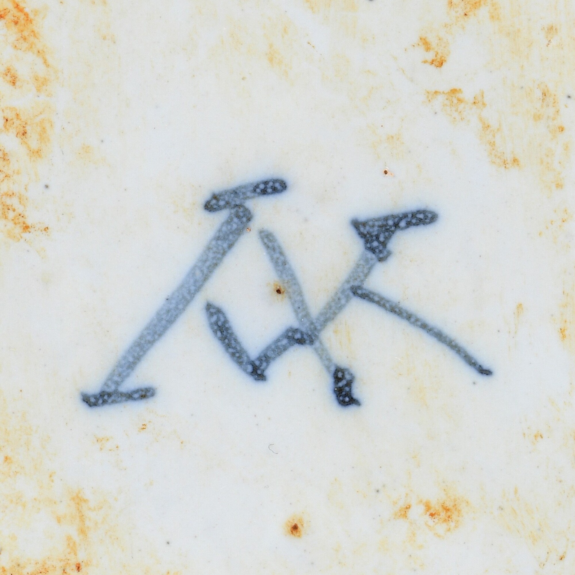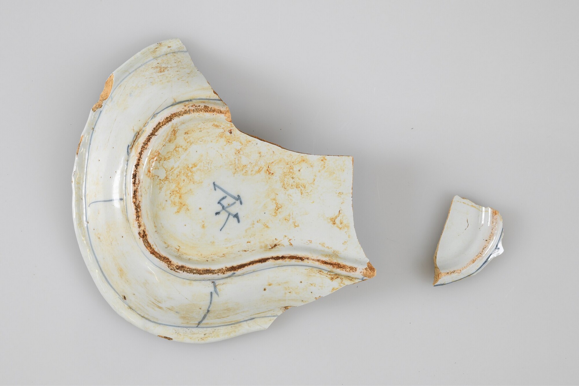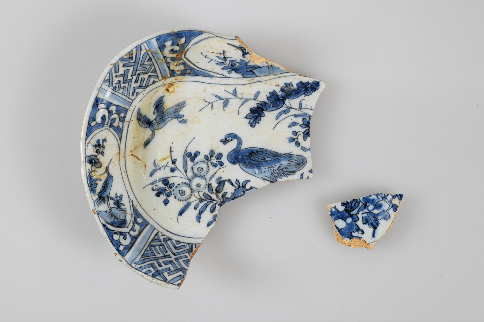 Schaal; f-sch-; faience; achtvormig; standring; blauwe beschildering: vlag: vakken met vogels (reiger) en geometrische figuren; spiegel: vogels (zwaan) en bloemranken; merkteken op onderzijde; herkomst: Delft