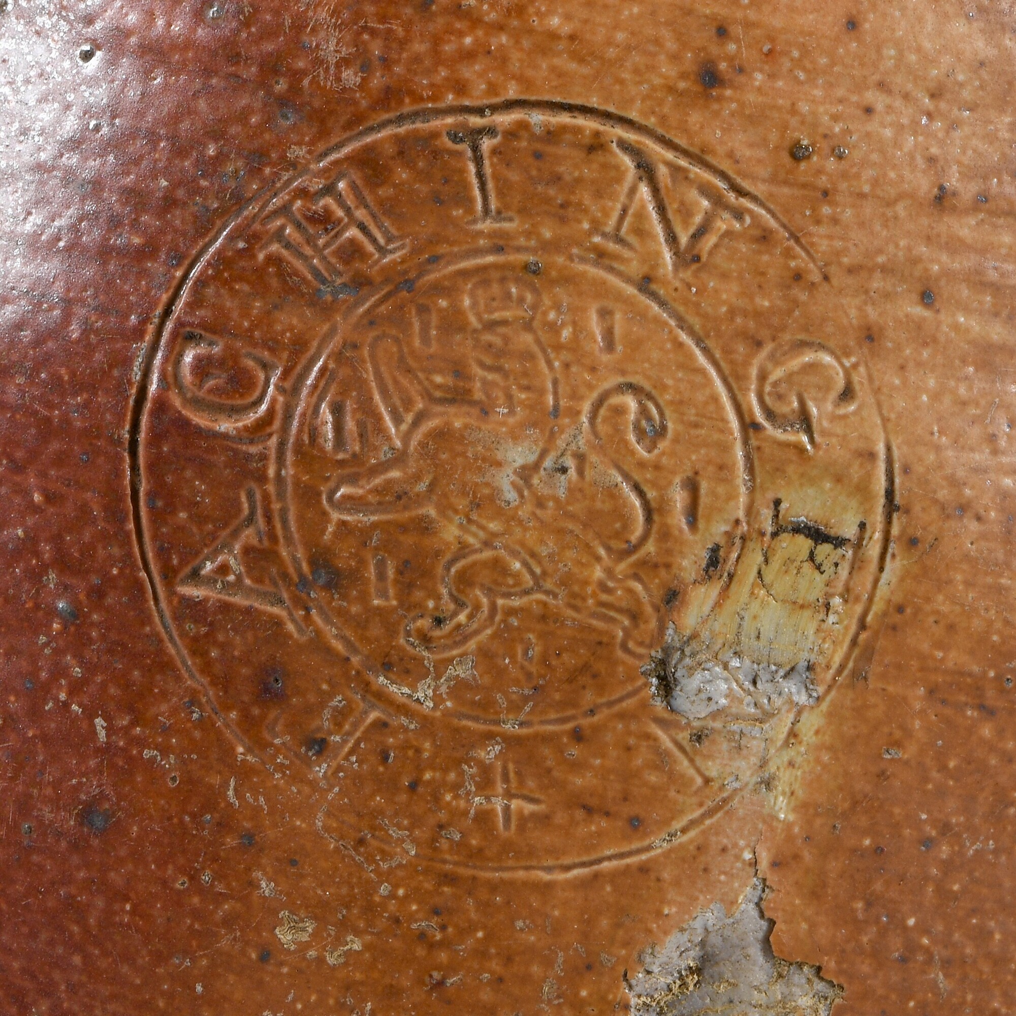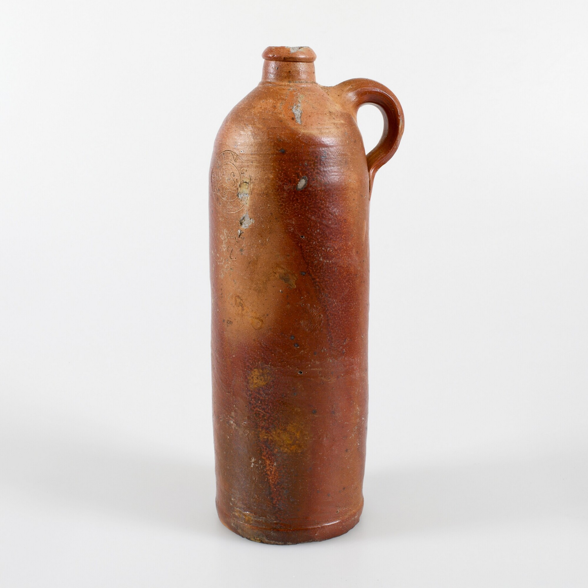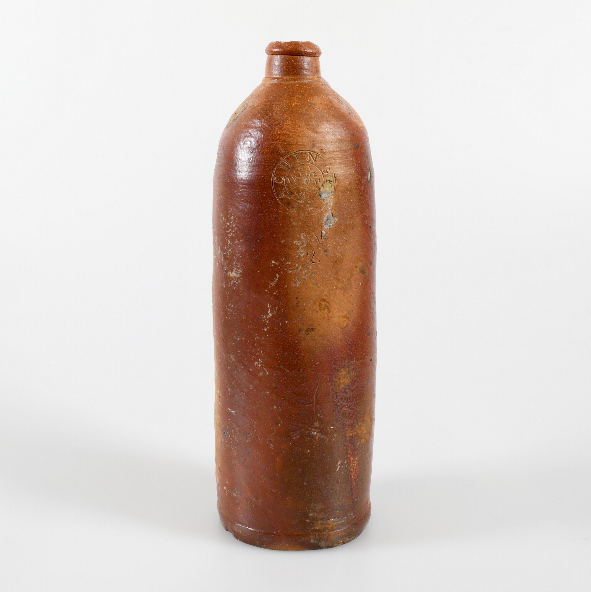 Mineraalwaterfles; s2-fle-4; steengoed geglazuurd; cilindrische fles met afgeronde schouder, korte cilindrische nek met verdikte lip, platte/holle bodem; herkomst: Duitsland