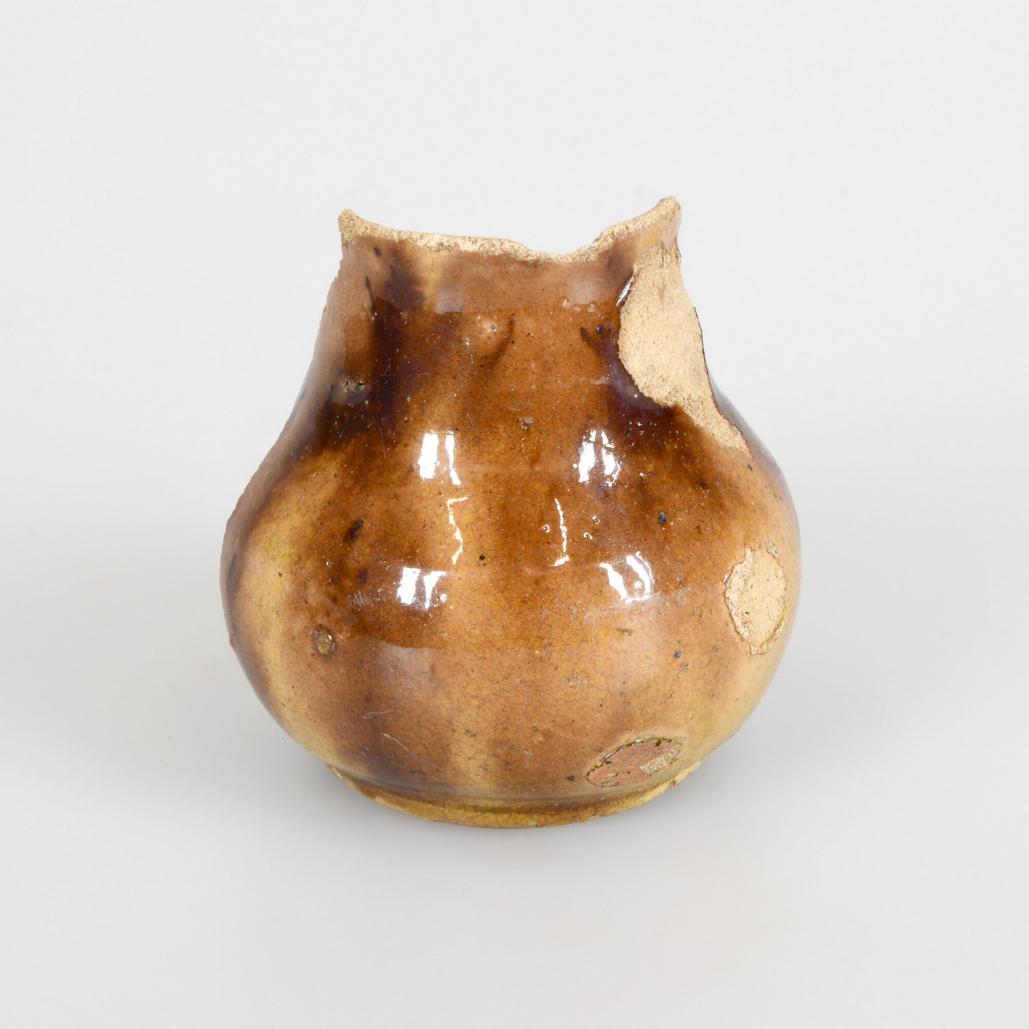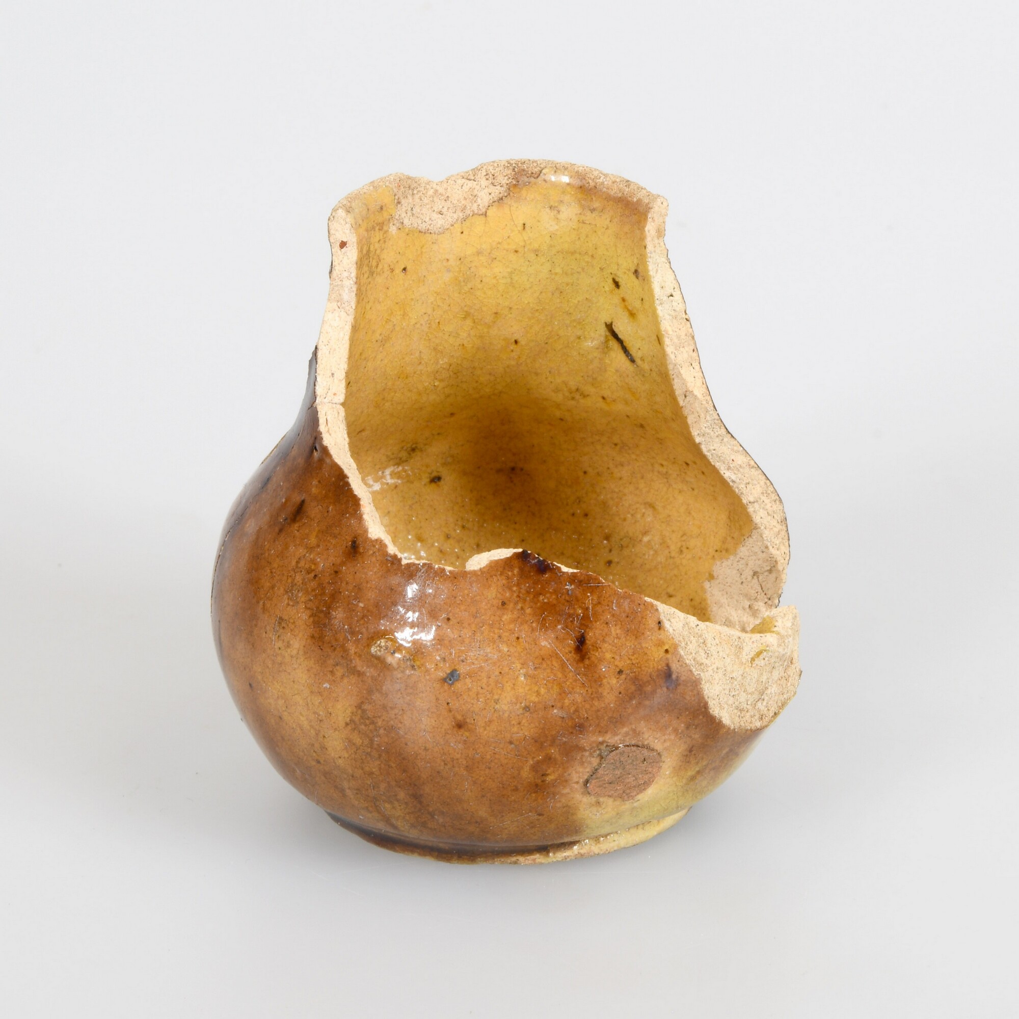 Miniatuur kan; w-kan-?; Fries witbakkend aardewerk met vlekken van mangaanoxide (vlekkengoed); bolle kan met brede hals