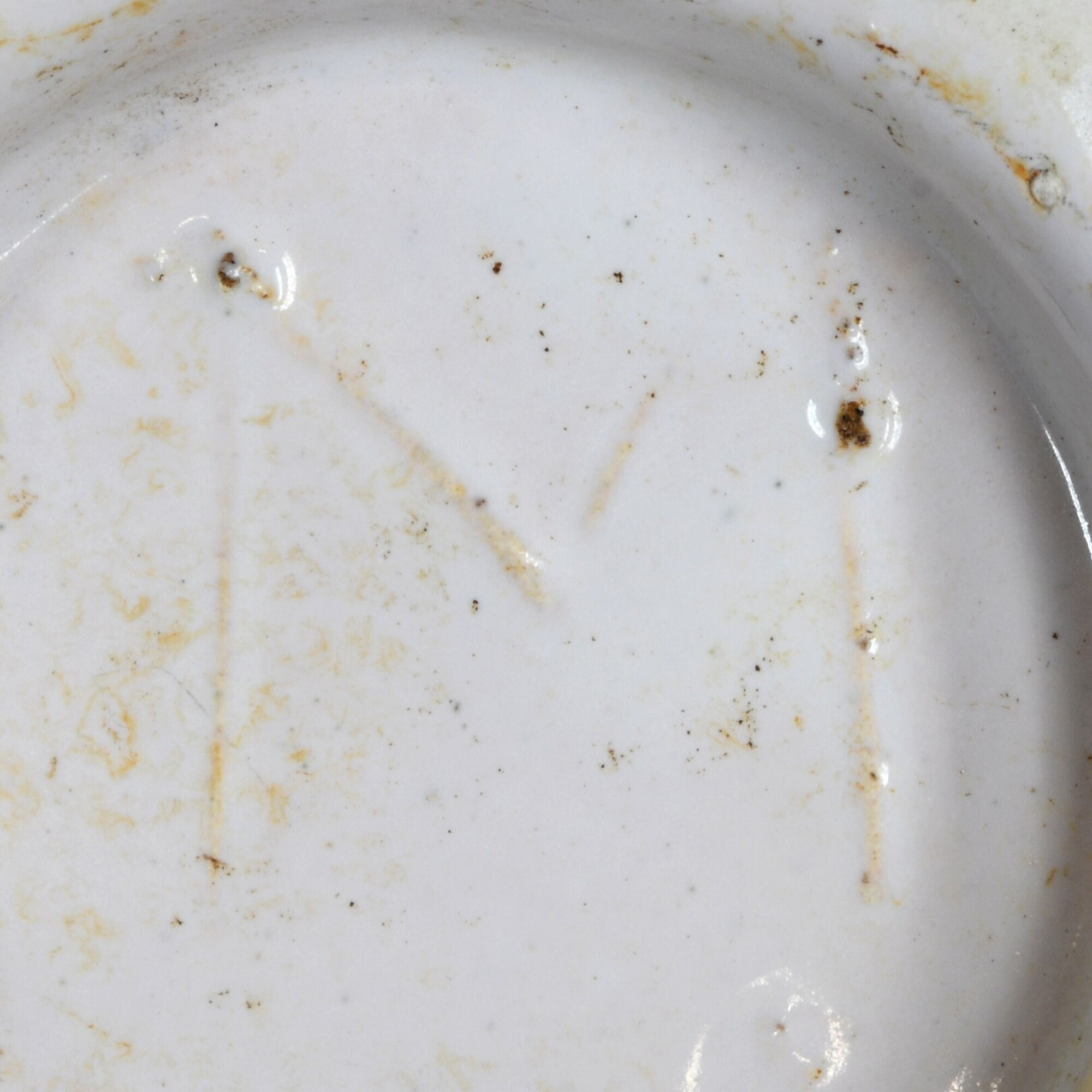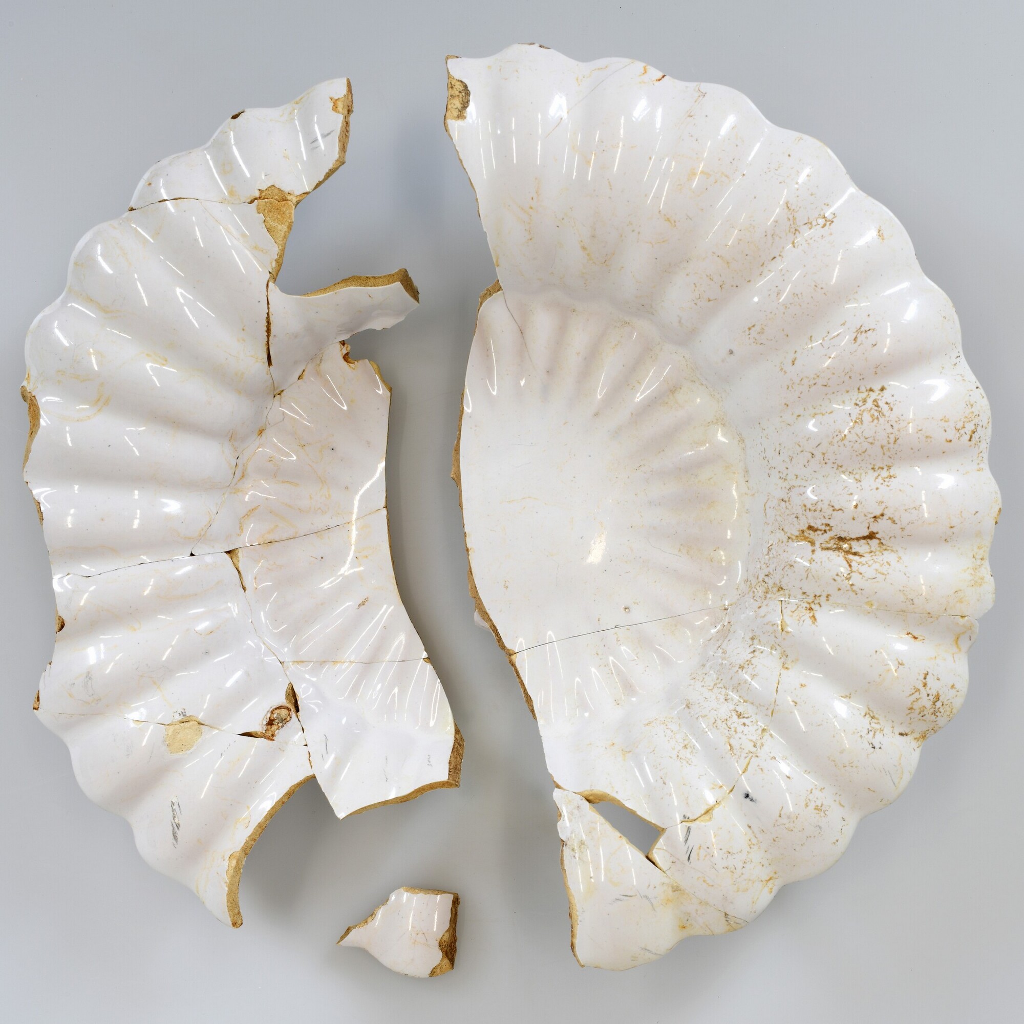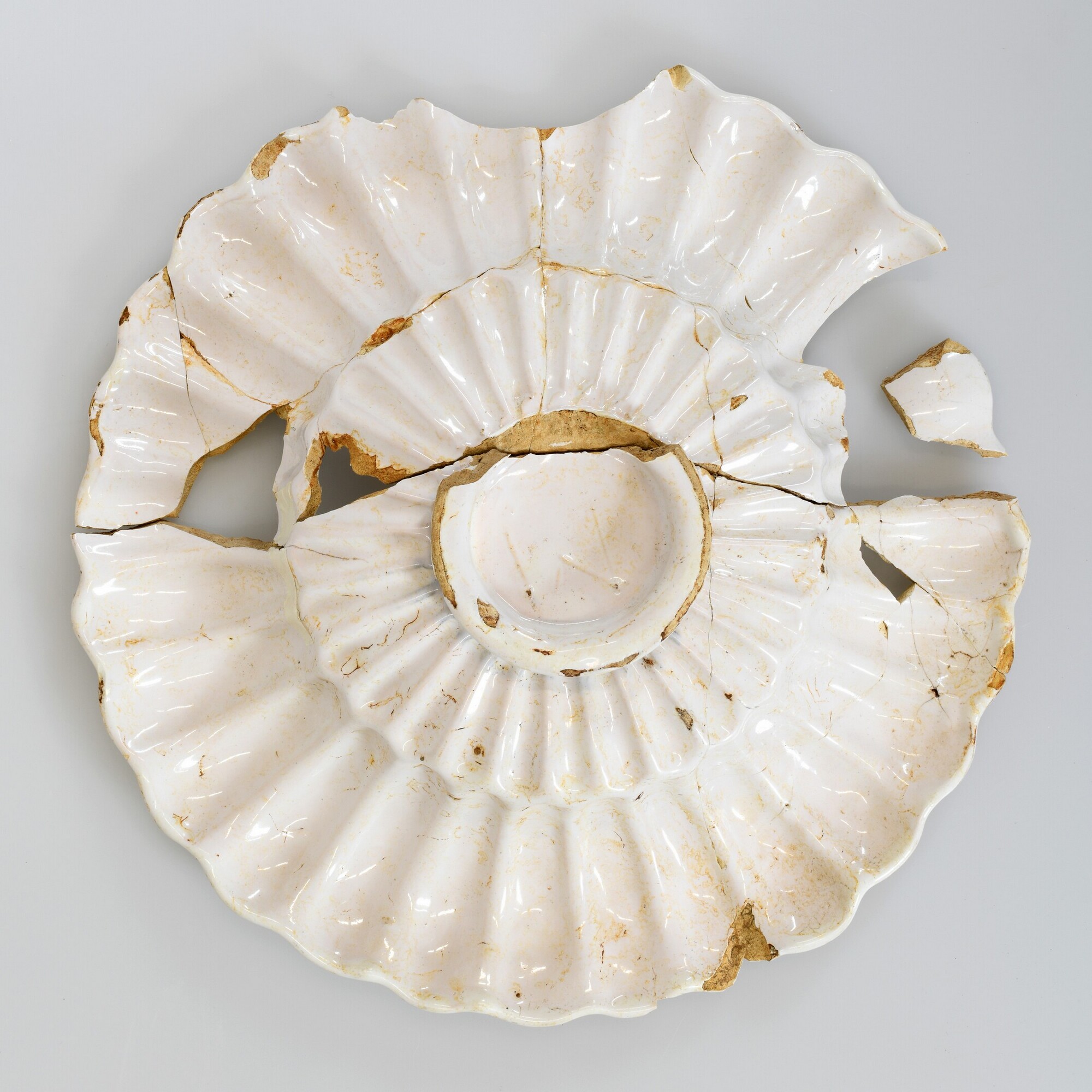 Plooischotel; f-plo-1; faience; plooischotel met knik van spiegel naar vlag, vlag in spiegel geplooid, op; standring; blindmerk: M; herkomst: Frankrijk(?)