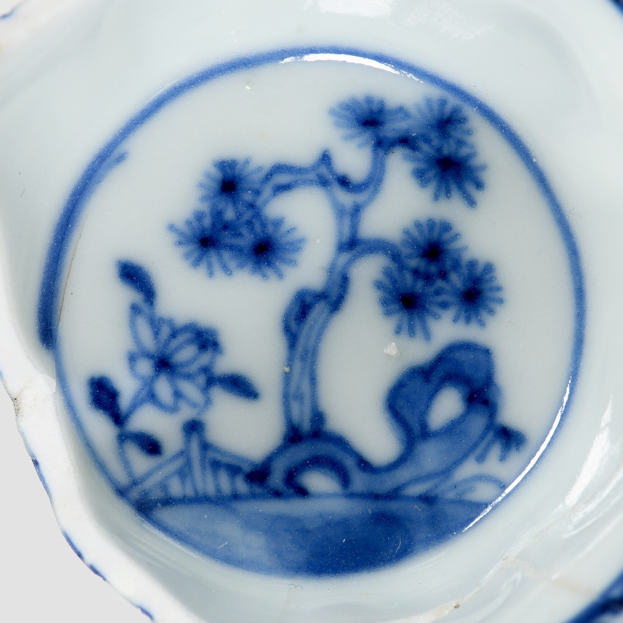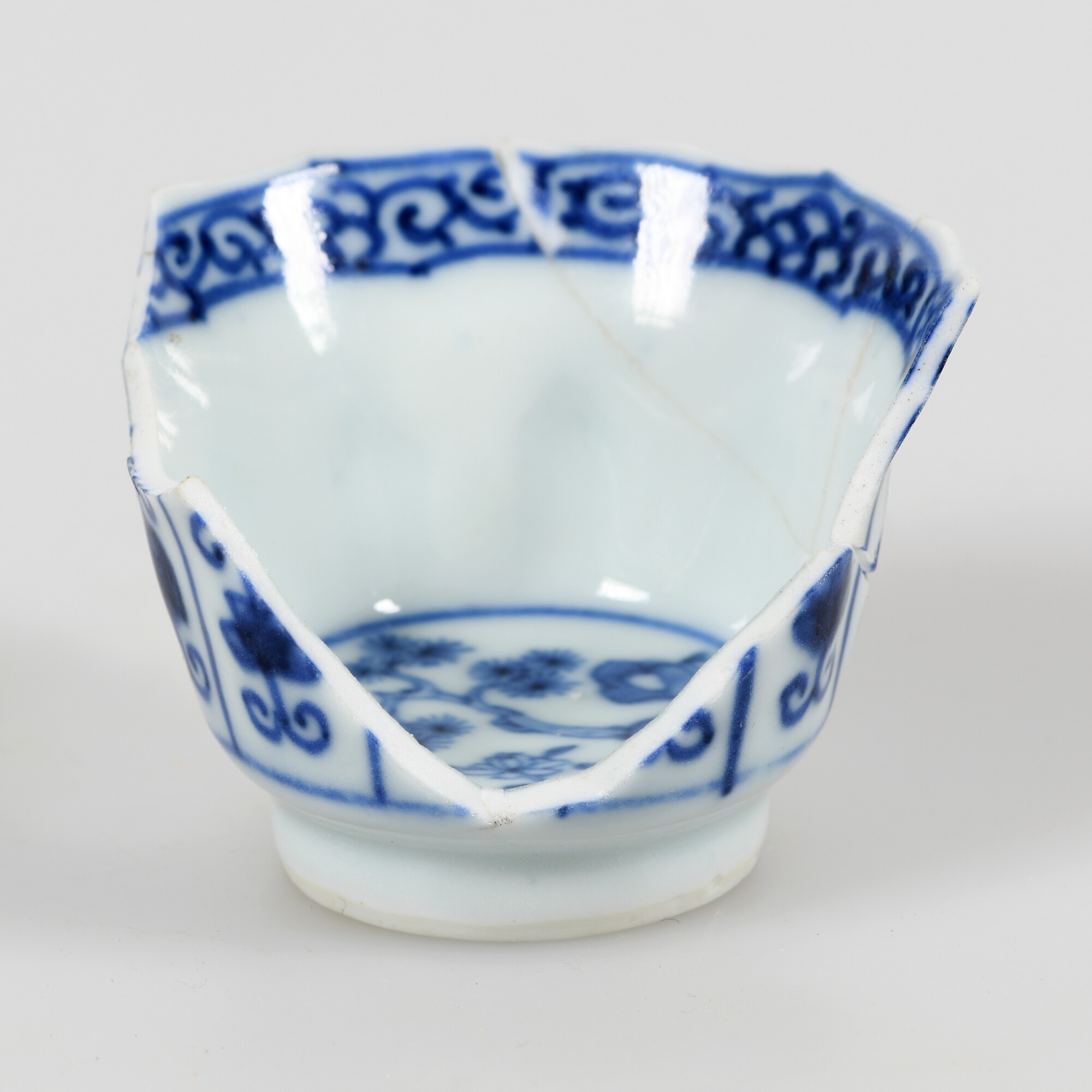 Kop; p-kop-10; in mal gevormde afgeronde kop met schulprand, standring; Aziatisch porselein; veldspaatglazuur; onderglazuur blauwe beschildering: uitw. panelen met florale motieven, inw. tuinlandschap; herkomst: China