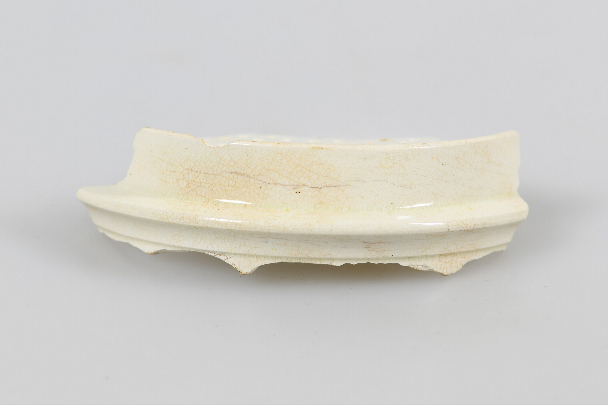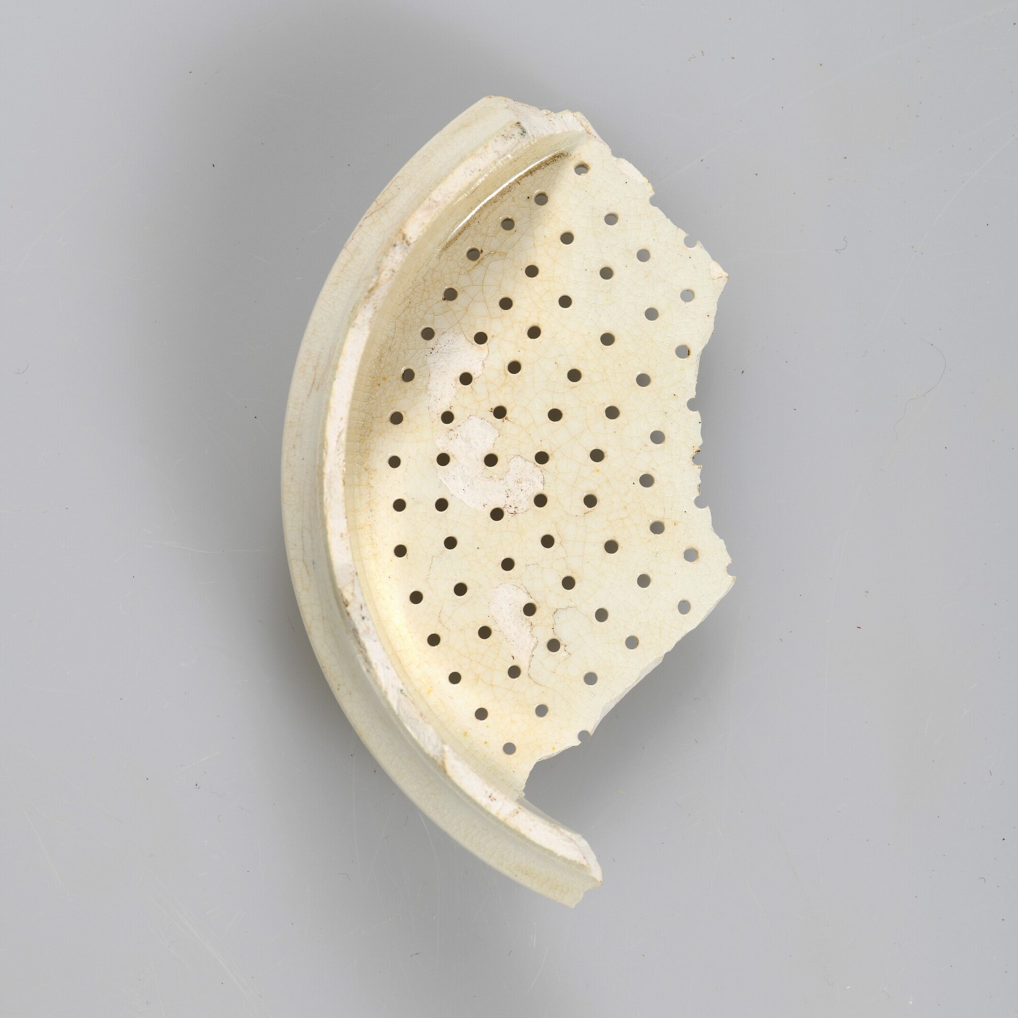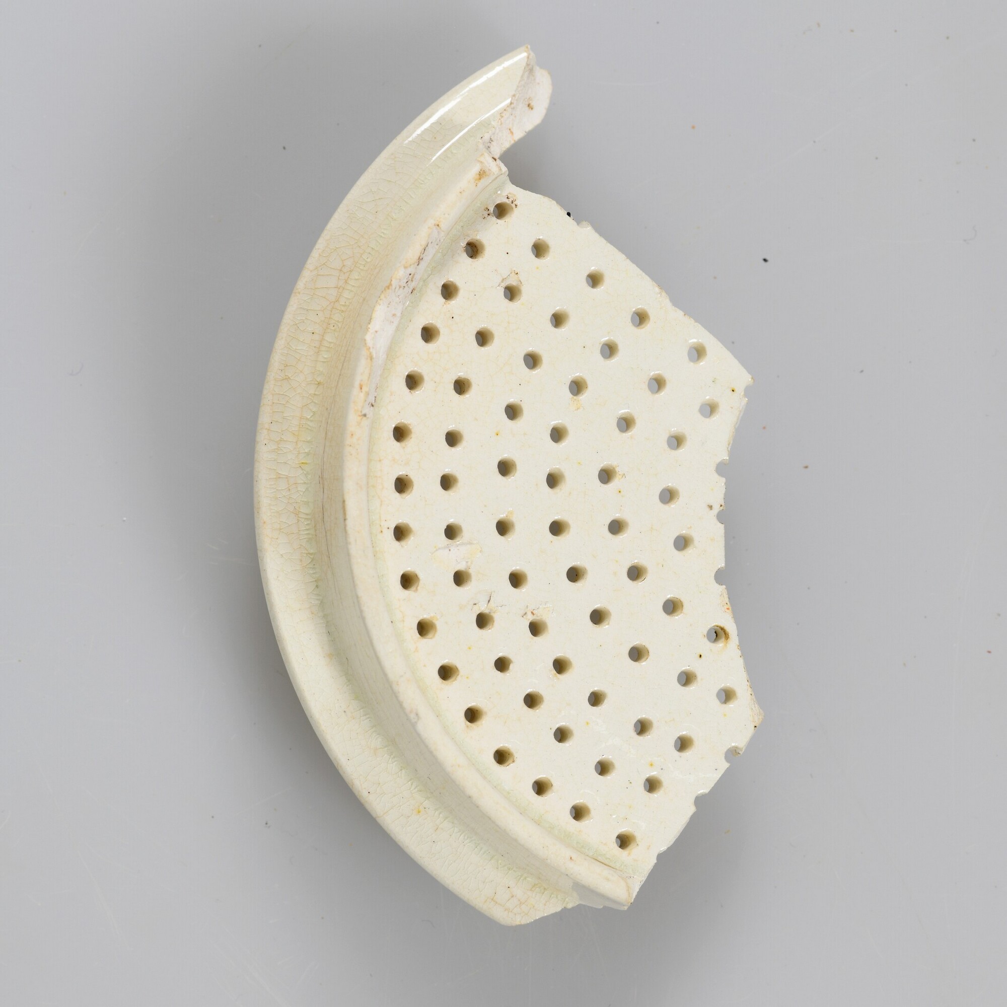 Koffielfilter/zeef; iw-zee-6; cilindrische vorm met perforaties in de bodem; fragment; industrieel wit aardewerk (creamware); loodglazuur; herkomst: Engeland