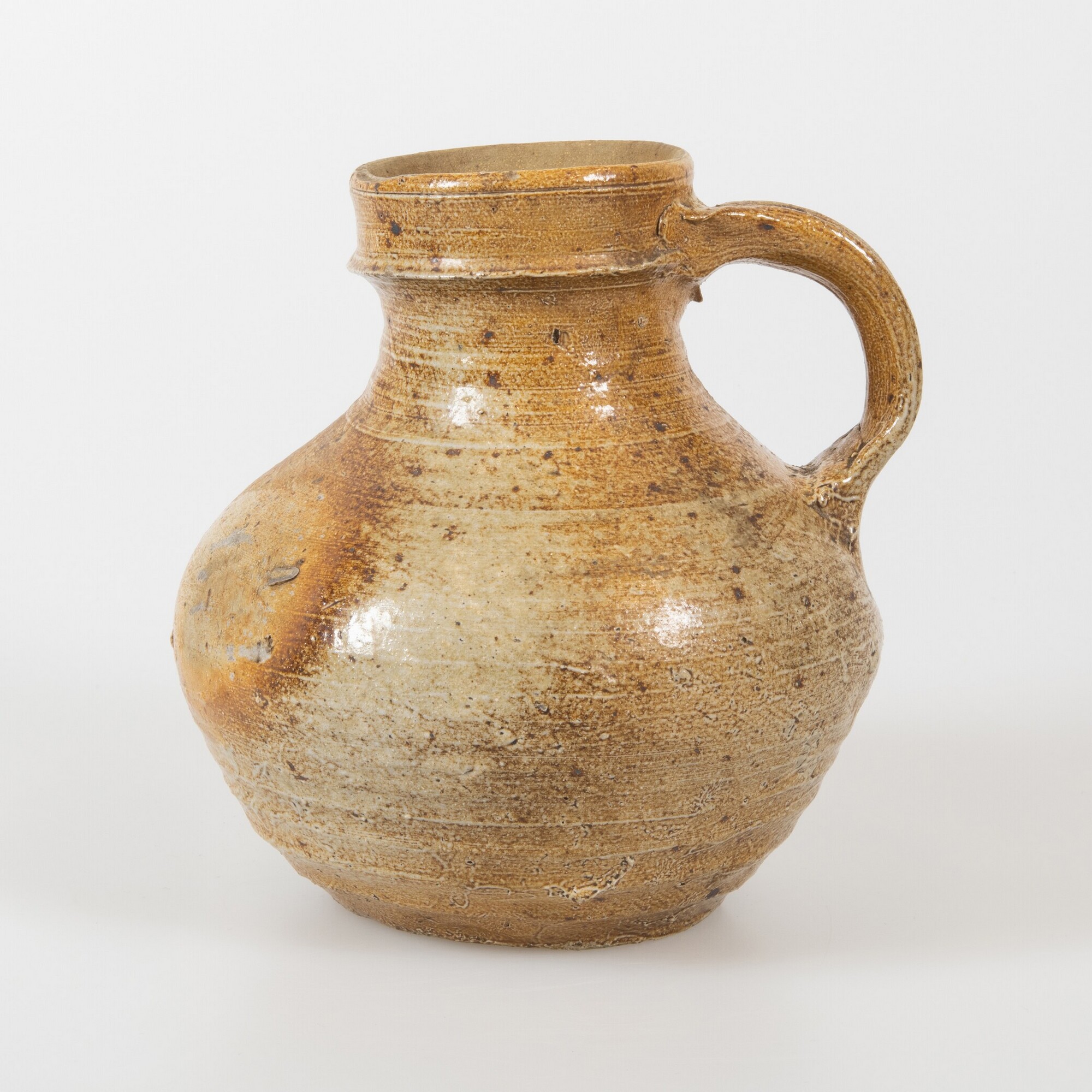 Kan; s2-kan-45; zeer bolle gedrongen kan met wijde hals en kraagrand, standvlak, verticaal lintoor; steengoed met oppervlaktebehandeling: ijzerengobe en zoutglazuur; herkomst: Raeren, Rijnland