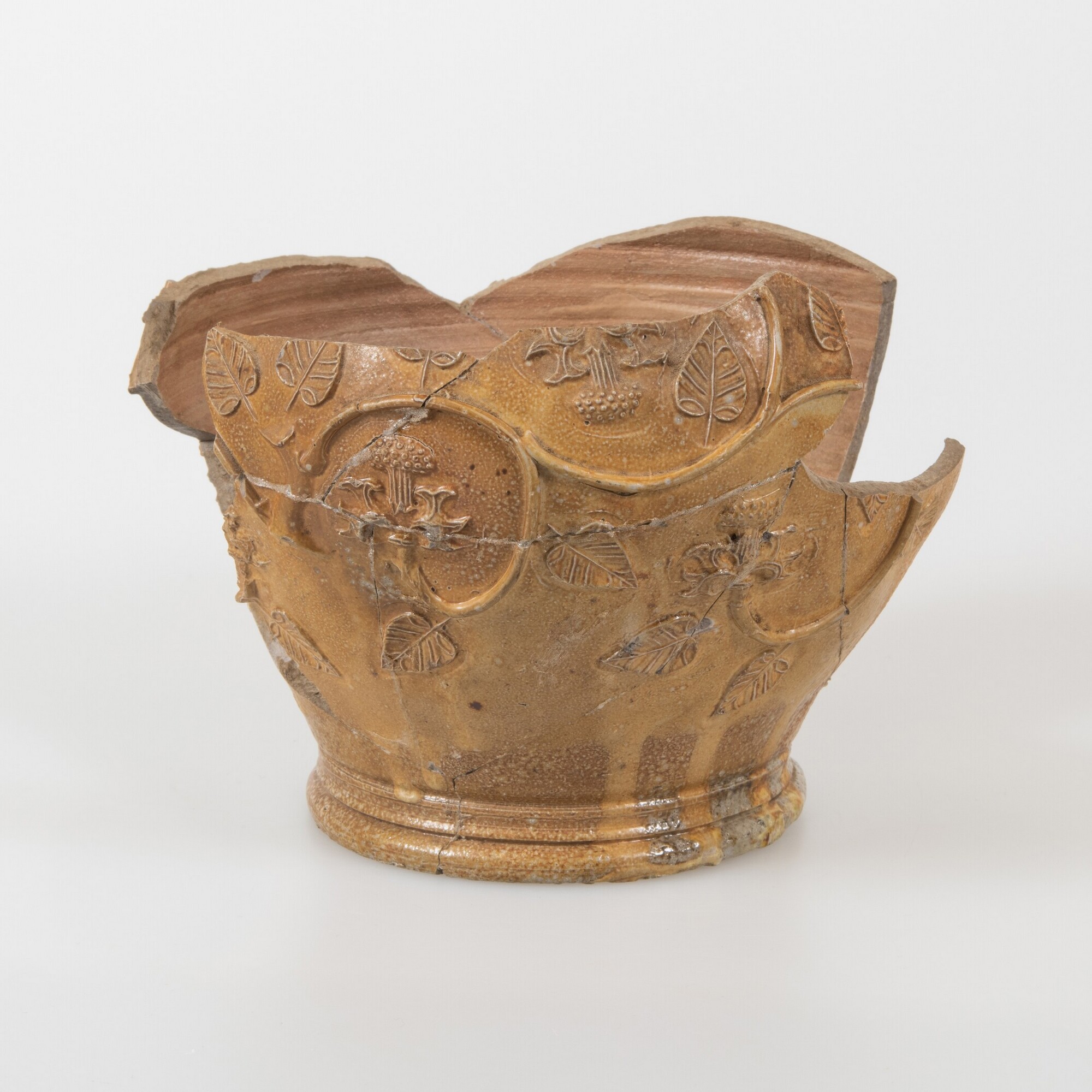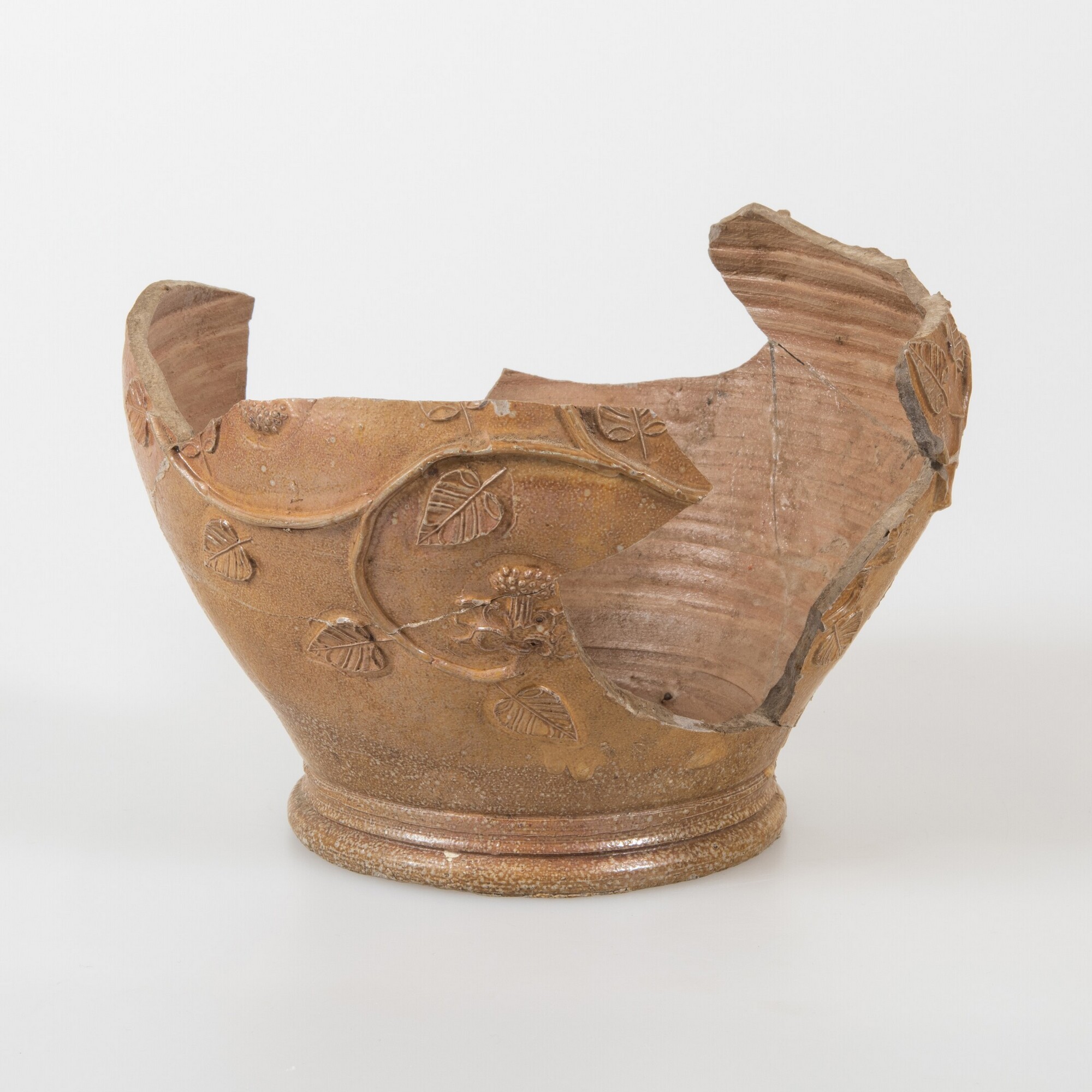 Kan; s2-kan-3?; bolle kan, standvoet; steengoed; zoutglazuur; buik versierd met bladerranken en bloemen; productiecentrum: vermoedelijk Keulen
