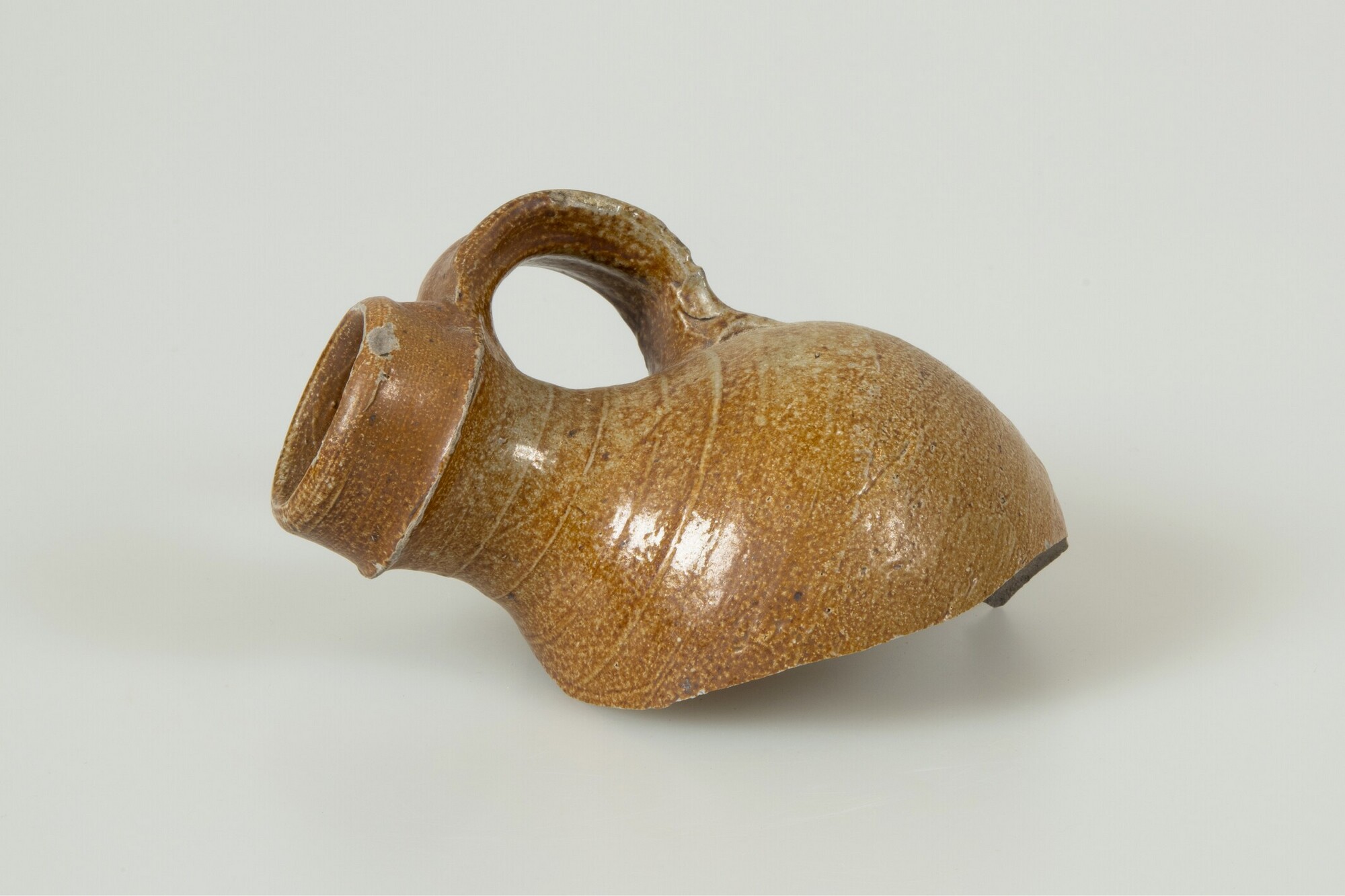 Kan; s2-kan-14; kleine bolle kan met schouder overgaand in hals, kraagrand, standvlak, verticaal lintoor; steengoed met oppervlaktebehandeling: ijzerengobe, zoutglazuur; herkomst: Raeren, Rijnland