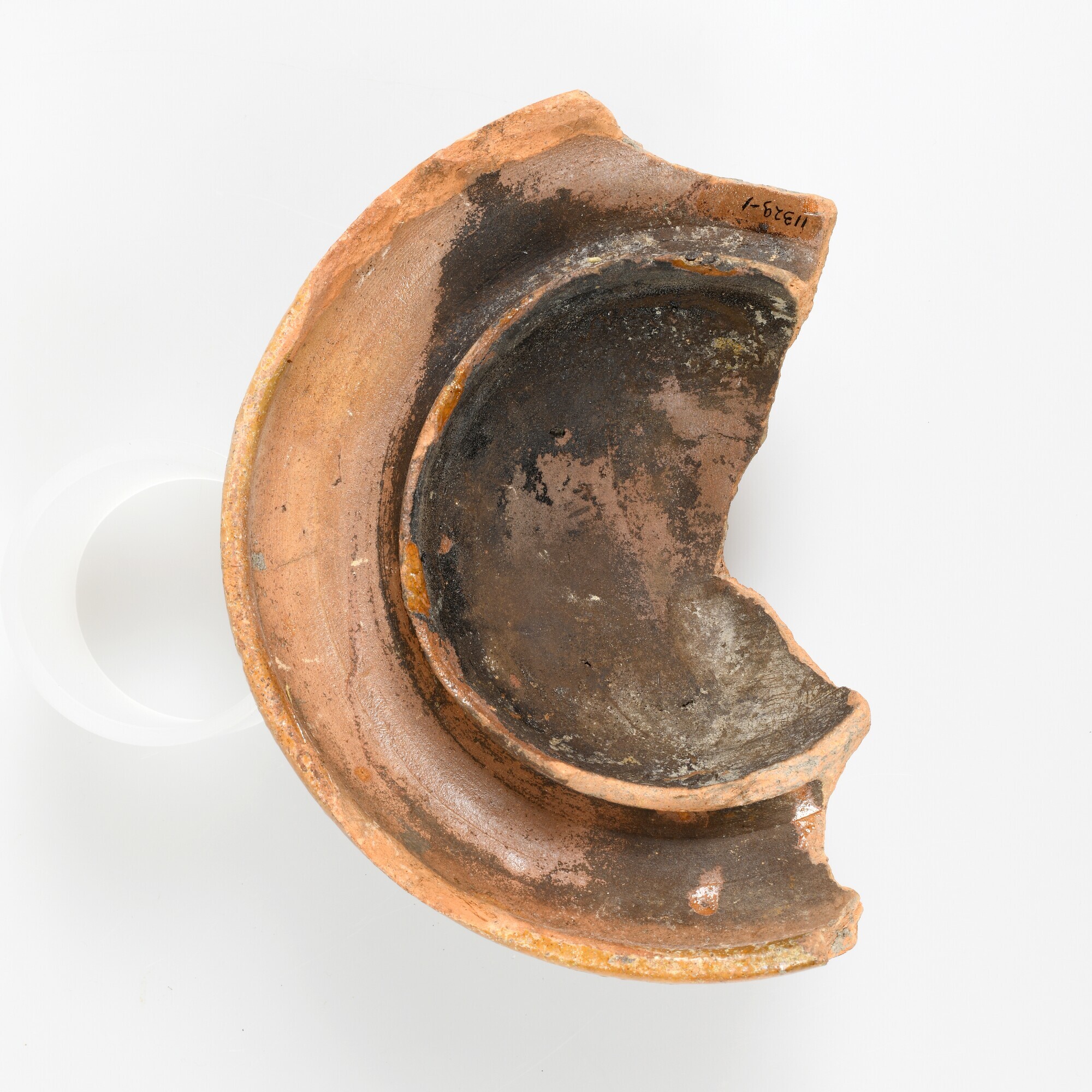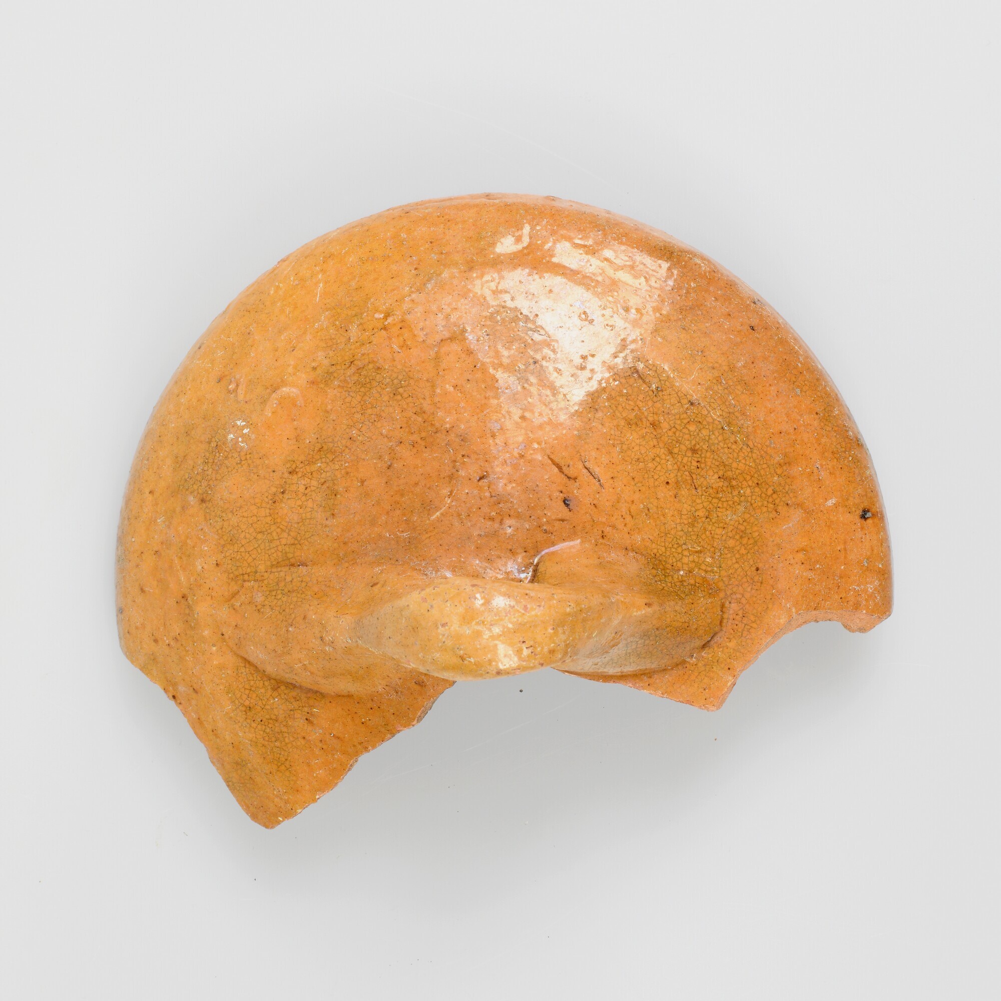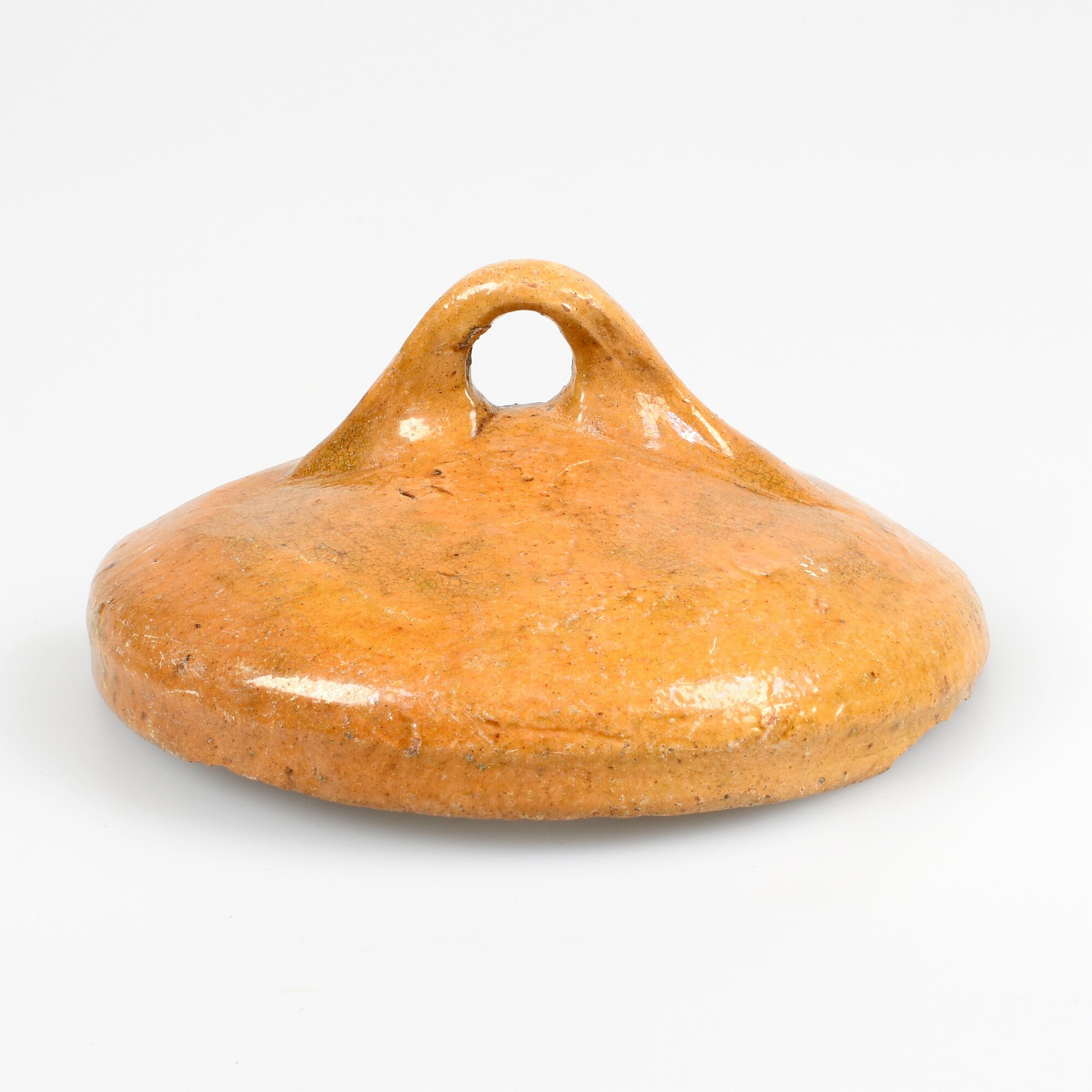 Deksel; r-dek-16; deksel van een doofpot met dubbele sluitrand en worstoor; roodbakkend aardewerk; uitwendig loodglazuur; herkomst: Nederland, Bergen op Zoom?