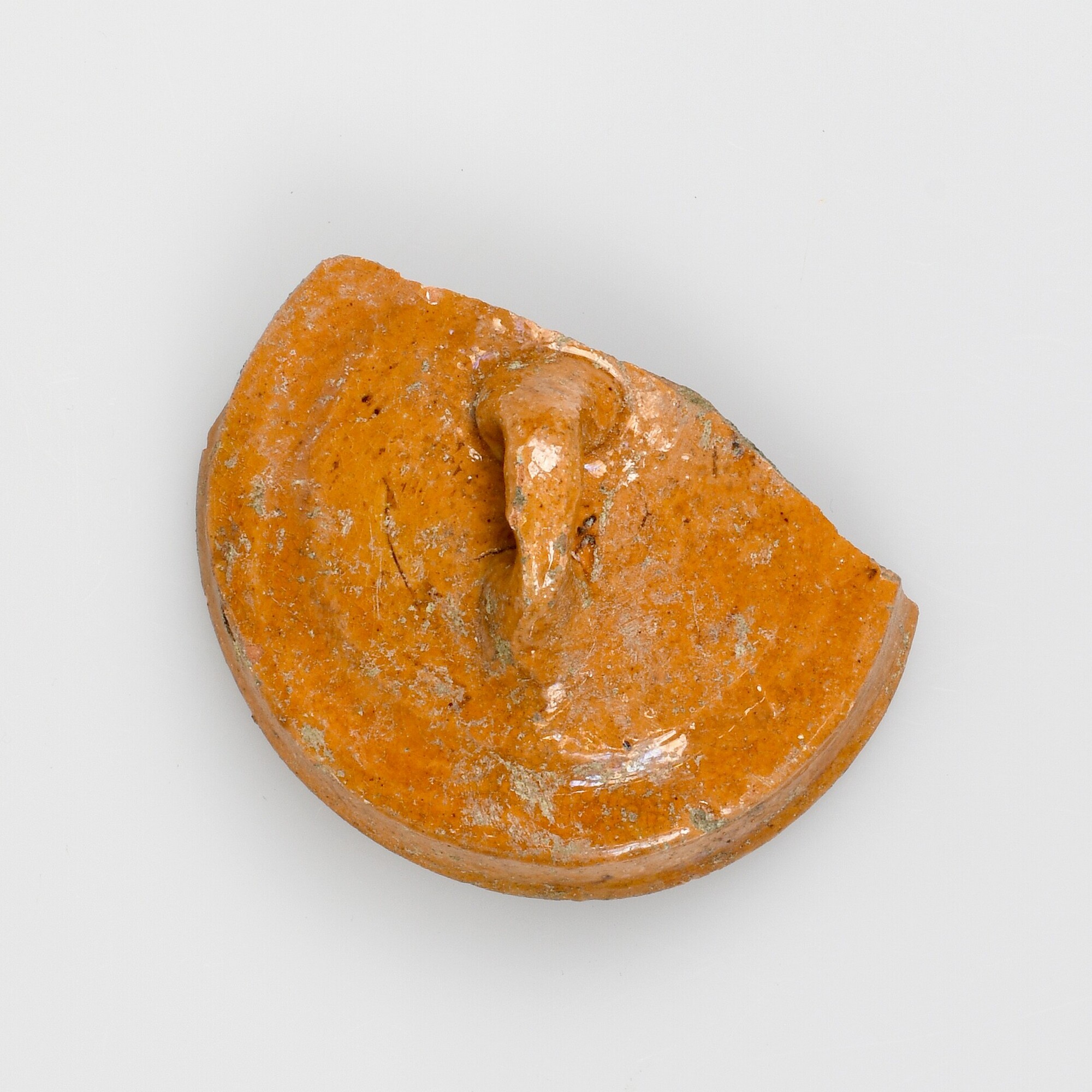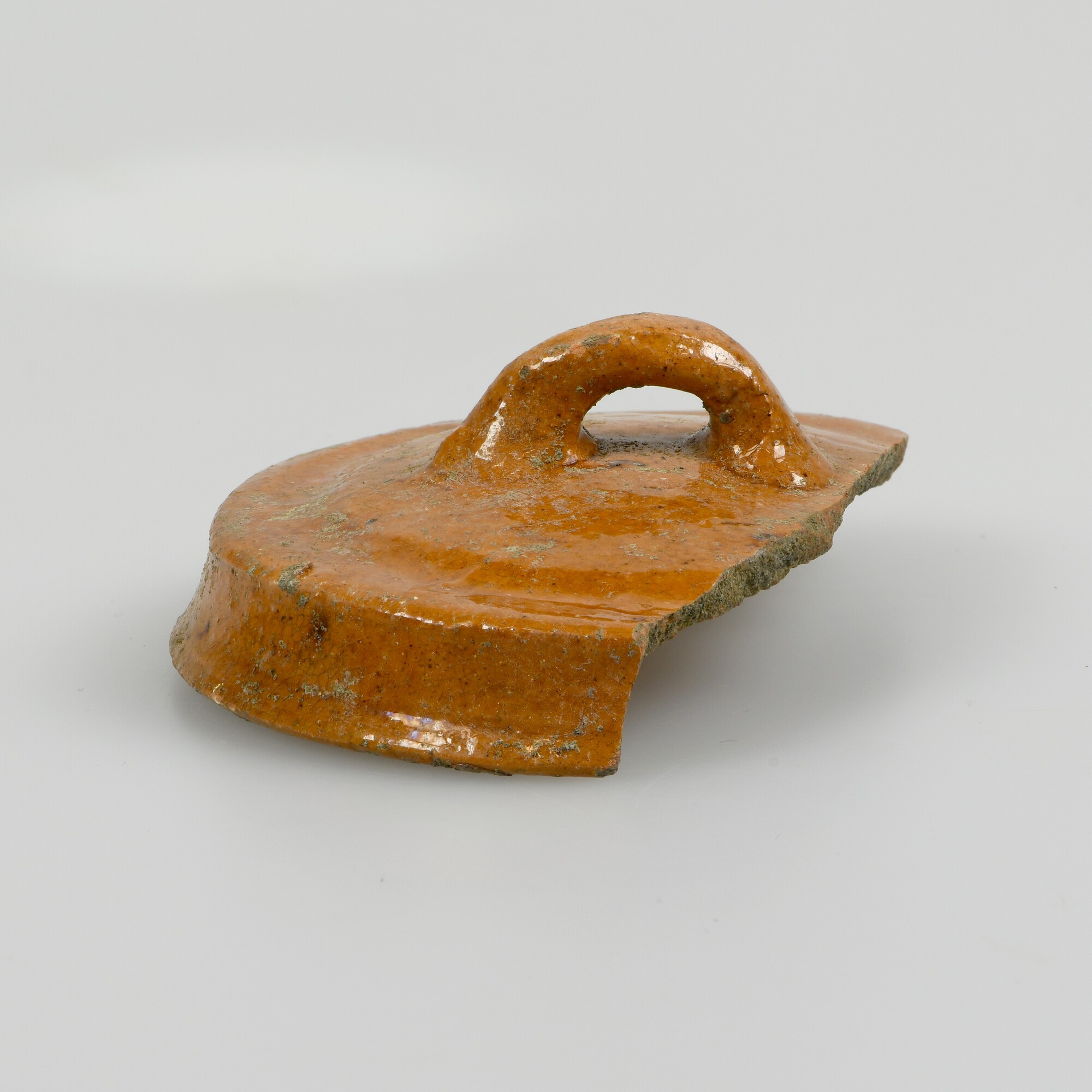 Deksel; speelgoed / miniatuur deksel van een sluitpan; r-dek-14; bol deksel met kaagrand en worstoor; roodbakkend aardewerk; loodglazuur; herkomst: Nederland
