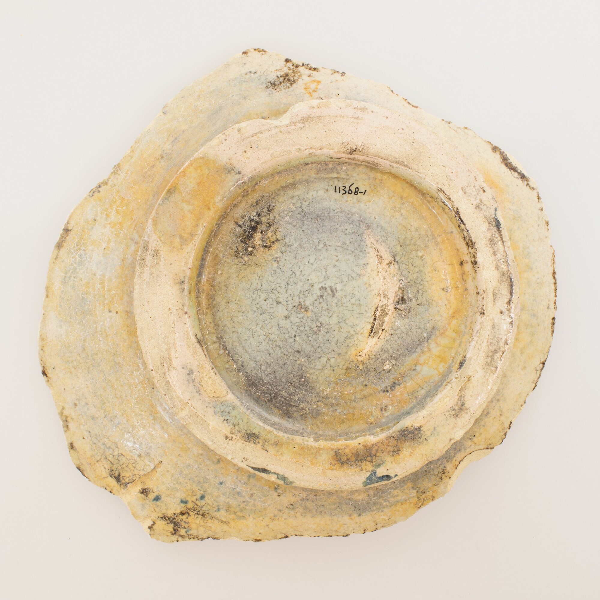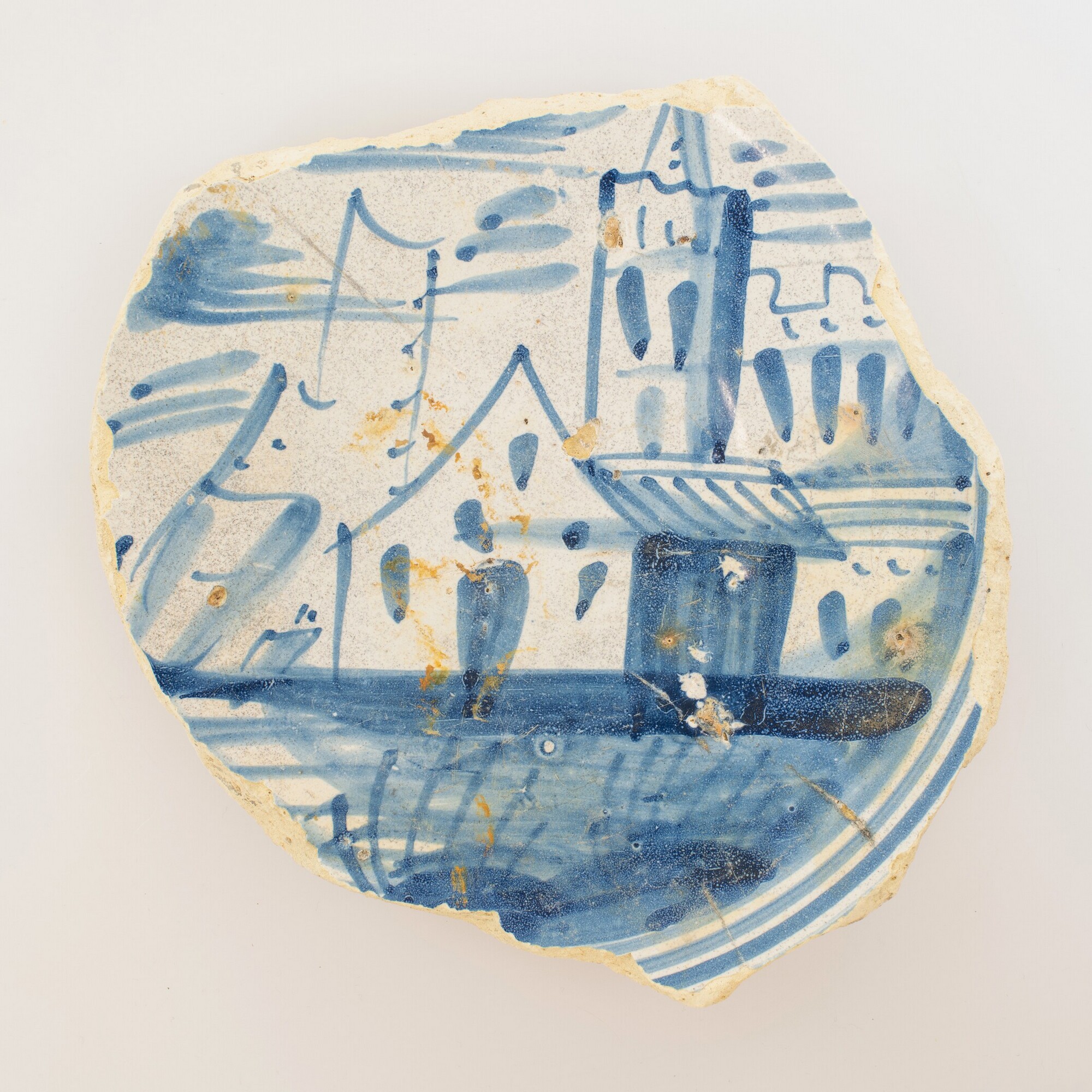 Bord (bodemfragment); m-bor-; standring; majolica; inwendig tinglazuur, uitwendig loodglazuur; blauwe beschildering: spiegel: dorpslandschap met kerk; herkomst: Friesland, vermoedelijk Makkum