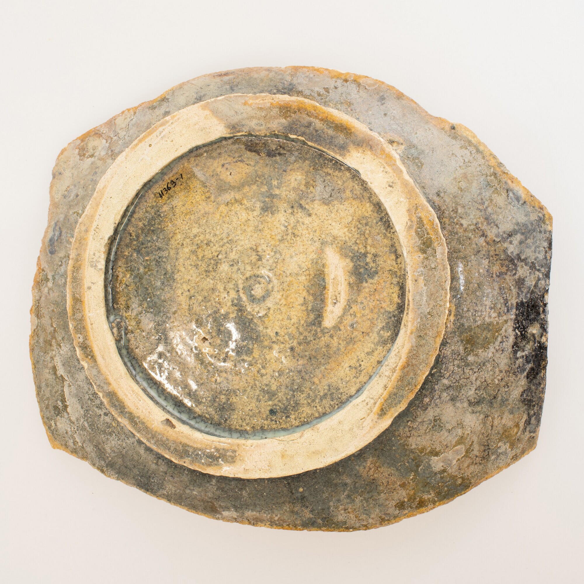 Bord (bodemfragment); m-bor-; standring; majolica; inwendig tinglazuur, uitwendig loodglazuur; blauwe beschildering: spiegel: vogel in struik; herkomst: Makkum, Friesland